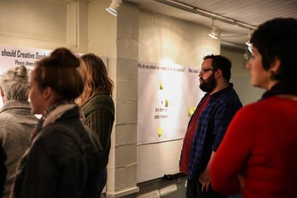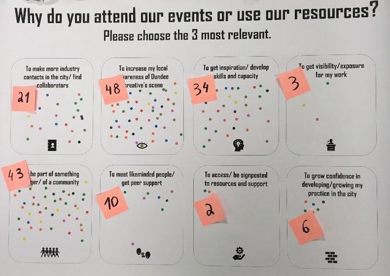 At Make/Share (8th Feb) and Pecha Kucha Night (28th Feb), we asked attendees for feedback on what Creative Dundee currently offers, what we can improve in future, and what support would make people stay and thrive in Dundee. 100 people took part in this Live Audit.