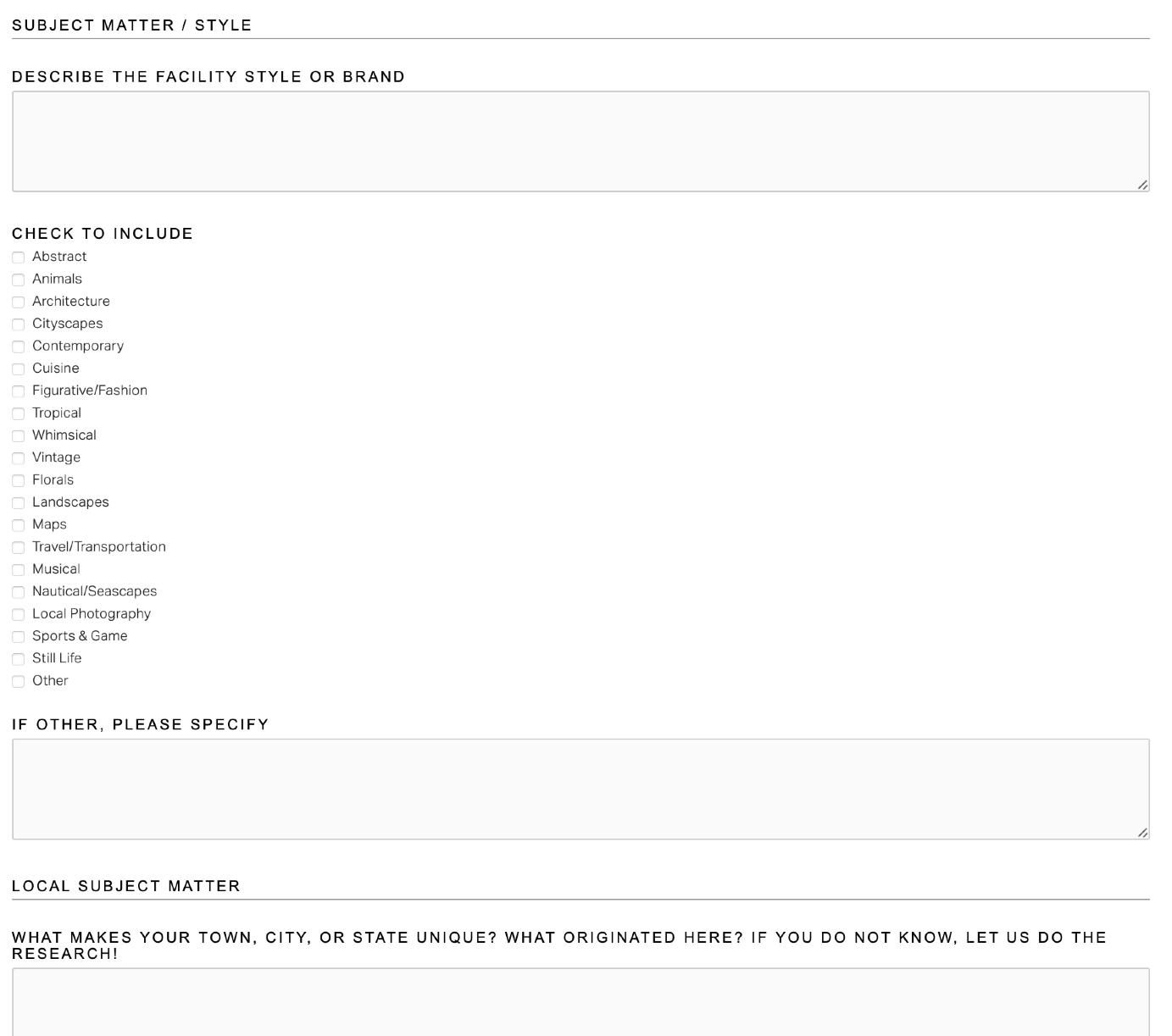 Creative A works with your floor plans and FF&E selections to place artwork. We work in conjunction with your furniture sizes and heights to ensure the right piece of artwork is being specified.