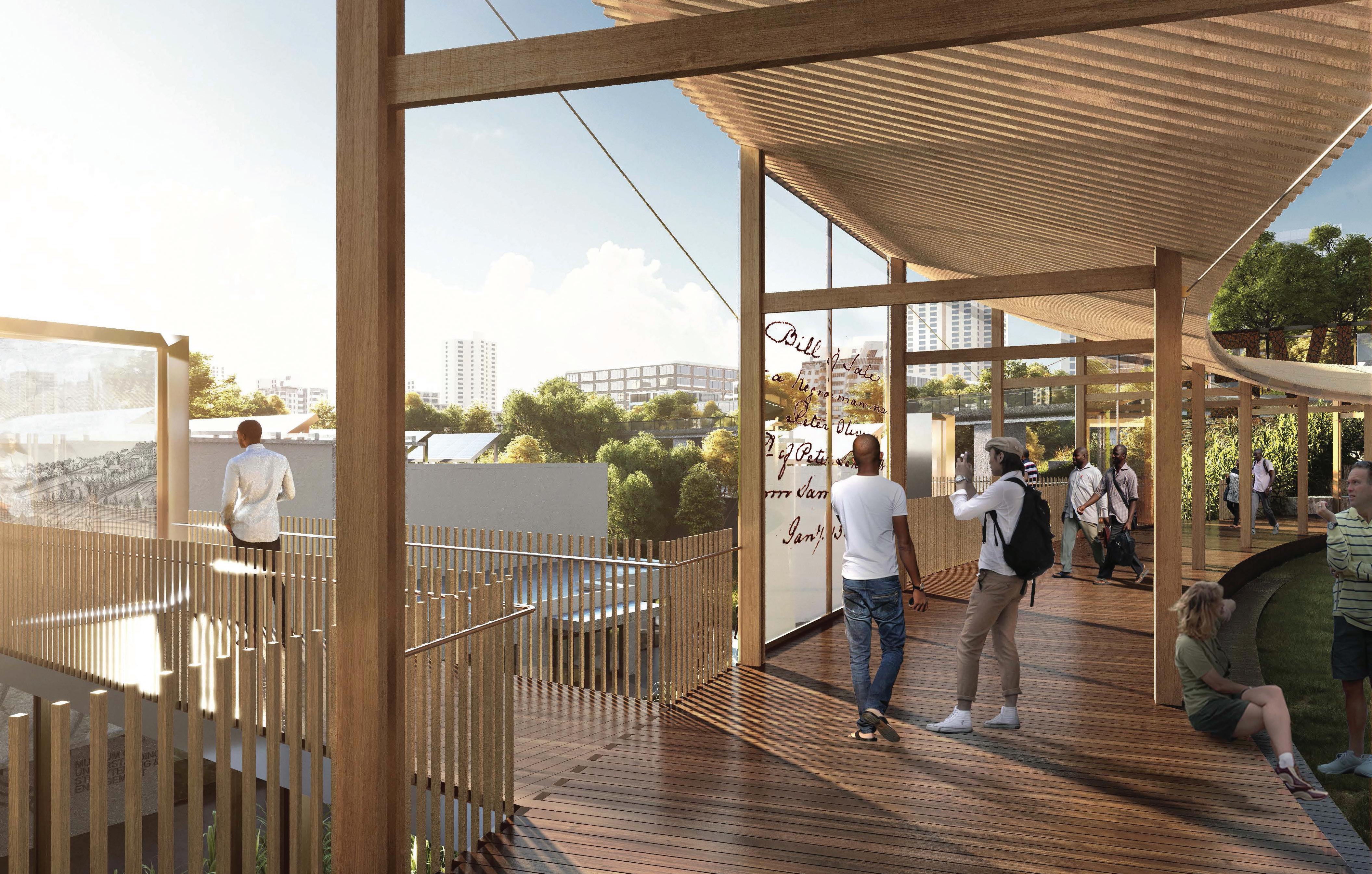 After the Strollway bridge was completed, Creative Corridors invited Walter Hood back to Winston-Salem to begin thinking about the plans for the new park that would be created at the foot of the bridge. Just weeks before Walter arrived, Creative Corridors had connected with new research by Old Salem that discovered Peter Oliver’s homestead was at the very site Hood would be designing. Creative Corridors Coalition board was immediately captivated by the incredible story of Peter Oliver’s life and legacy and began exploring how to commemorate and celebrate it as part of the design for this space in the heart of Winston-Salem. In the years since, the Coalition has worked closely with city, county, and state elected officials and staff on the development of this project and has received overwhelming support. The initial response to the Peter Oliver Pavilion Gallery has been extremely positive on a local, regional and national level—and excitement continues to grow!
