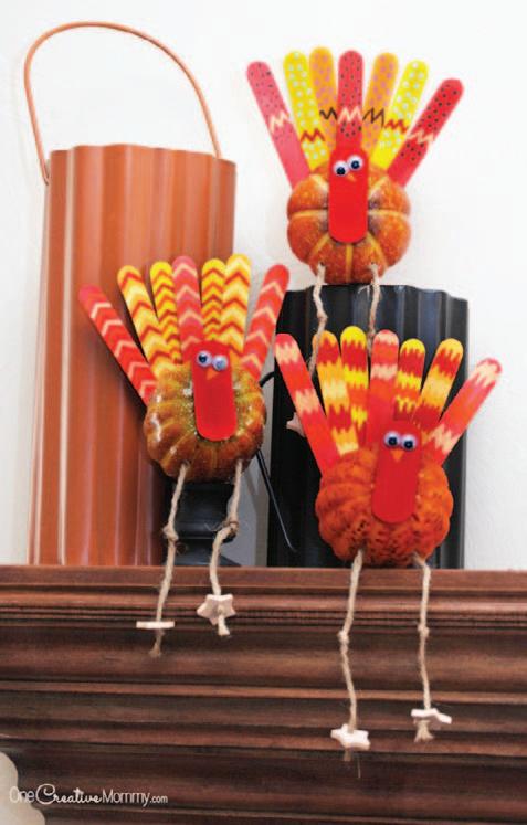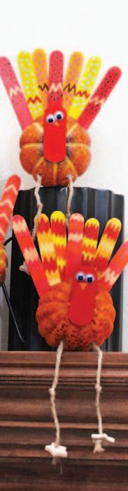 Glue gun and glue • Small foam or plastic craft pumpkins (one for each turkey) •Small wooden stars (three for each turkey) • Jute twine • Colored craft sticks • Dog tag craft sticks Red craft paint • Paint markers • Glue stick • Wiggly eyes Small scraps of orange paper or card stock