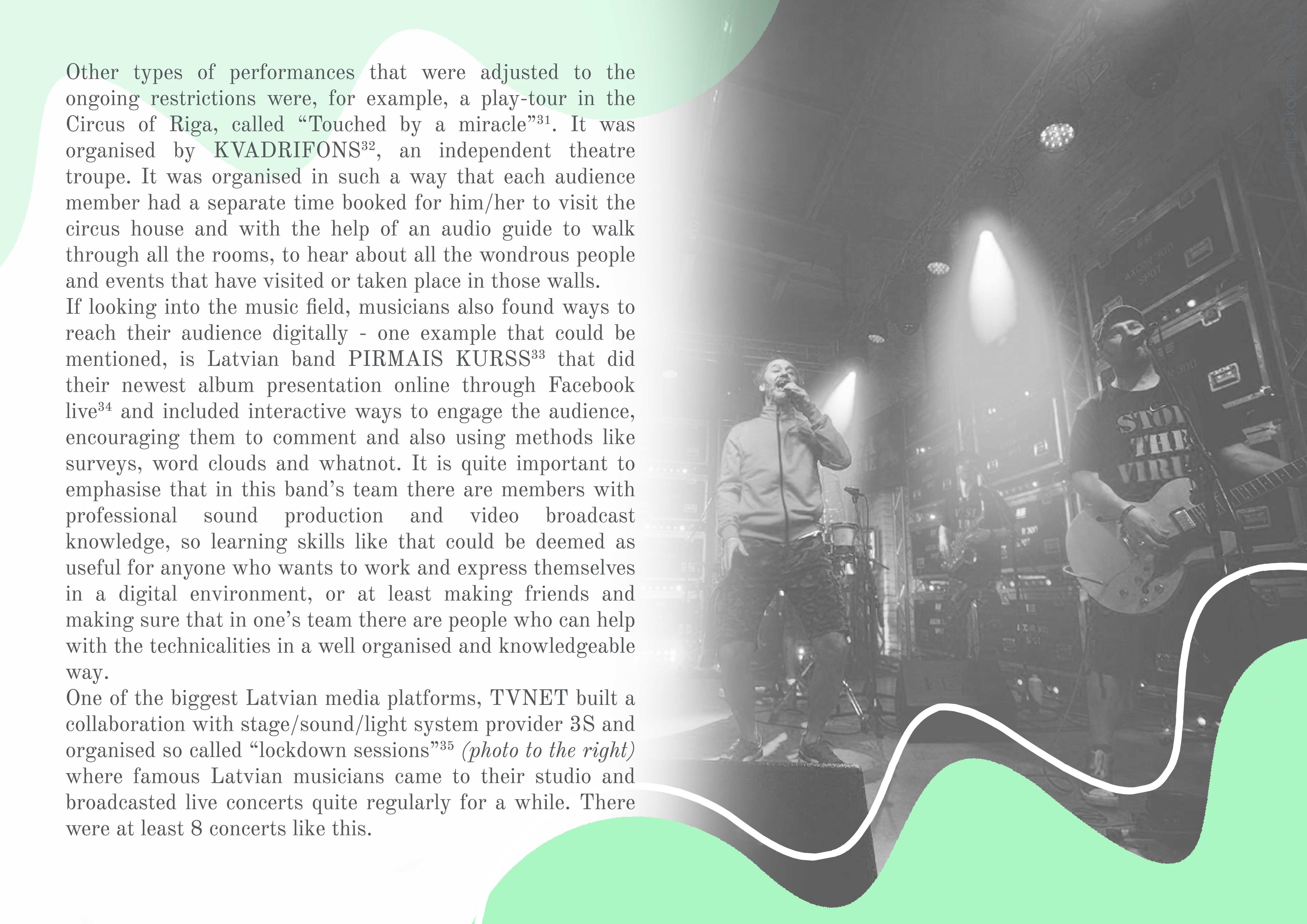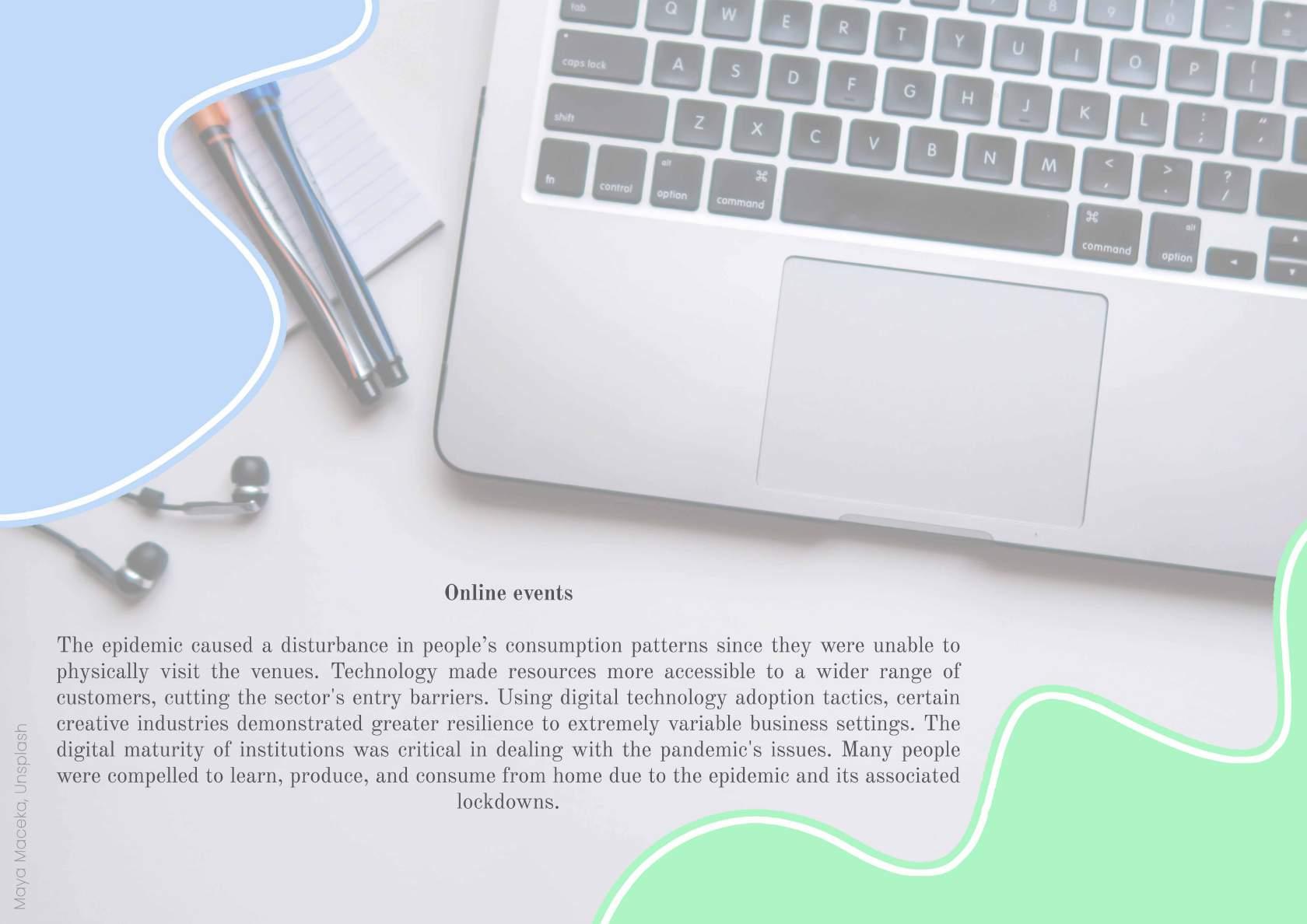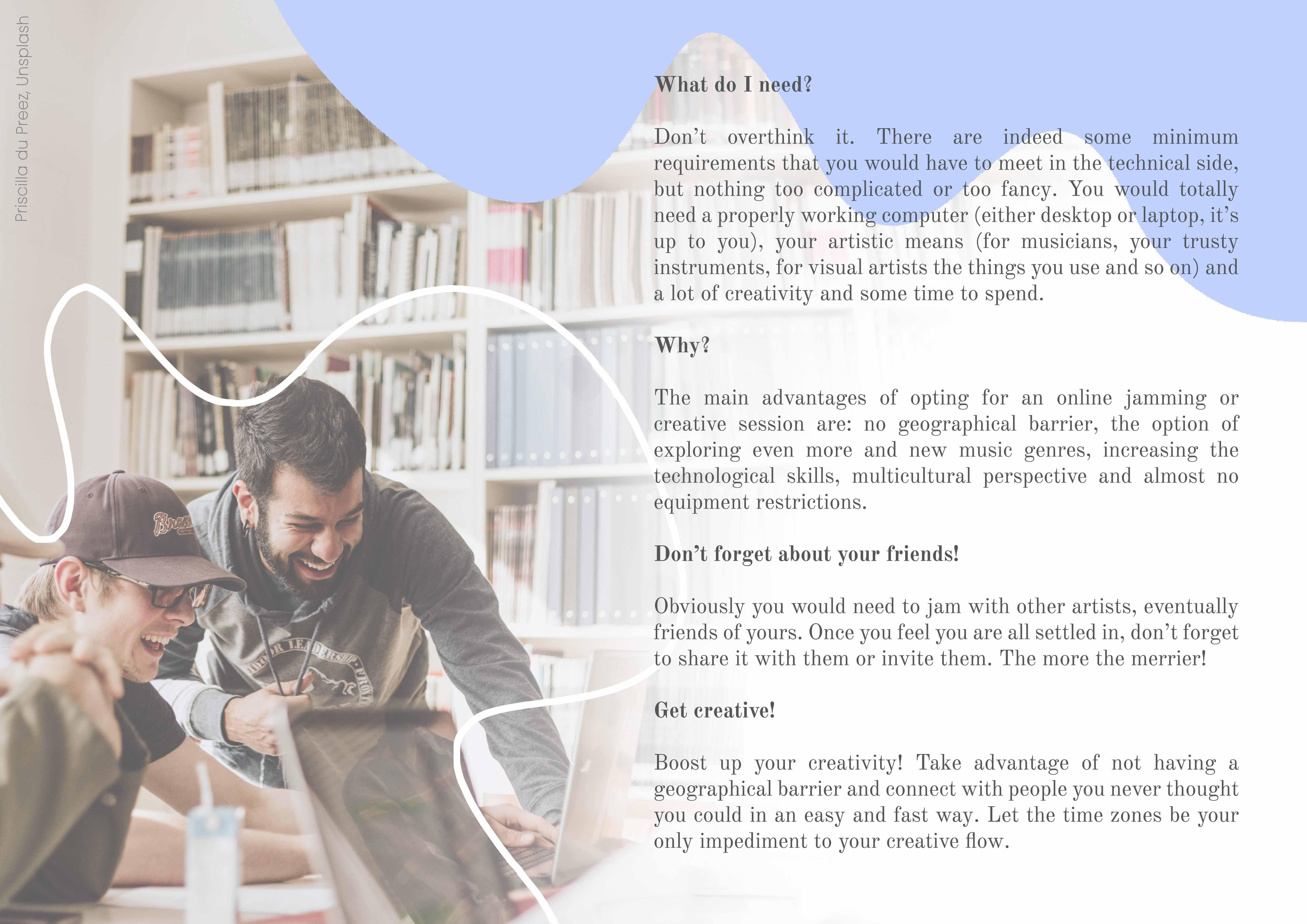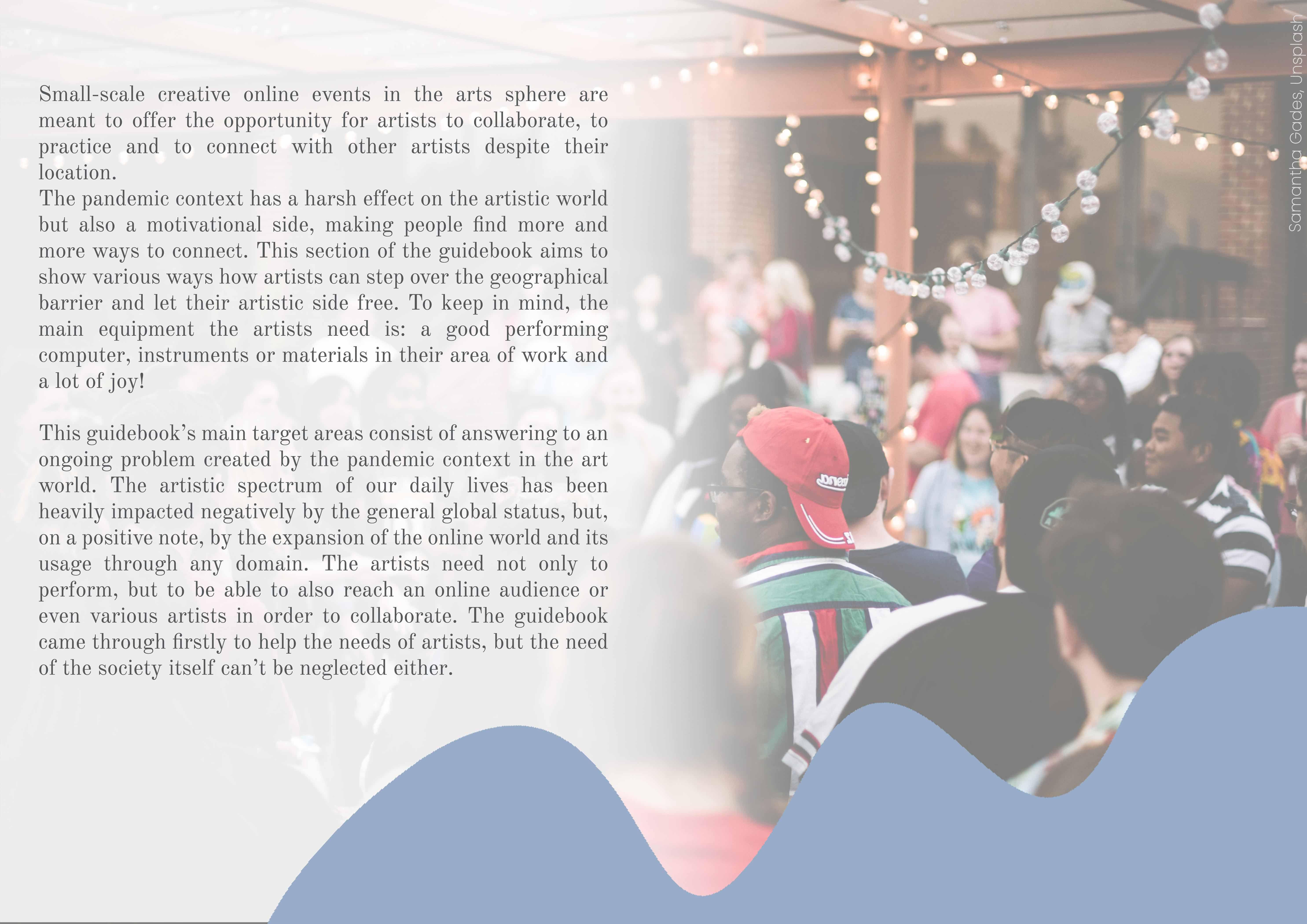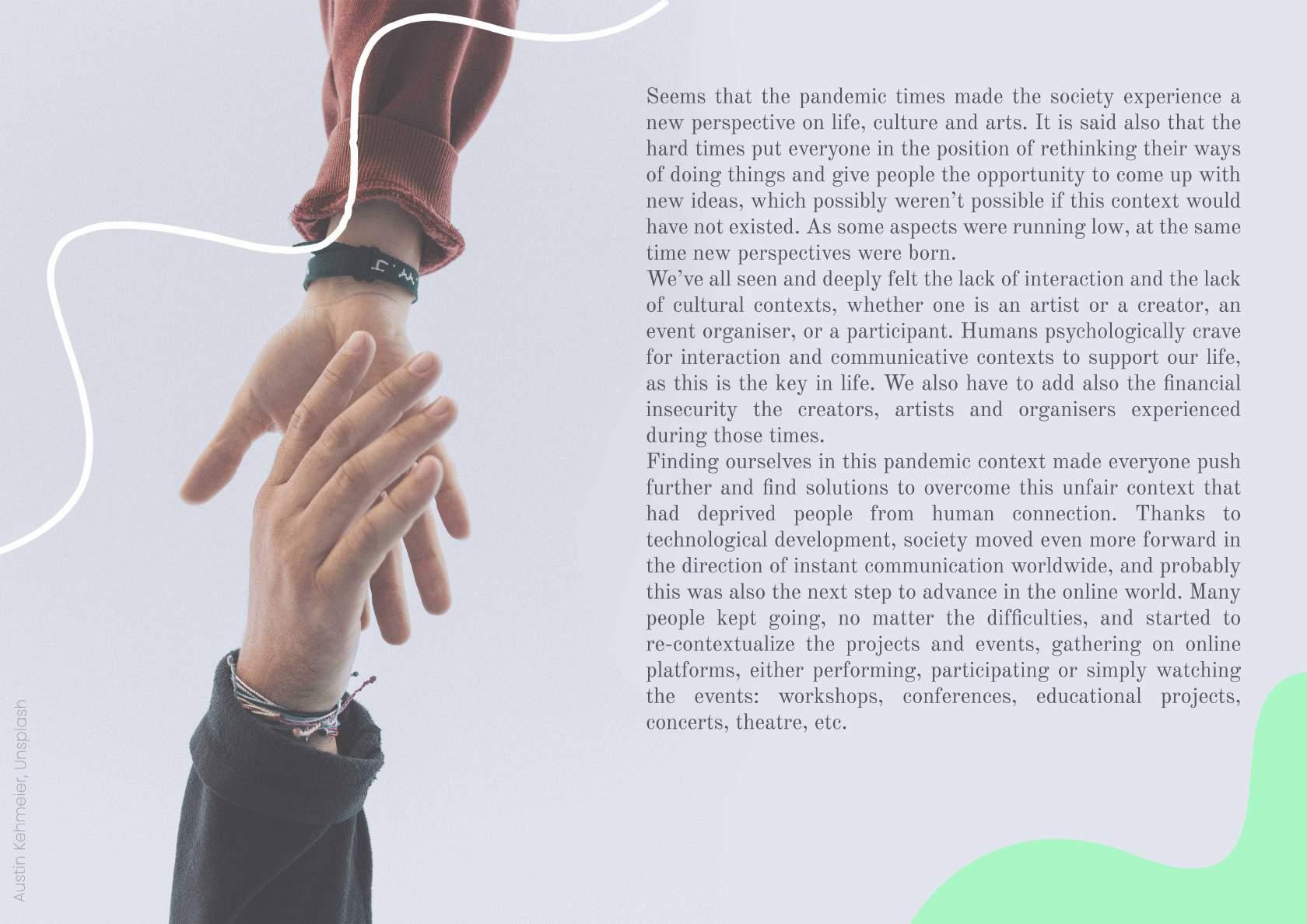 In this material you will be able to gain insights on step-by-step process of making creative webinars, online events and concerts; how to organise small live events in accordance with all the possible restrictions and rules that governments can apply for health reasons; take a peek into some examples of digital and real life events that took place during this challenging period of time in several countries as well as learn some tips on how to promote yourself better.
