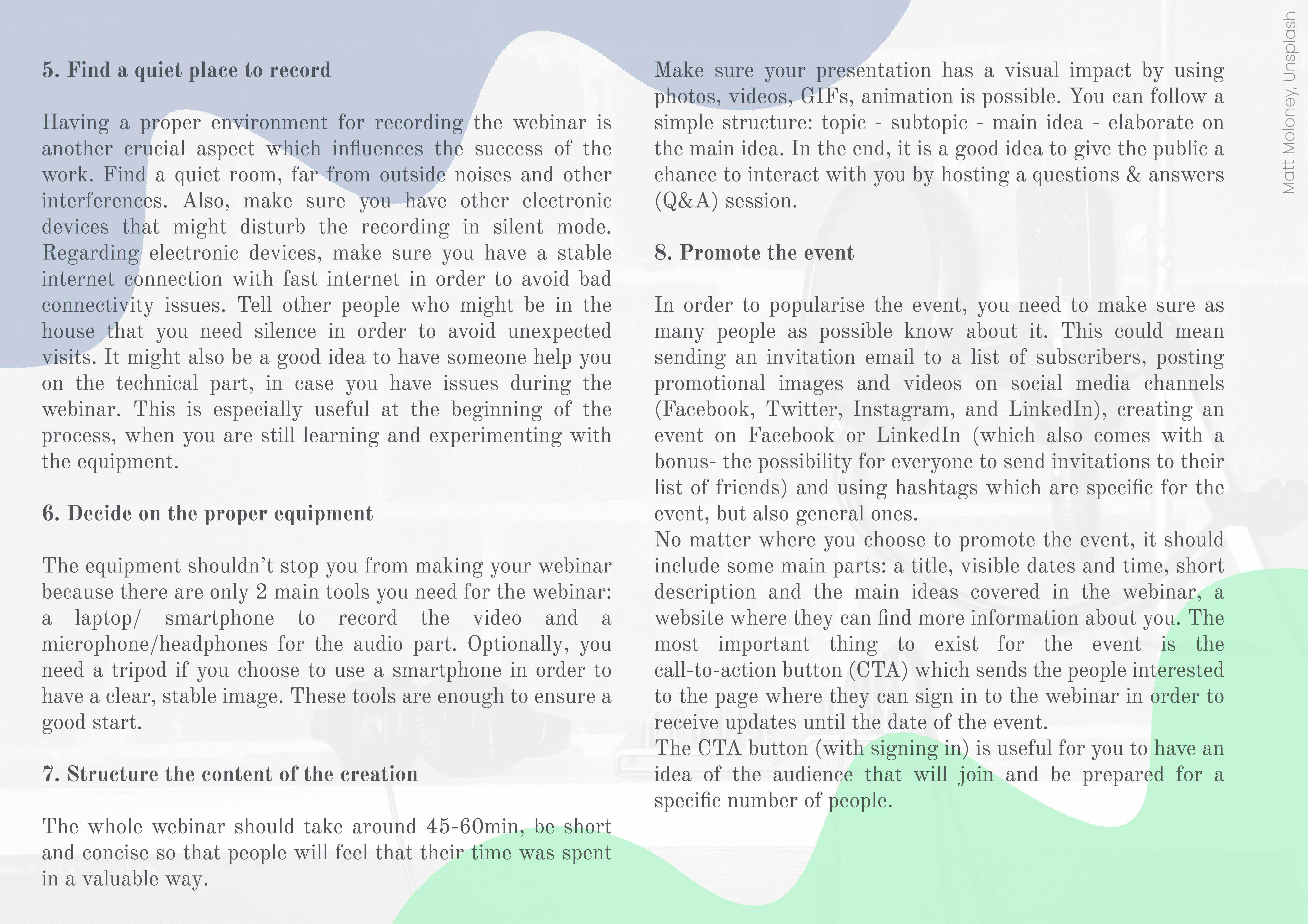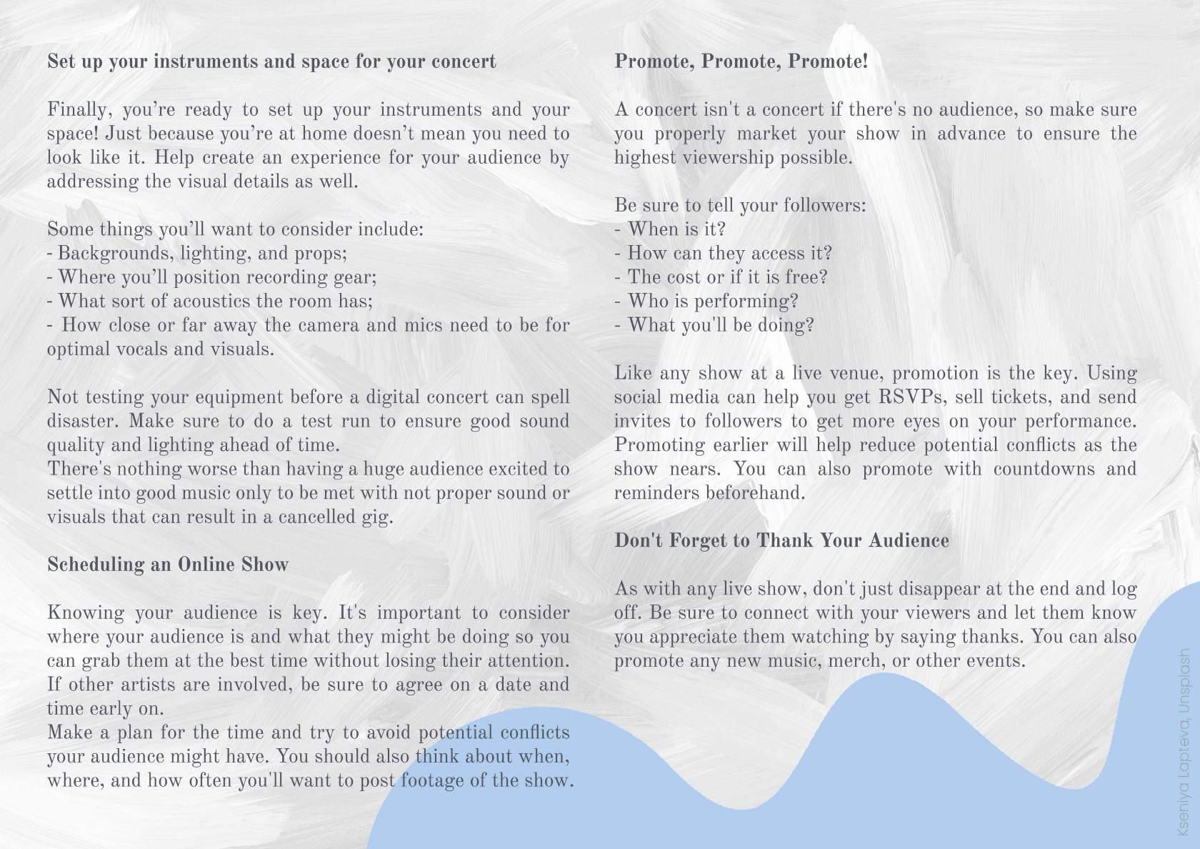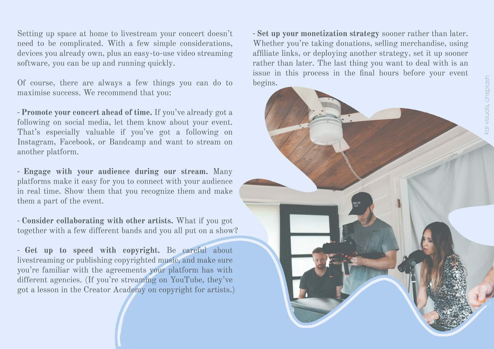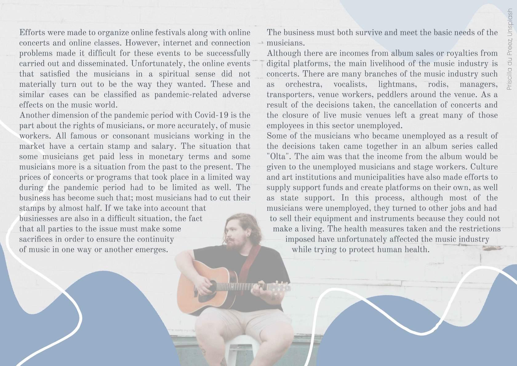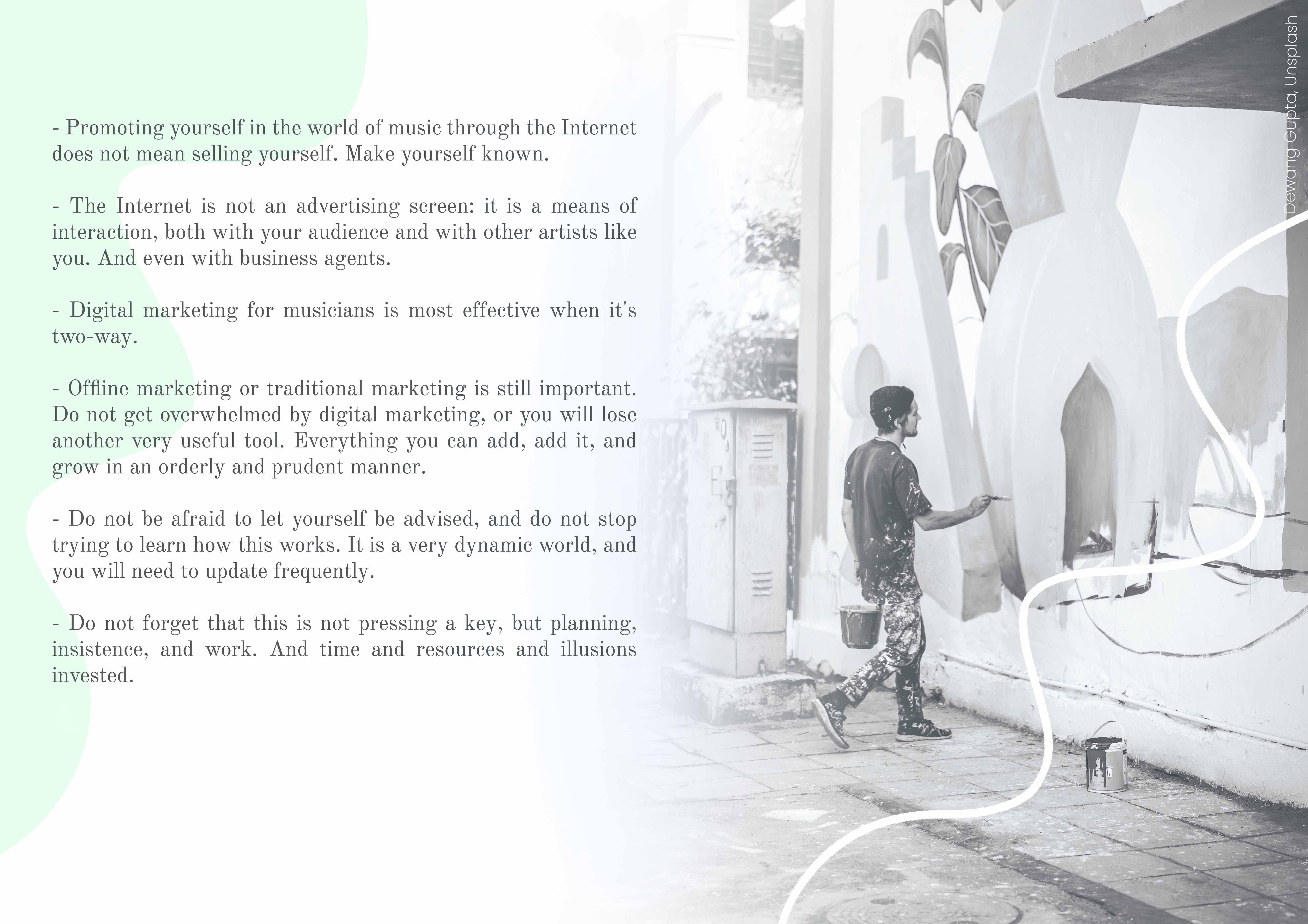 In this material you will be able to gain insights on step-by-step process of making creative webinars, online events and concerts; how to organise small live events in accordance with all the possible restrictions and rules that governments can apply for health reasons; take a peek into some examples of digital and real life events that took place during this challenging period of time in several countries as well as learn some tips on how to promote yourself better.