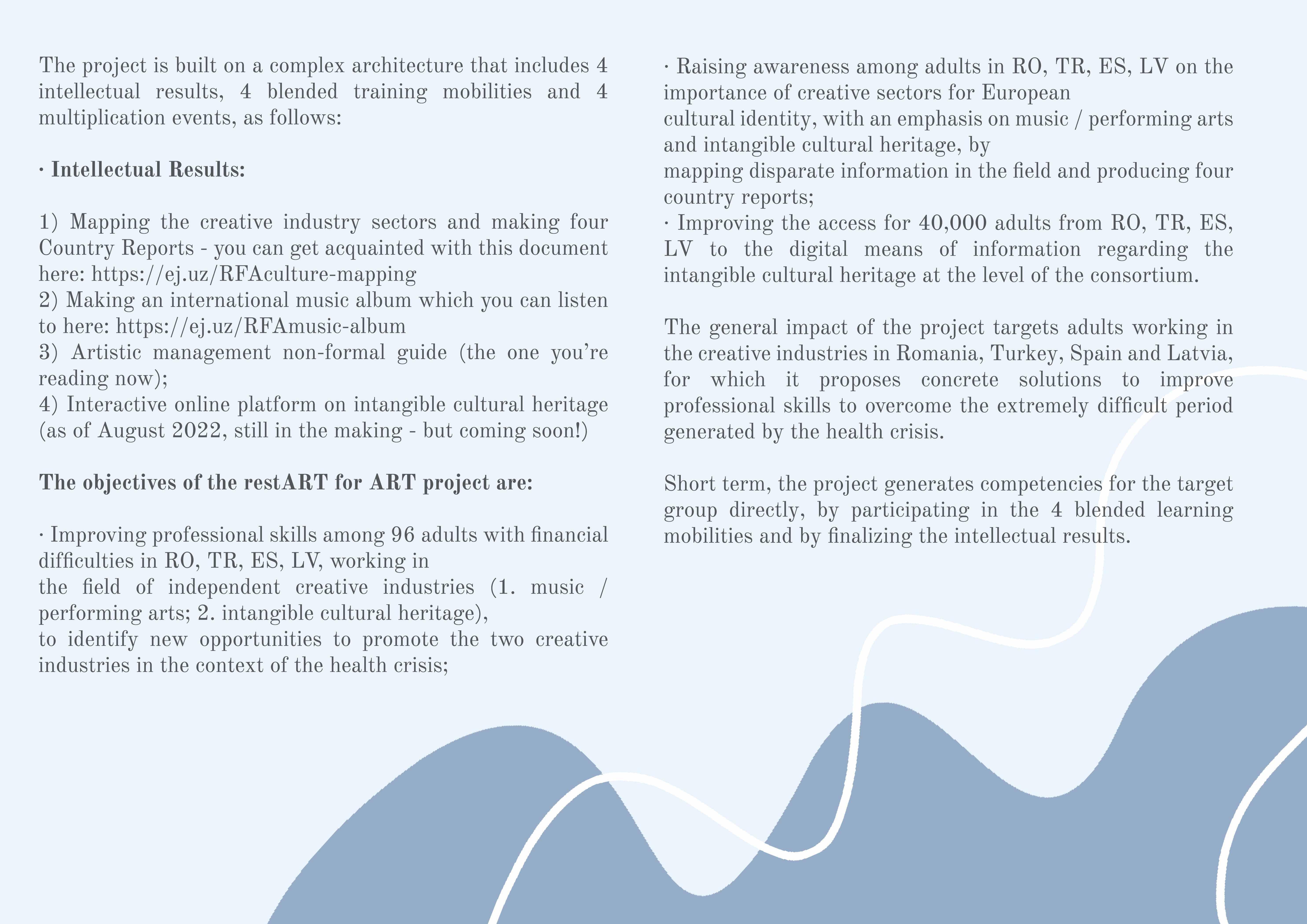 Project “restART for ART” was created under the Erasmus+ Creative Europe programme to help artists renew their creative processes and gain new contacts as well as skills and knowledge in order to be able to continue better, smarter and more creatively.