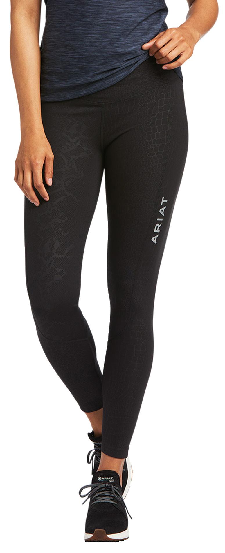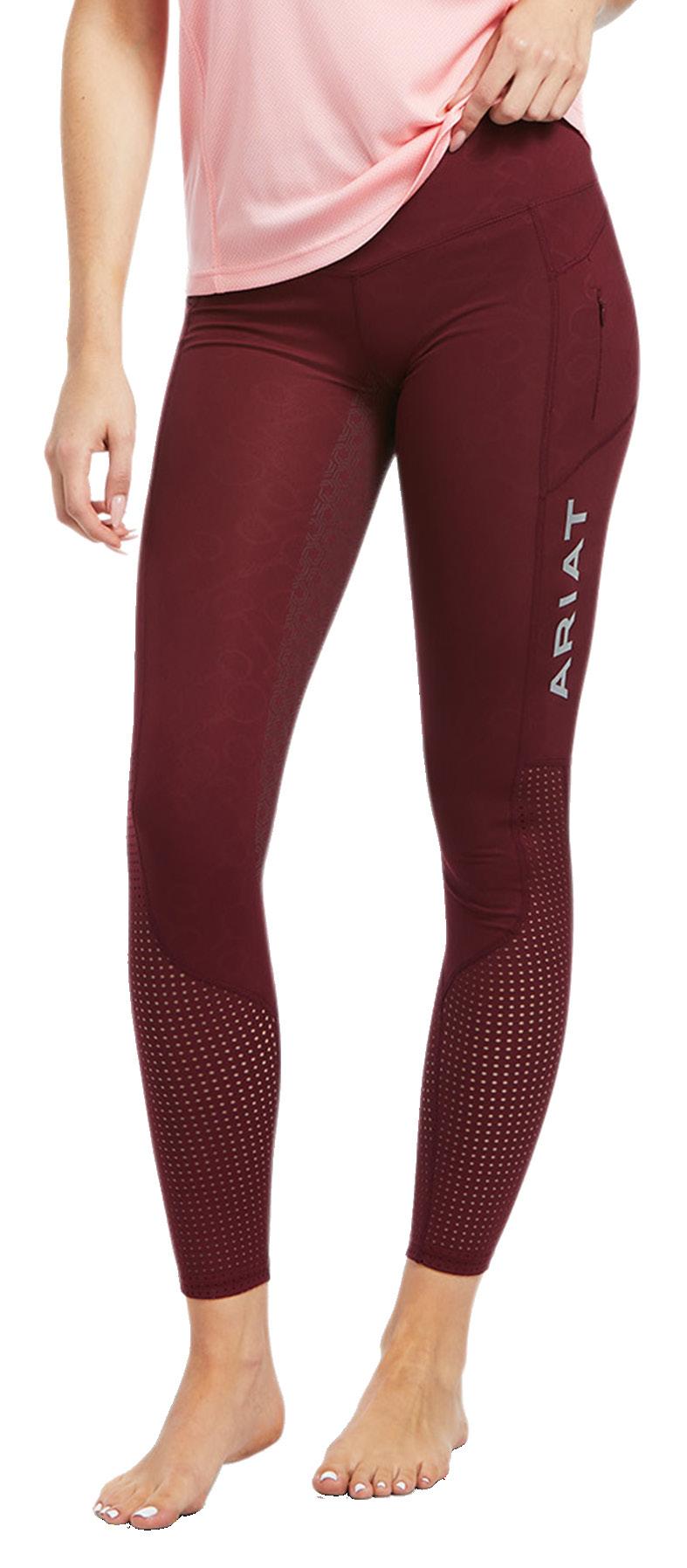 Full Seat Tight Recycled polyester/ spandex blend, compressive fabrication, jacquard paneling, flattering and supportive wide waistband, Ariat Hex Silicone Grip full seat, Pockets both thighs and centre back waist, perforated leg panels for breathability.