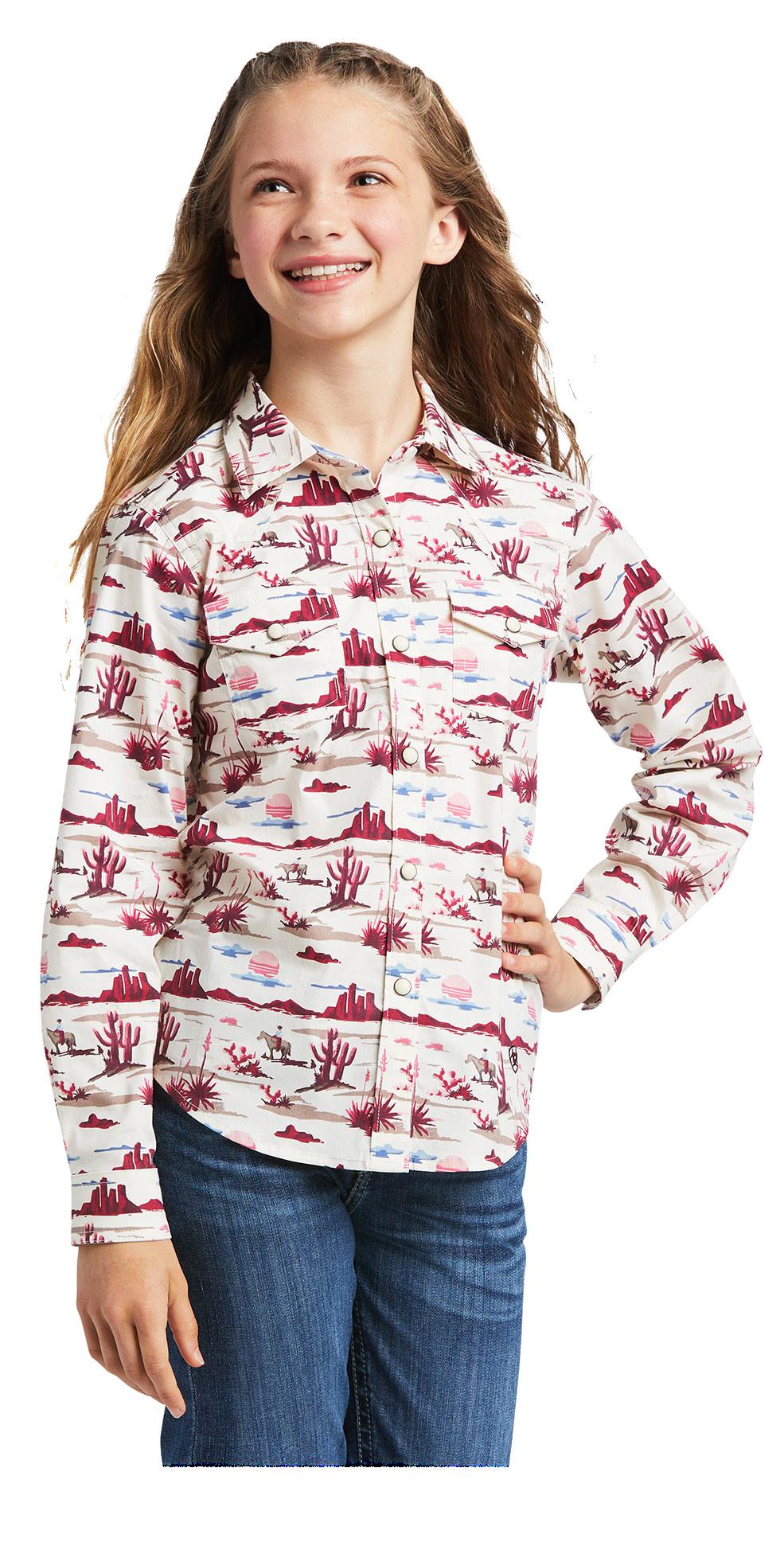 Girls REAL Yuma Long Sleeve Shirt Printed poplin, novelty snaps. Yuma Landscape Print. Sizes XS - XXL $79.95 EACH Ariat Youth Aptos Vent Short Sleeve Show Shirt Recycled polyester/ spandex blend pique, built in stretch, vent structure for maximum breathability, show
