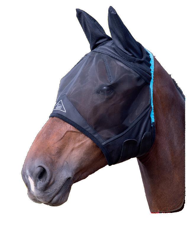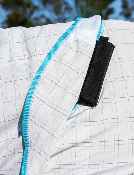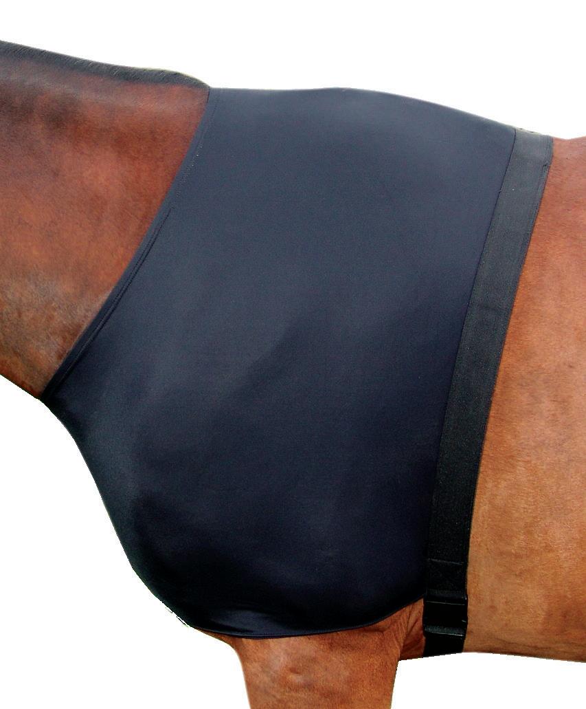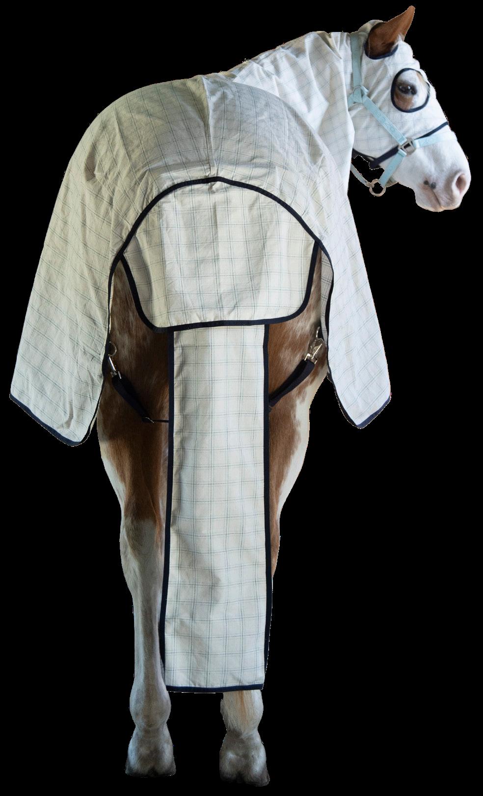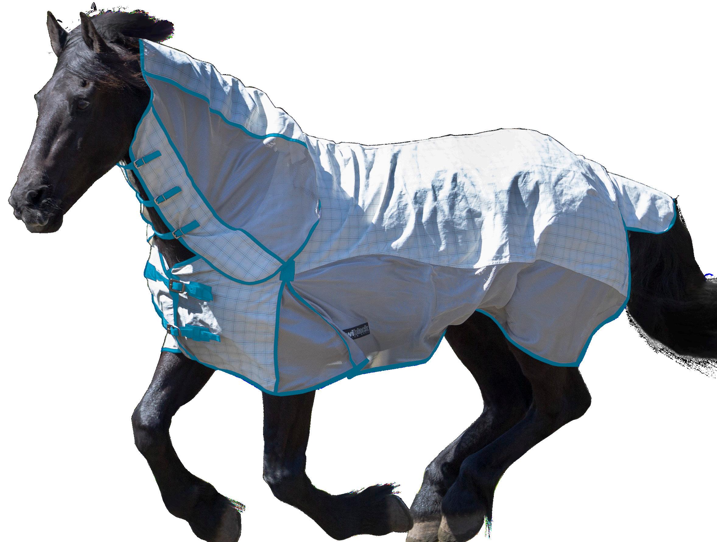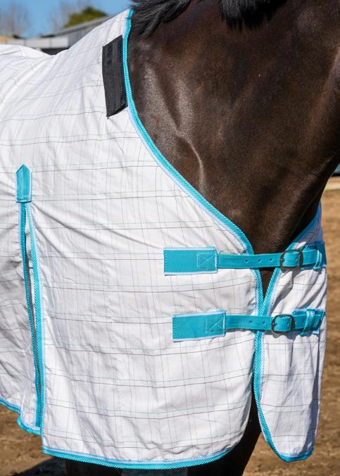 flies. The mesh panels at the side allow more airflow to keep your horse cooler. Complete with sating lining in the shoulders, Velcro with double front straps, shoulder gussets, removable leg straps and tail flap. Sizes 24” to 39”