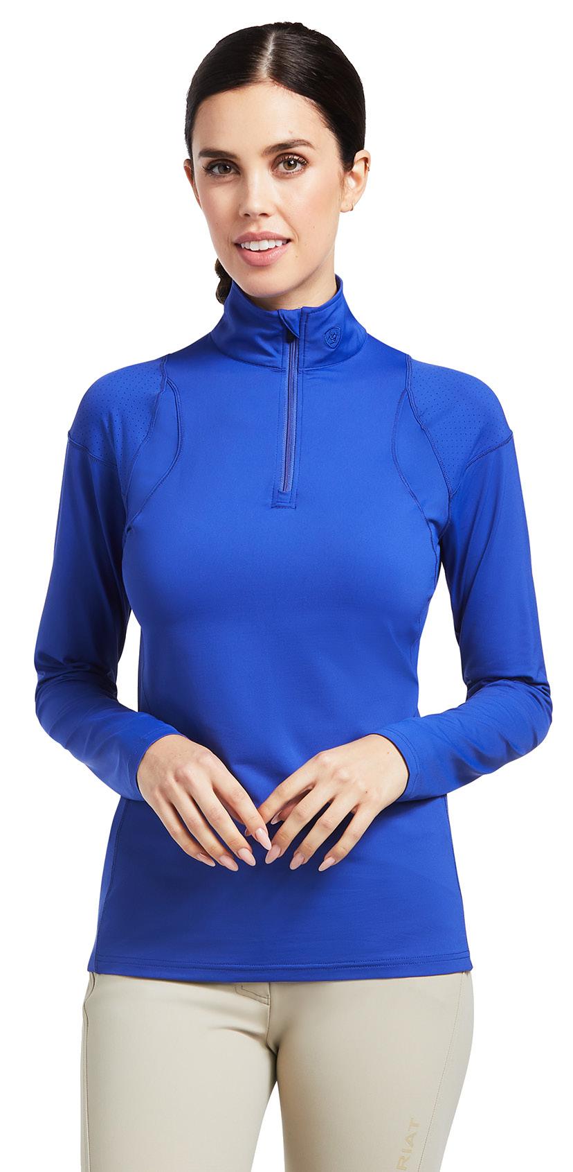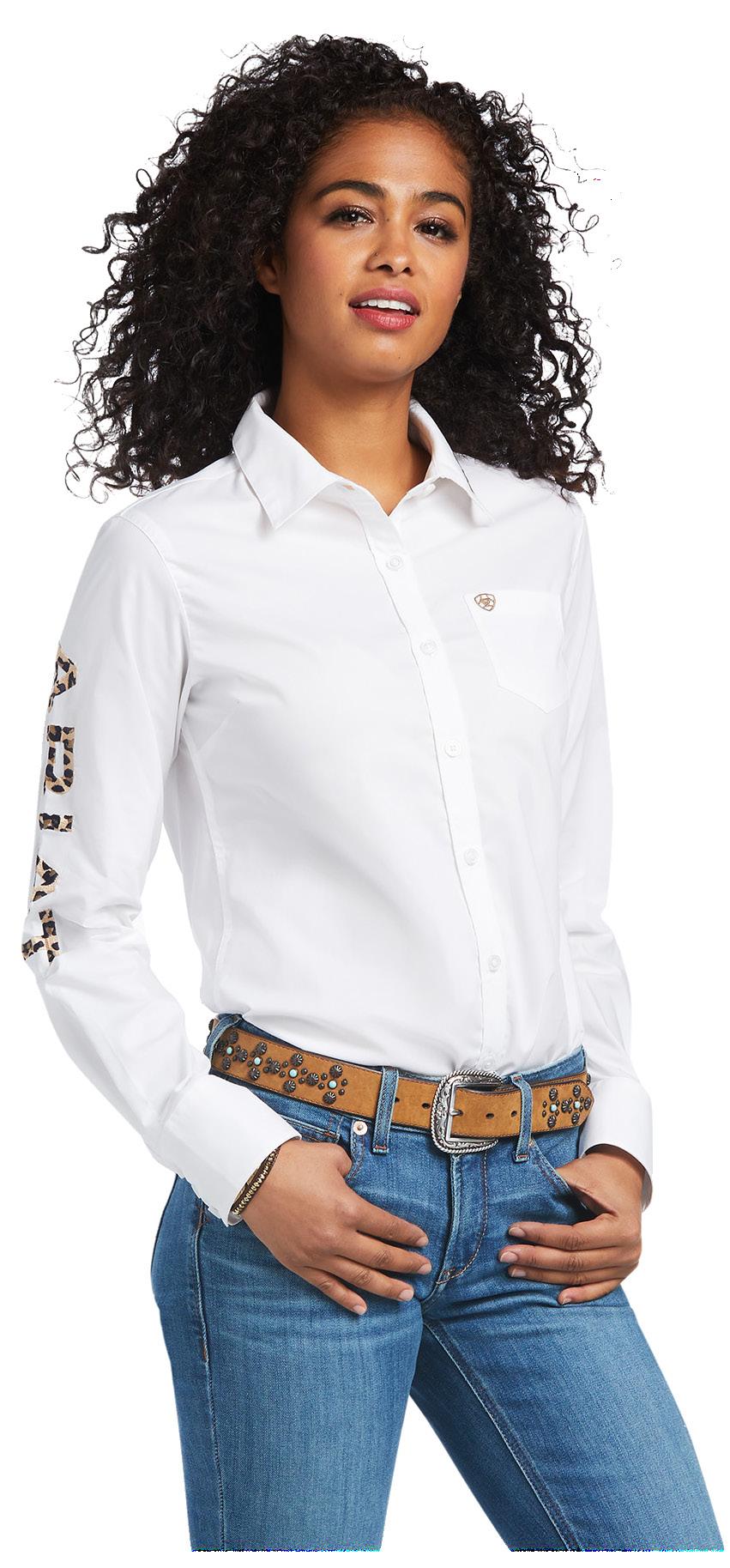 $69.99 EACH Ariat Womens REAL Ariat Boot Co. Tee Mineral washed super soft jersey, screen print front. Charcoal Mineral Wash. Sizes XS - XXL $64.99 EACH Ariat Womens Vertical Logo T-Shirt Organic cotton jersey, vertical logo graphic. Heather Grey. Sizes XS - XXL $119.99 EACH Ariat Womens Team Kirby Stretch Long Sleeve Shirt 50s Poplin w/3% spandex, single chest pocket, taped placket and neck seam. White/Leopard. Sizes XS - XXL $119.99 EACH Ariat Womens Showstopper Short Sleeve Show Shirt Show Performance jacquard construction, moisture wicking, ClimateTEK regulation, Poplin show collar, extended rhinestone button placket. Show Navy. Sizes XS - XL $139.99 EACH Ariat Womens Auburn 1/4 Zip Long Sleeve Baselayer ¼ zip w/mock neck, flattering raglan styling, perforated panels for breathability, climateTEK cooling technology, wicking, freshTEK odor resistance, UPF 50+. Mazarine Blue. Sizes XS - XXL