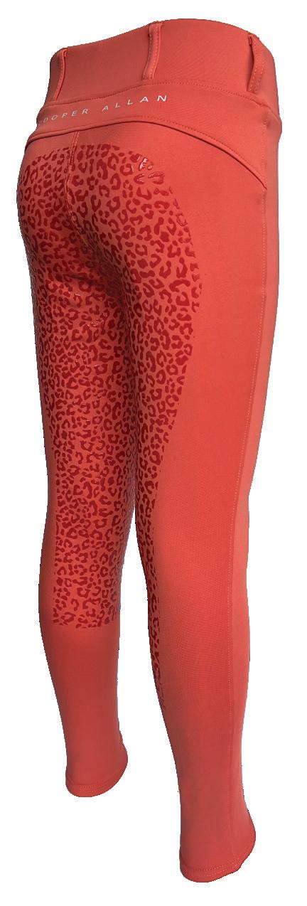 Cooper Allan Kids Ruby Pull on Tights with full seat gel grip in animal print. Cooper Allan logo on the back and belt loops. Coral.