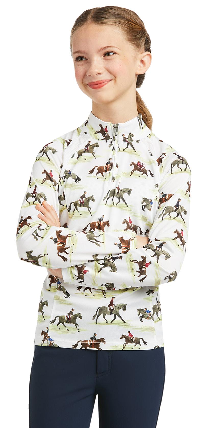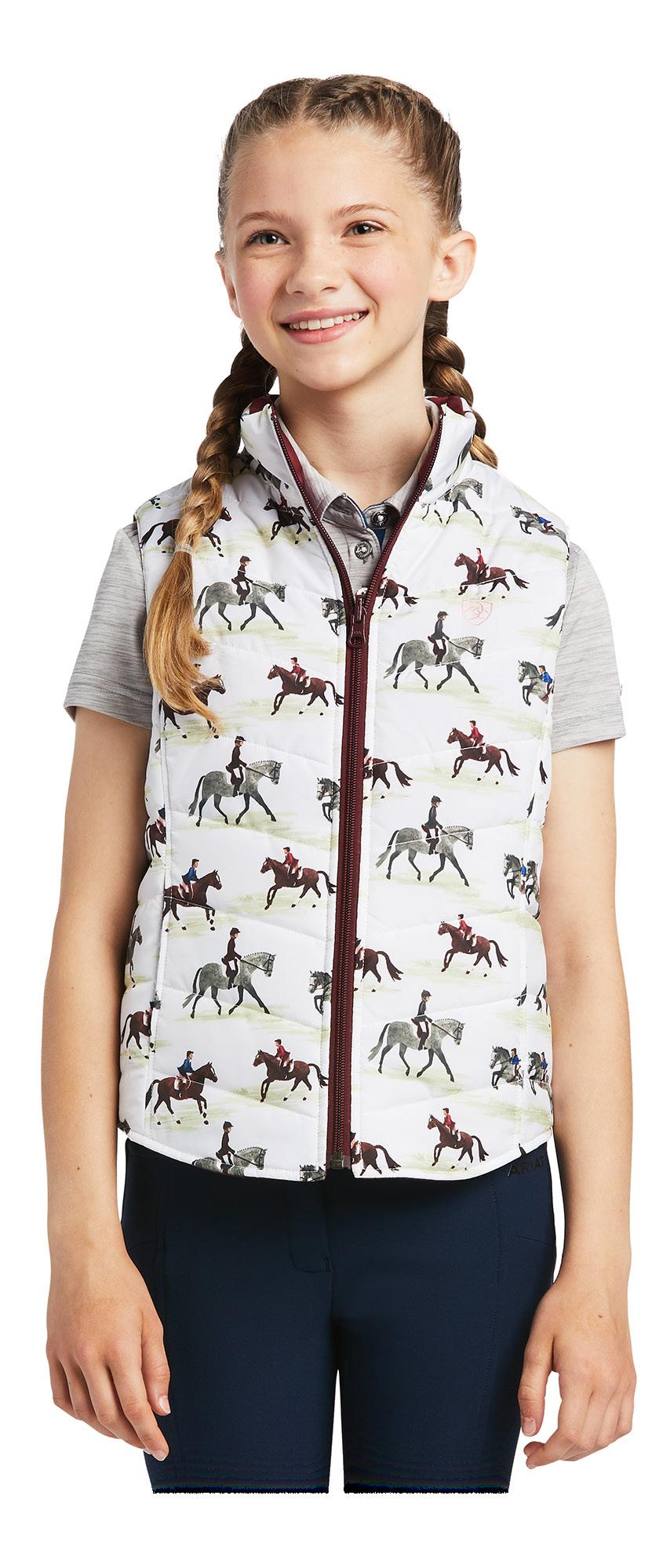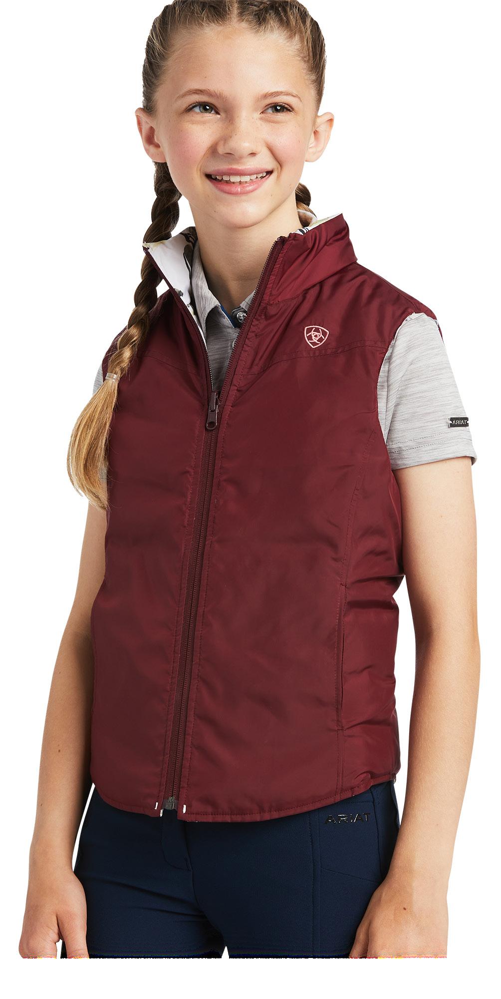 and placket with snap closures, stock tie loop, ClimateTEK cooling technology, FreshTEK odor resistance UPF 50. Antique Rubia. Sizes XS - XXL $89.95 EACH $119.99 EACH Ariat Youth Bella Reversible Insulated Vest Print reverses to solid, 100gsm recycled polyester cool climate insulation, stand collar, hand pockets both sizes. Good Show/ Zinfandel. Sizes XS - XXL Ariat Youth Sunstopper 2.0 1/4 Zip Baselayer Lightweight recycled polyester/spandex blend pique knit, mock collar w/1/4 zip styling, breathable mesh paneling, UPF 50+, ClimateTEK cooling technology, FreshTEK odor resistance. Good Show Print. Sizes XS - XXL $89.95 EACH