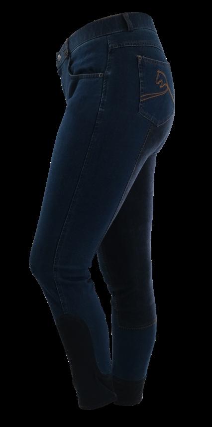 The Atlanta denim breech boasts gel grip for extra stickability in the saddle and 4 pockets with white contrast stitching and detailing. 85% Polyester and 15% Spandex. Navy.