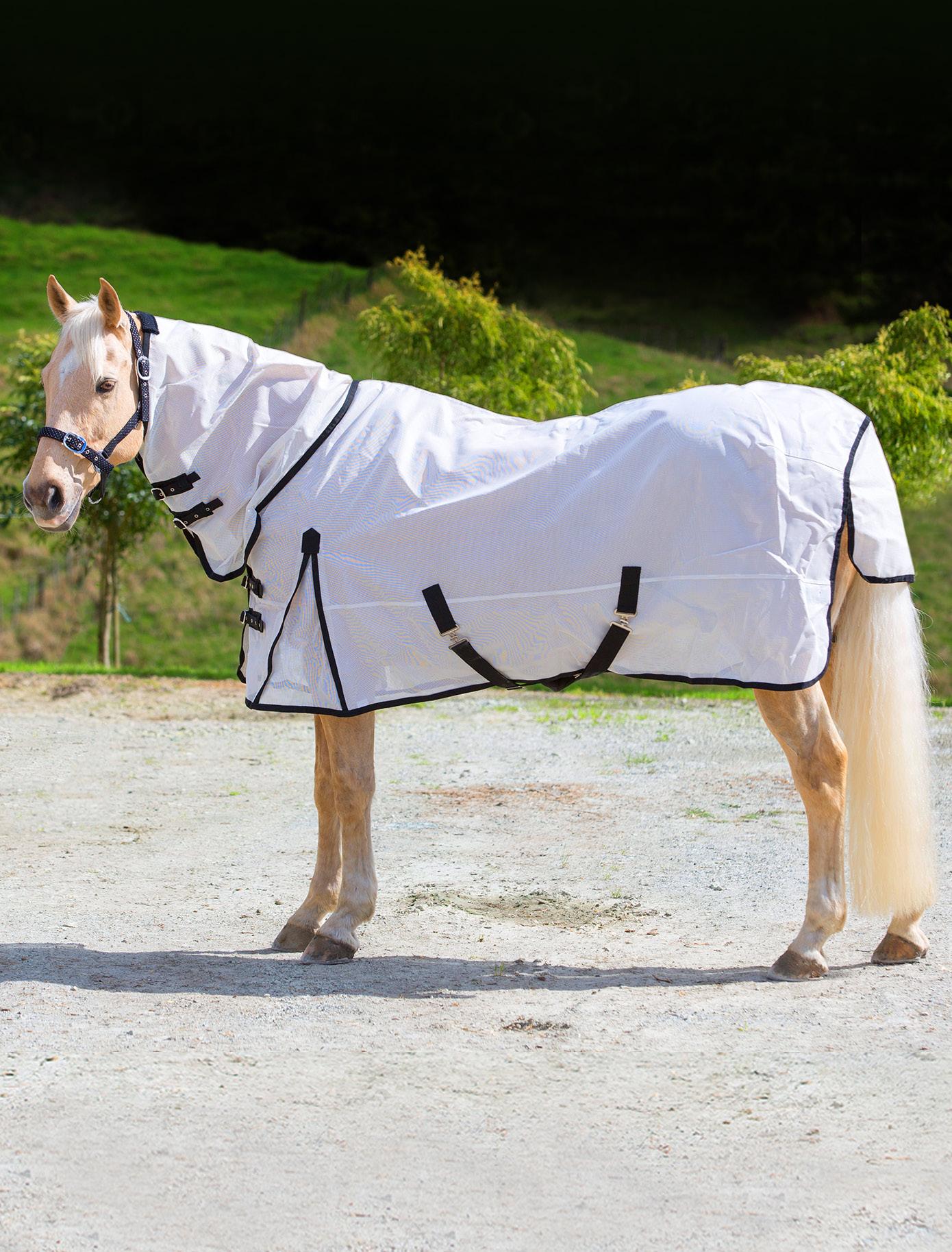 Keeps your horse cool and comfortable whilst providing an effective barrier to flies and bugs. UV reflective fabric helps guard against sun bleach and the seamless neck design and lining to the chest and all seams helps prevent rubbing. Further features include twin buckle chest straps, adjustable cross surcingles, adjustable filet strap (D Rings for leg straps, not included) and a tail flap. Sizes 4’3