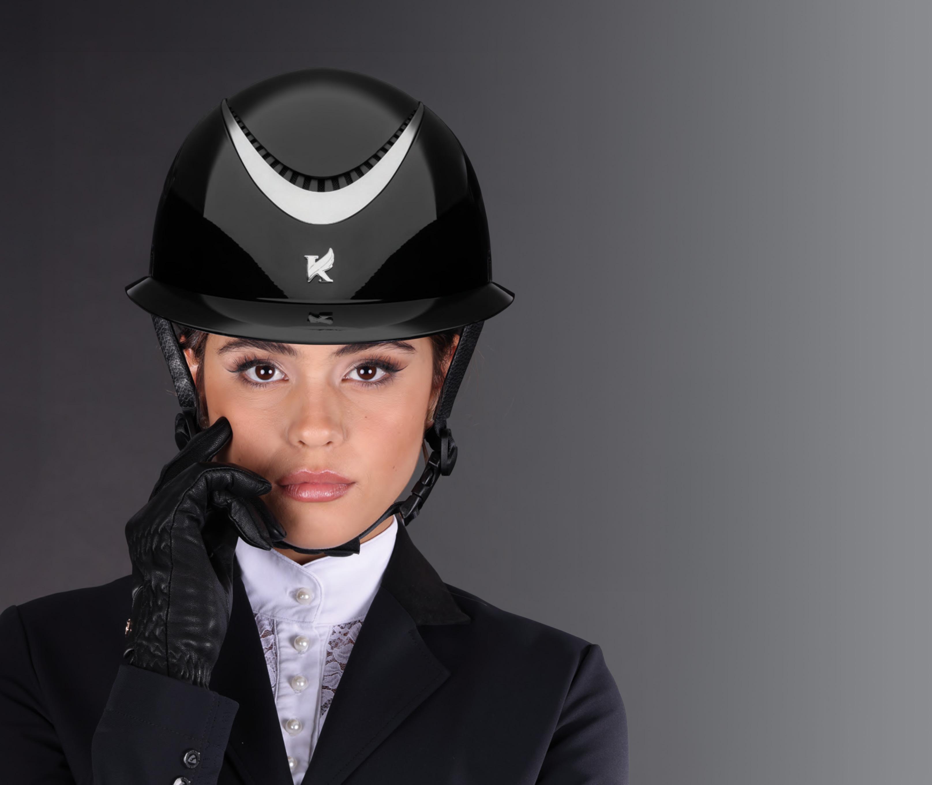 Add drama to your presentation. High gloss finish shell and peak with a gloss frame for definition. The wide peak frames the face for a flattering look.
