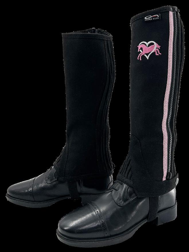 Durable, washable synthetic nubuck chap with pink glitter strip and horse design. Comfortable fabric with an elastic stretch calf and full length SBS zipper. Complete the outfit with a pair of matching Lucy Gloves. Black. Sizes S - XL