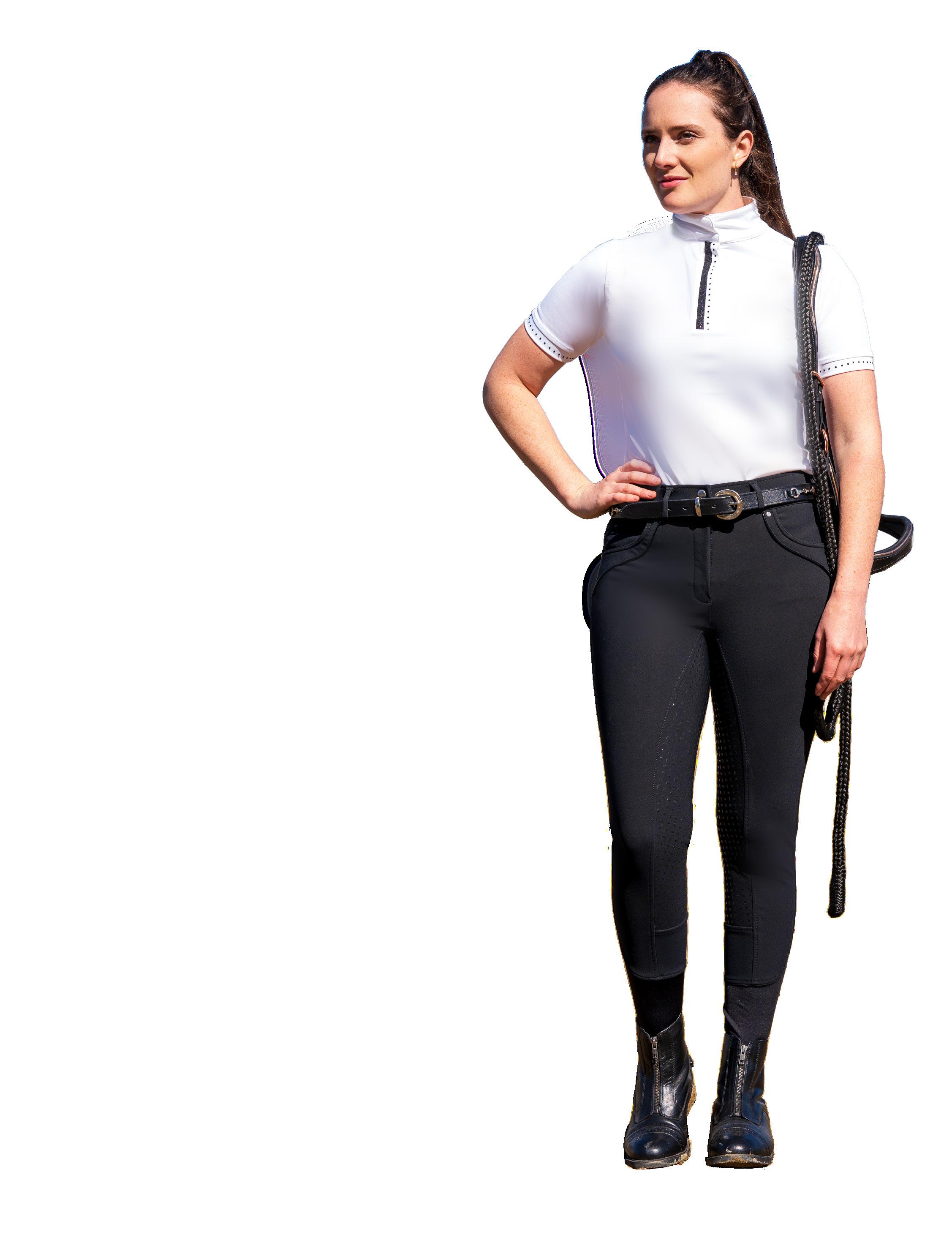 These full seat breeches, are super stretchy and comfortable. They have two back pockets and faux leather piping on the pockets on the front and back. Black. Sizes 8 - 18