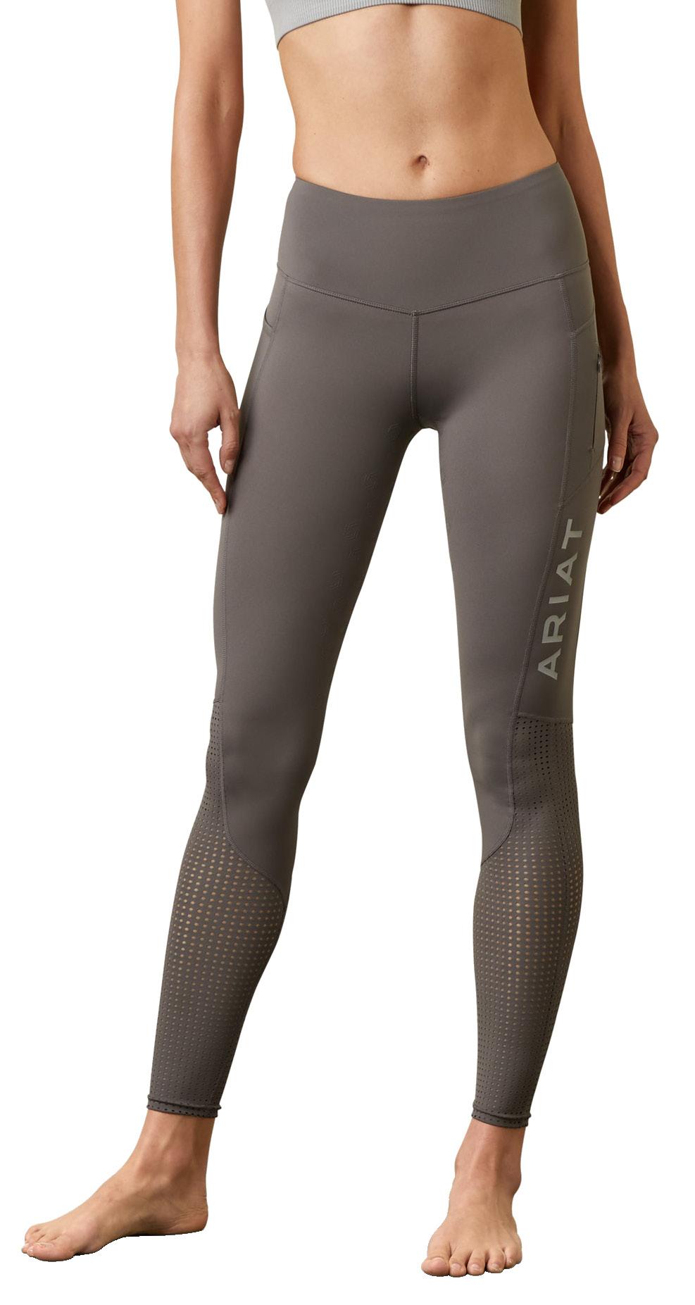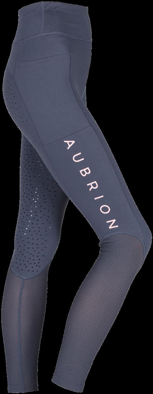 Summer weight Rhythm mesh riding tights are made to move with your body for ultimate performance. Stretch, quick dry fabric, lower leg waffle mesh allows air flow. Silicone seat and leg grips, thigh phone pocket, deep waist band and Aubrion prints. Navy or Olive. Sizes XS - XXL