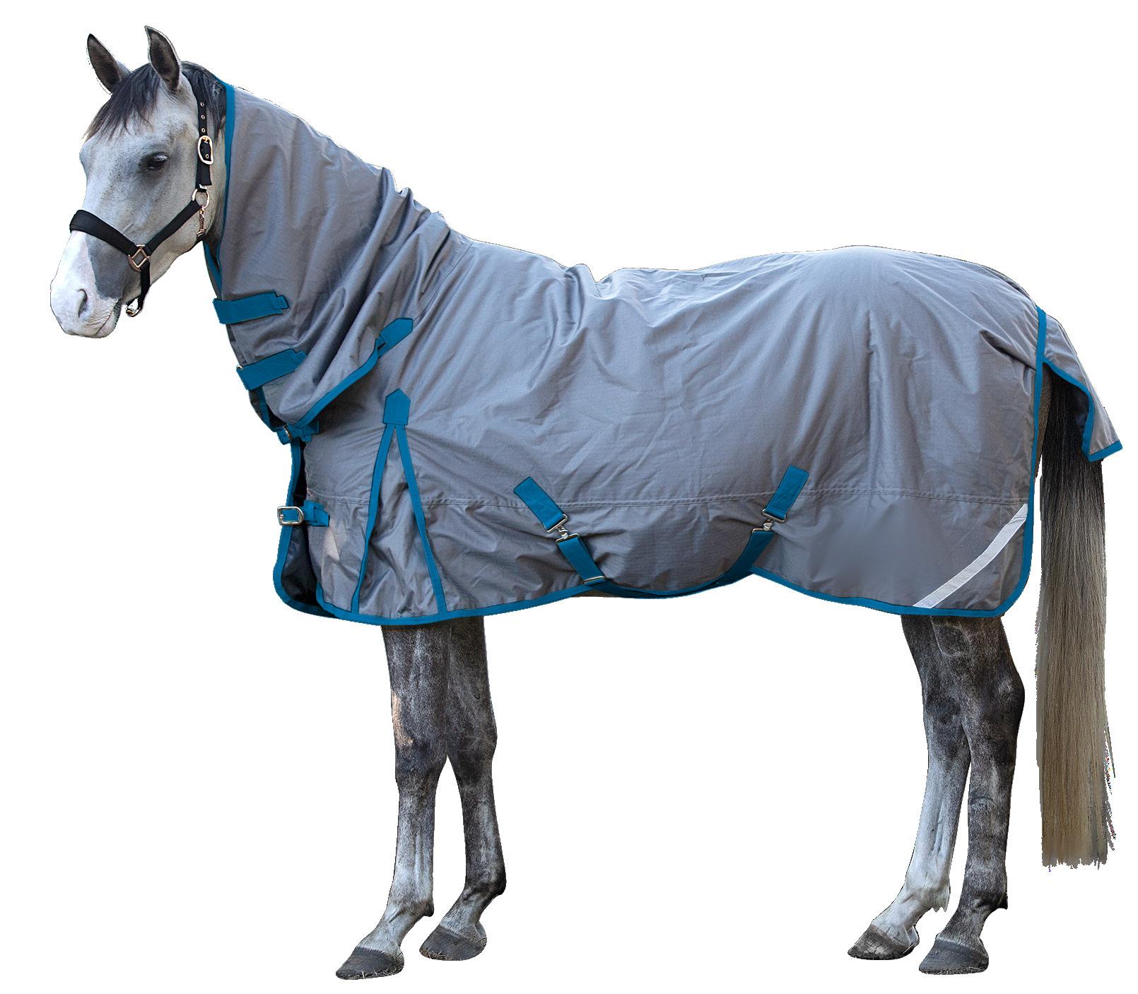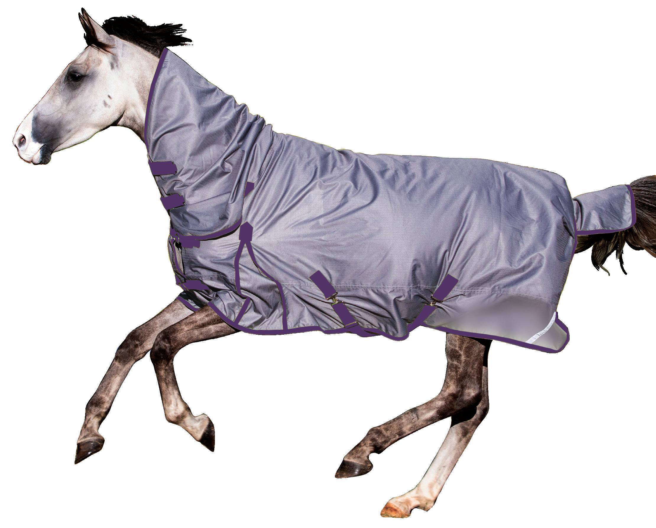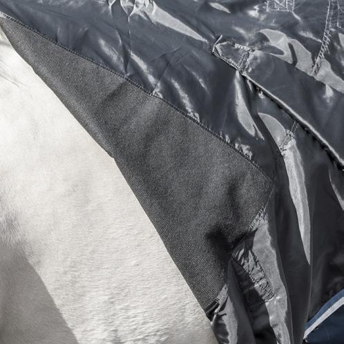 600 Denier, waterproof and breathable ripstop nylon outer. Integrated neck cover, shoulder gussets, adjustable cross surcingles, tail flap, double front straps and removable back straps. Sizes 2’9” - 5’6”