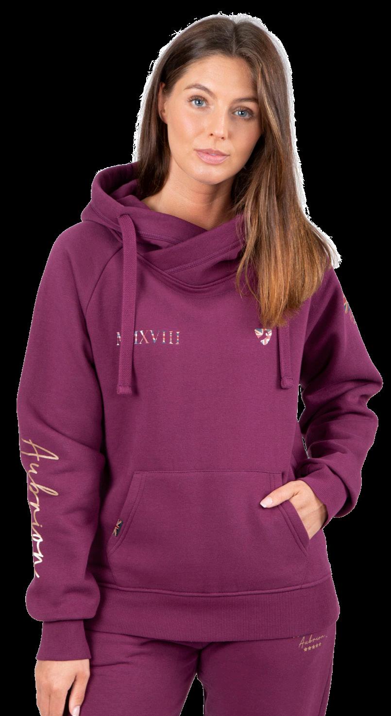 The relaxed glamour styling of the Aubrion team hoodie gives it a laid back elegance. Cotton rich blend jersey with fleecy inner, cowl neck hood with drawcord, thumb hole cuffs and handwarmer pocket. Mulberry or Navy. Sizes XS -