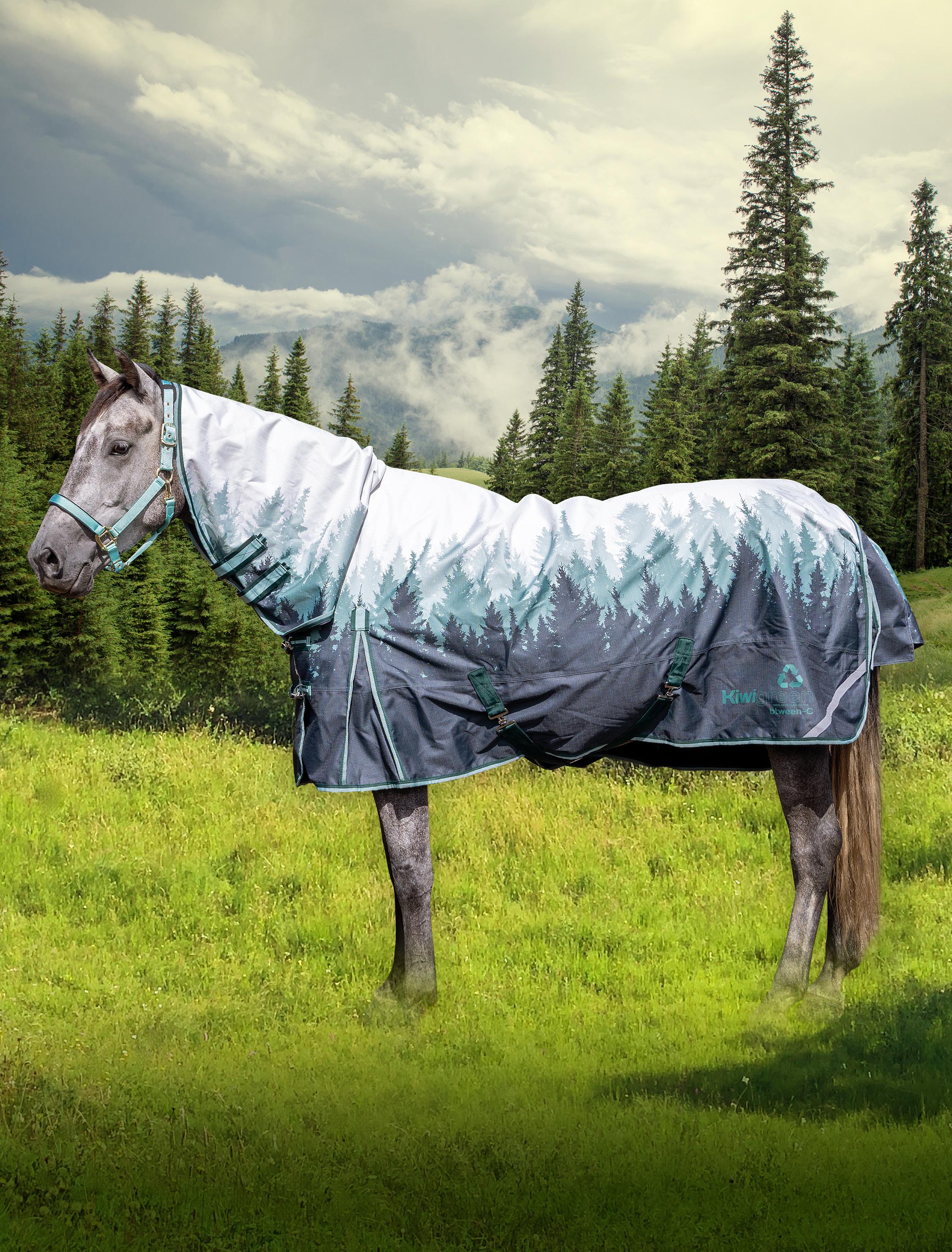 The KiwiGreen Forest Btween combo is made of 1200 denier waterproof and breathable material, with a thermal lining. The thermal lining wicks away moisture, whether it’s sweat or condensation keeping your horse drier. The outer fabric is 100% recycled material made up of around 180 plastic bottles. Double quick clip front straps with Velcro, cross surcingles, large pleated tail guard, shoulder gussets and removable leg straps. *halter not included