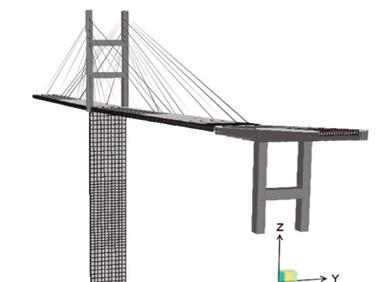 El Modelo de Elementos Finitos (MEF) desarrollado consta de 10 281 nodos, las vigas, piezas puente, pilones, travesaños y tirantes fueron modelados utilizando 3532 elementos tipo frame mientras que la losa y la torre principal fueron modeladas utilizando 9463 elementos tipo Shell, ver Figura 7. Posteriormente se calibró el MEF utilizando la información modal obtenida del análisis de las señales de monitoreo periódico y los valores de las tensiones de los tirantes obtenidos del último pesaje directo.