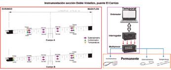 En 2018, durante las etapas de rehabilitación del puente, el IMT realizó la instrumentación y monitoreo continuo de la sección doble voladizo. Por lo que se instalaron sensores de fibra óptica de manera permanente. De los cuales, los extensómetros para concreto, se colocaron para medir las deformaciones unitarias en dovelas seleccionadas. Adicional, se instalaron inclinómetros y sensores de temperatura. La Figura 3 muestra la instrumentación utilizada, así como la arquitectura de interconexión con el sistema de adquisición de datos.