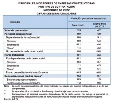 La obra pública impulsó el desarrollo de la construcción al cierre del 2022. El INEGI reportó el lunes 23 de enero del 2023 que durante noviembre del 2022 el valor de producción de las empresas del sector creció 2.5 %, respecto al mes previo, con lo que sumó tres incrementos consecutivos (en la comparación anual el aumento fue del 4.7 %), considerando cifras desestacionalizadas.