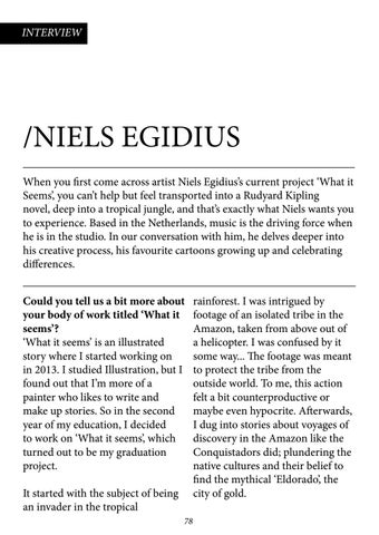 /NIELS EGIDIUS When you first come across artist Niels Egidius’s current project ‘What it Seems’, you can’t help but feel transported into a Rudyard Kipling novel, deep into a tropical jungle, and that’s exactly what Niels wants you to experience. Based in the Netherlands, music is the driving force when he is in the studio. In our conversation with him, he delves deeper into his creative process, his favourite cartoons growing up and celebrating differences. Could you tell us a bit more about your body of work titled ‘What it seems’? ‘What it seems’ is an illustrated story where I started working on in 2013. I studied Illustration, but I found out that I’m more of a painter who likes to write and make up stories. So in the second year of my education, I decided to work on ‘What it seems’, which turned out to be my graduation project. It started with the subject of being an invader in the tropical 78
