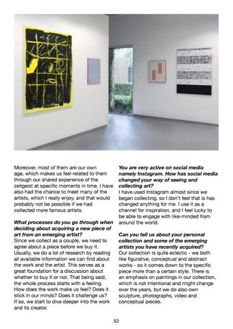 You are very active on social media namely Instagram. How has social media changed your way of seeing and collecting art? I have used Instagram almost since we began collecting, so I don’t feel that is has changed anything for me. I use it as a channel for inspiration, and I feel lucky to be able to engage with like-minded from around the world. Can you tell us about your personal collection and some of the emerging artists you have recently acquired? Our collection is quite eclectic - we both like figurative, conceptual and abstract works - so it comes down to the specific piece more than a certain style. There is an emphasis on paintings in our collection, which is not intentional and might change over the years, but we do also own sculpture, photographs, video and conceptual pieces. 52
