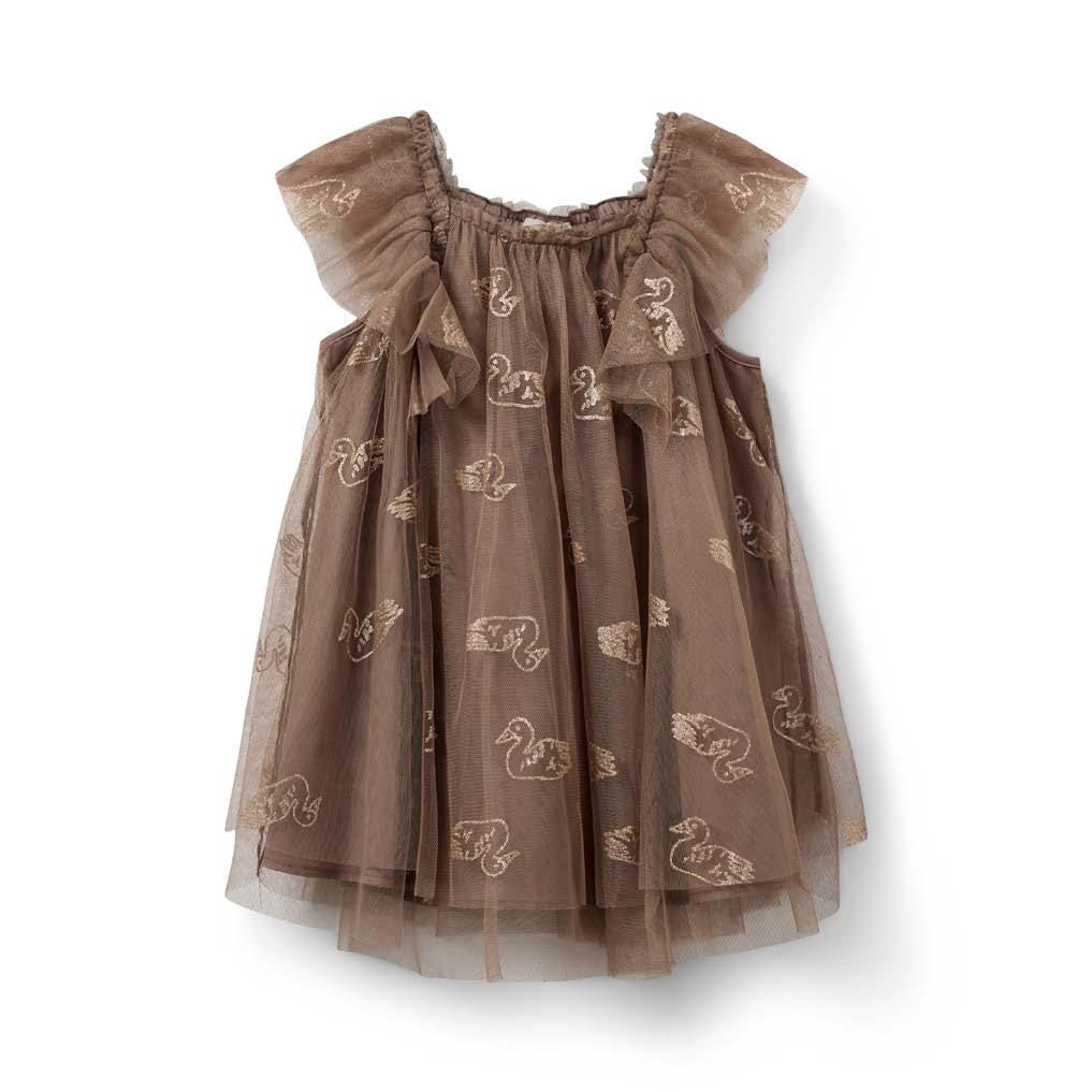 SOFIE SCHNOOR laver de flotteste kjoler til børn og denne model er ikke nogen undtagelse. Udover fine flæser ved skuldrene er kjolen dekoreret med et print af svaner. Vejledende pris kr. 349,-.