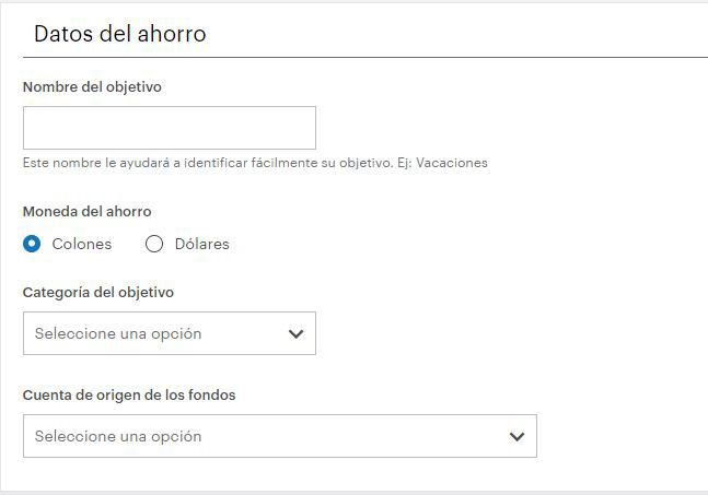 Sección de datos del ahorro. El cliente debe agregar el nombre del Objetivo, este nombre aparecerá para que pueda reconocerlo de forma fácil.