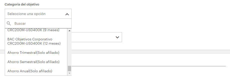 • En la sección de “Datos del ahorro” y el espacio “Categoría del Objetivo” al final de la lista, encontrarás las 3 posibles categorías que aplican con tu afiliado.