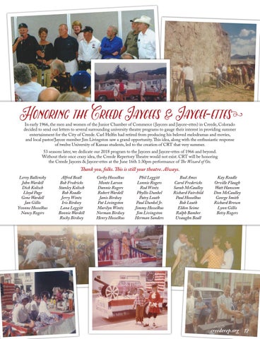 Honoring the Creede Jaycees. & Jaycee-ettes In early 1966, the men and women of the Junior Chamber of Commerce ( Jaycees and Jaycee-ettes) in Creede, Colorado decided to send out letters to several surrounding university theatre programs to gauge their interest in providing summer entertainment for the City of Creede. Carl Helfin had retired from producing his beloved melodramas and movies, and local pastor/Jaycee member Jim Livingston saw a grand opportunity. This idea, along with the enthusiastic response of twelve University of Kansas students, led to the creation of CRT that very summer. 53 seasons later, we dedicate our 2018 program to the Jaycees and Jaycee-ettes of 1966 and beyond. Without their once crazy idea, the Creede Repertory Theatre would not exist. CRT will be honoring the Creede Jaycees & Jaycee-ettes at the June 16th 1:30pm performance of The Wizard of Oz.