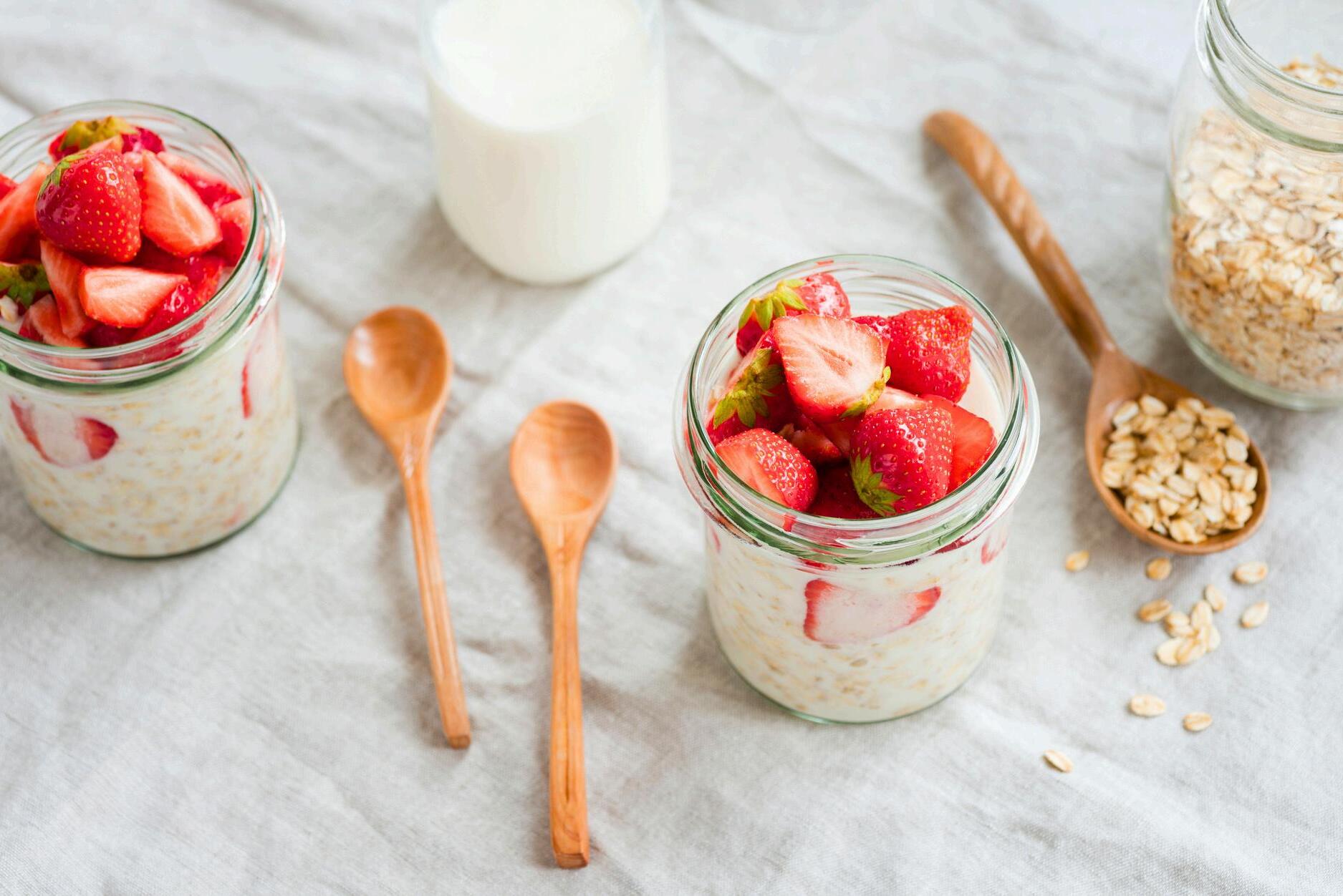 In a bowl mix the oats, vanilla extract and milk together. Cling film and place in the fridge overnight. 1 Once chilled, mix the yoghurt and chopped strawberries through the oats.