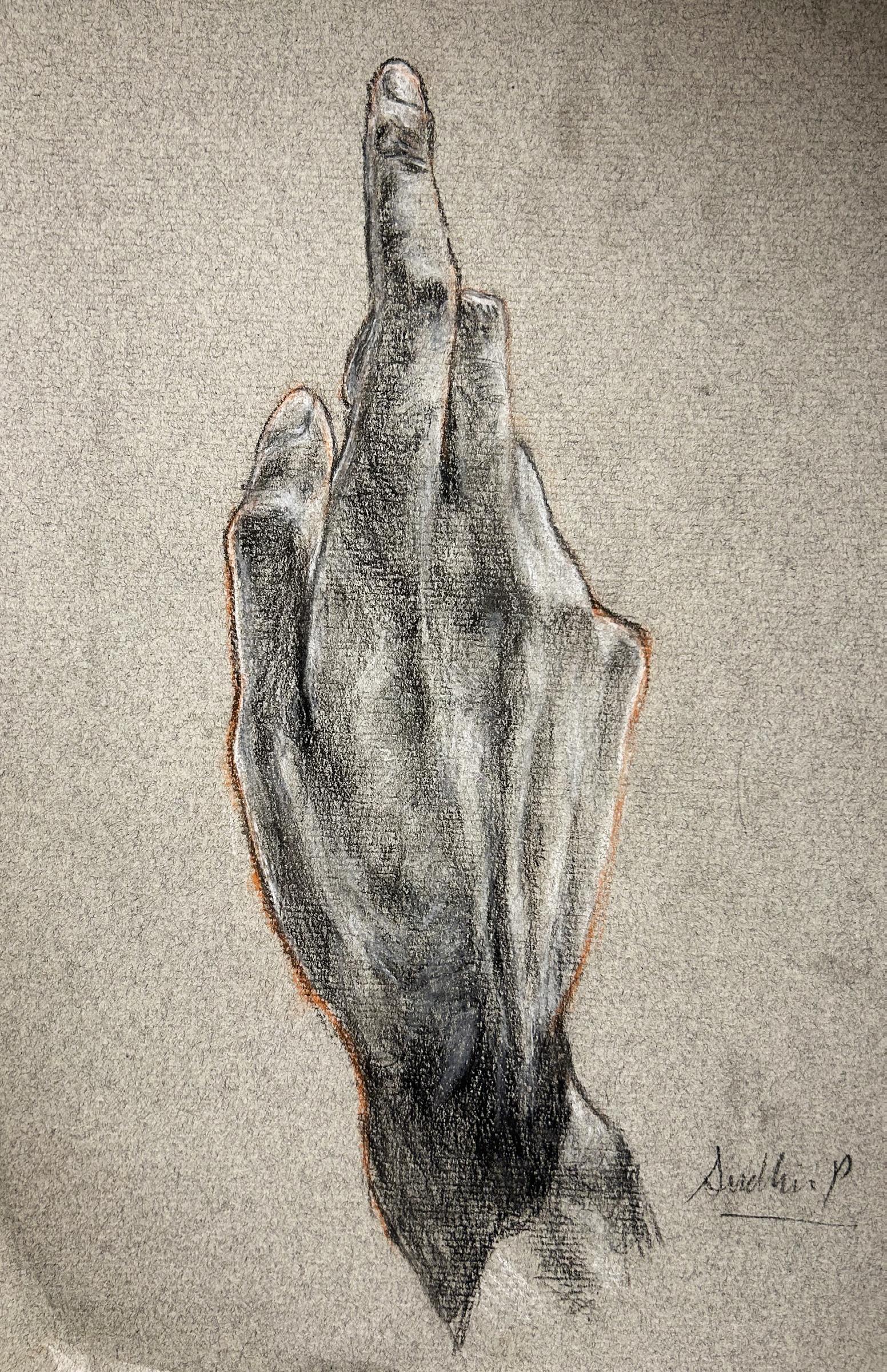 planned to focus solely on her premedicine coursework but found the addition of her art major to be formative in her understanding of patient care. During a joint drawing session with medical students and undergraduates, Prof. Rachel Mindrup asked her medical students to pose for 5-minute sessions when the scheduled model was canceled. The most impactful interaction was when a student was asked about the discomfort of having several eyes staring at him as he was drawn. He remarked that the pose he was holding with his arms in the air was too painful to focus on the staring eyes. Prof. Mindrup remarked on the similarities between this student’s pain and discomfort to a patient being examined by a healthcare provider.