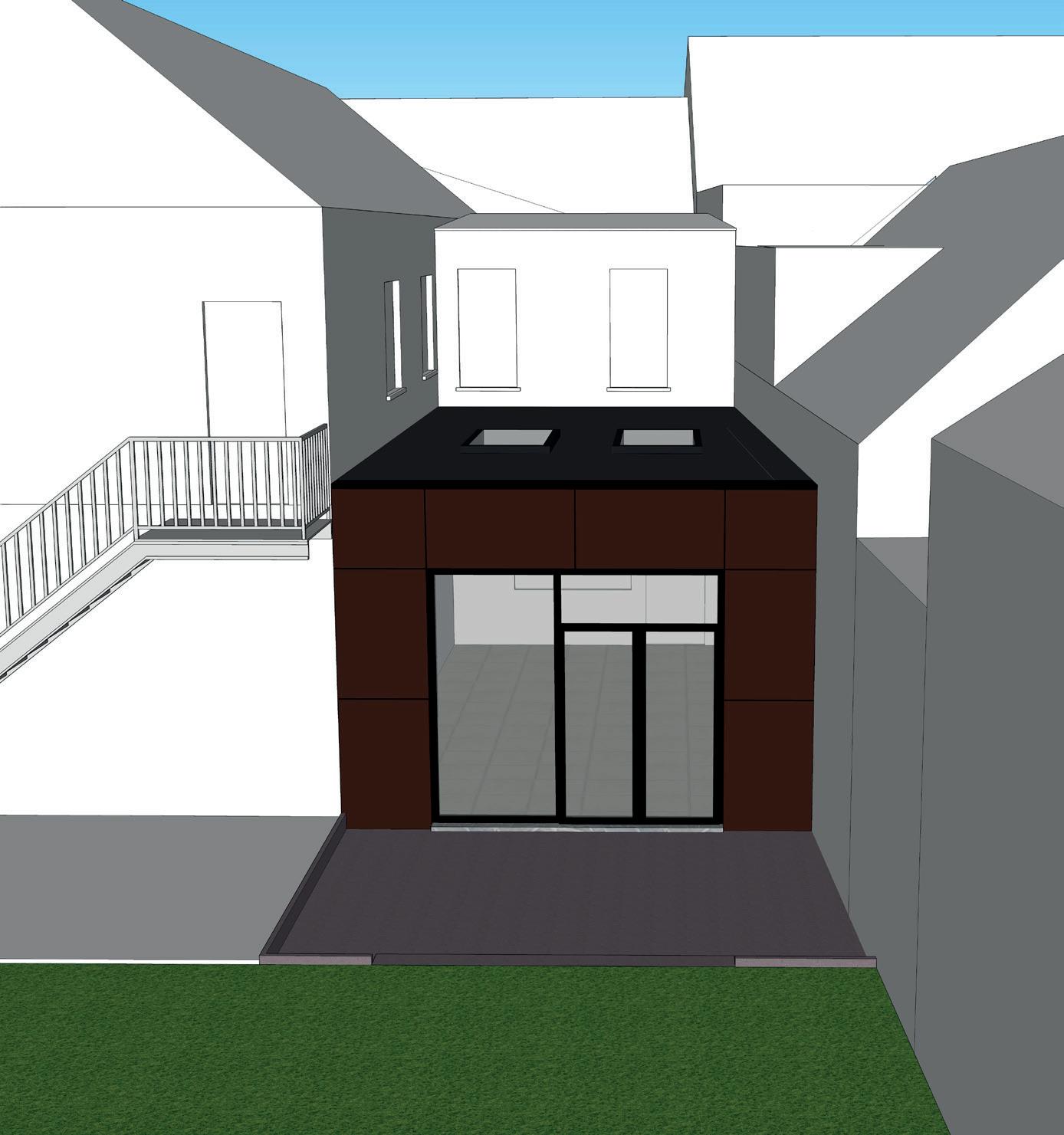La solution retenue est d’installer une nouvelle extension en lieu et place de la véranda donnant sur la cour et le jardin. Cette construction nous permettra non seulement de recréer un grand espace supplémentaire sans ajouter une énième annexe au bâti et permettrait également dans le futur l’éventuel aménagement de chambres supplémentaires à l’étage. Le projet consiste à démolir la véranda vieillissante ( ±20m2 ) pour remonter un beau volume de ± 40m2 sur une nouvelle fondation. Cette extension viendrait s’aligner à la façade arrière créant une continuité avec le volume existant.