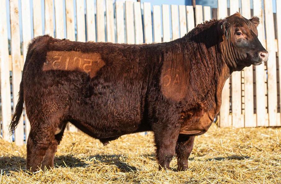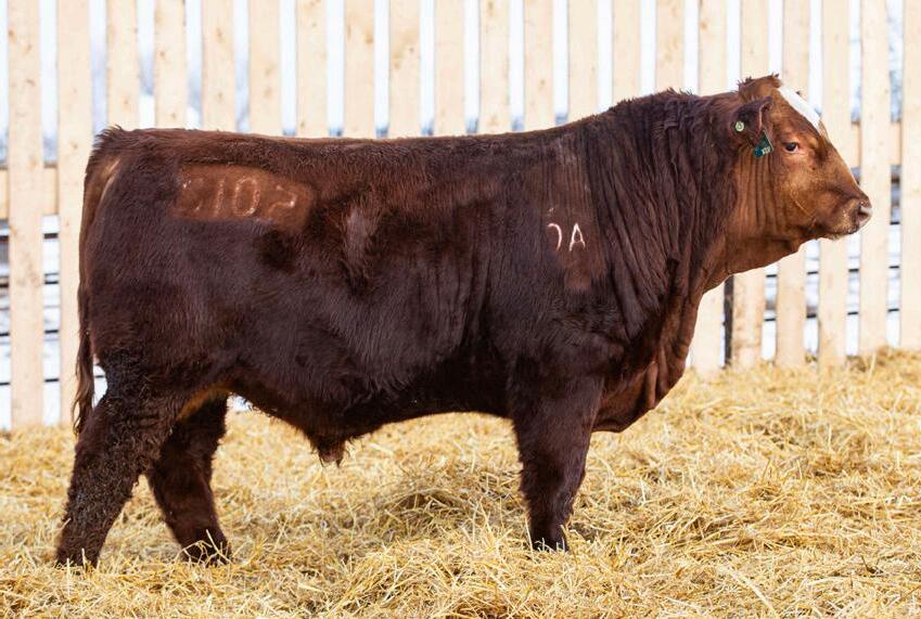 Red ACC Targaryen 110N will find many friends come sale day! He’s dark red, has some calving ease for the heifer pen and his mom is one of our top Red Angus Cows. She is the dam of the Female we showed last fall at Ag Ex and Agribition. Her 2024 heifer calf is also in our bred heifer pen and patterns very similar to 169L. With that kind of consistency we believe deeply in the quality of 110N.