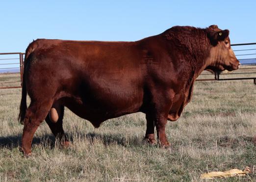 Our leadoff bull this year is a very unique and desirable individual. He combines calving ease, muscle definition, breed character and a very nice momma in a dark red package. When he walked in the picture pen Wes said” You better call some breeders on this rascal”. He was the 4th heaviest weaned bull calf in his group with a WW ratio of 109. His dam was purchased from Camo Cattle Co at Red Round Up and has registered 5 progeny including bulls we sold to Clarion Colony and Garry Griffith.