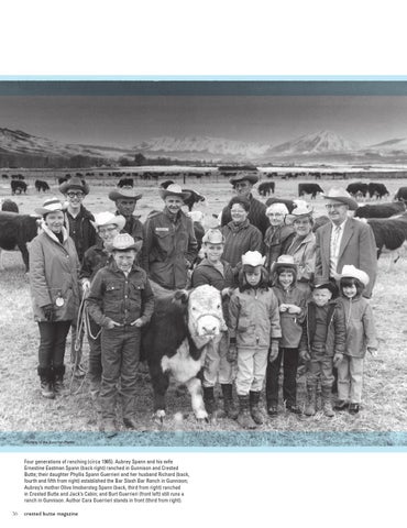 Four generations of ranching (circa 1965). Aubrey Spann and his wife Ernestine Eastman Spann (back right) ranched in Gunnison and Crested Butte; their daughter Phyllis Spann Guerrieri and her husband Richard (back, fourth and fifth from right) established the Bar Slash Bar Ranch in Gunnison; Aubrey’s mother Olive Imobersteg Spann (back, third from right) ranched in Crested Butte and Jack’s Cabin; and Burt Guerrieri (front left) still runs a ranch in Gunnison. Author Cara Guerrieri stands in front (third from right). 36