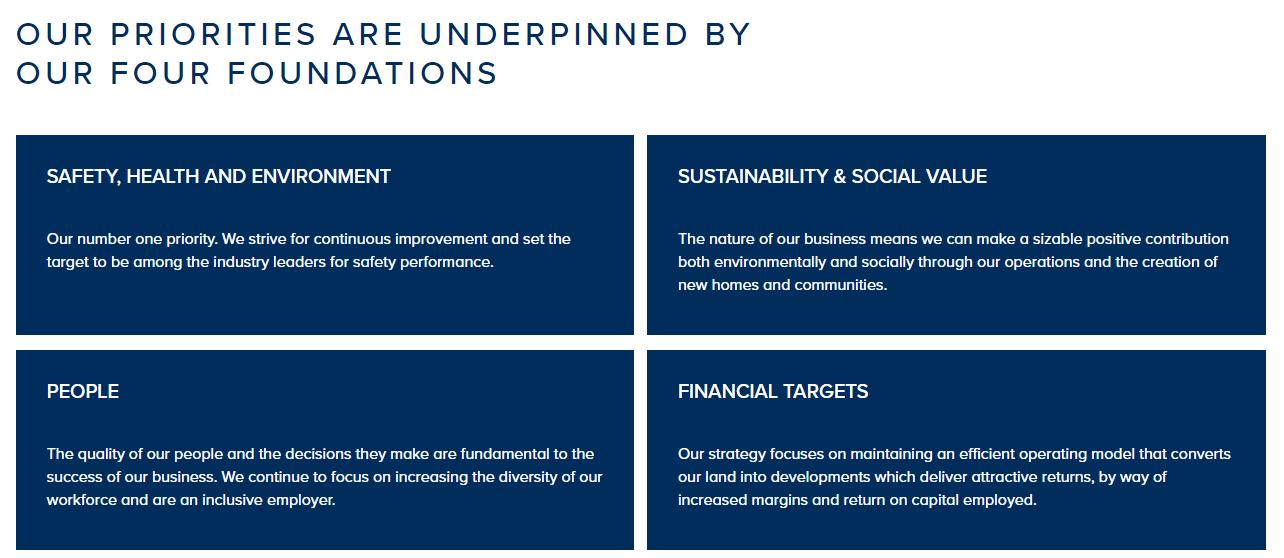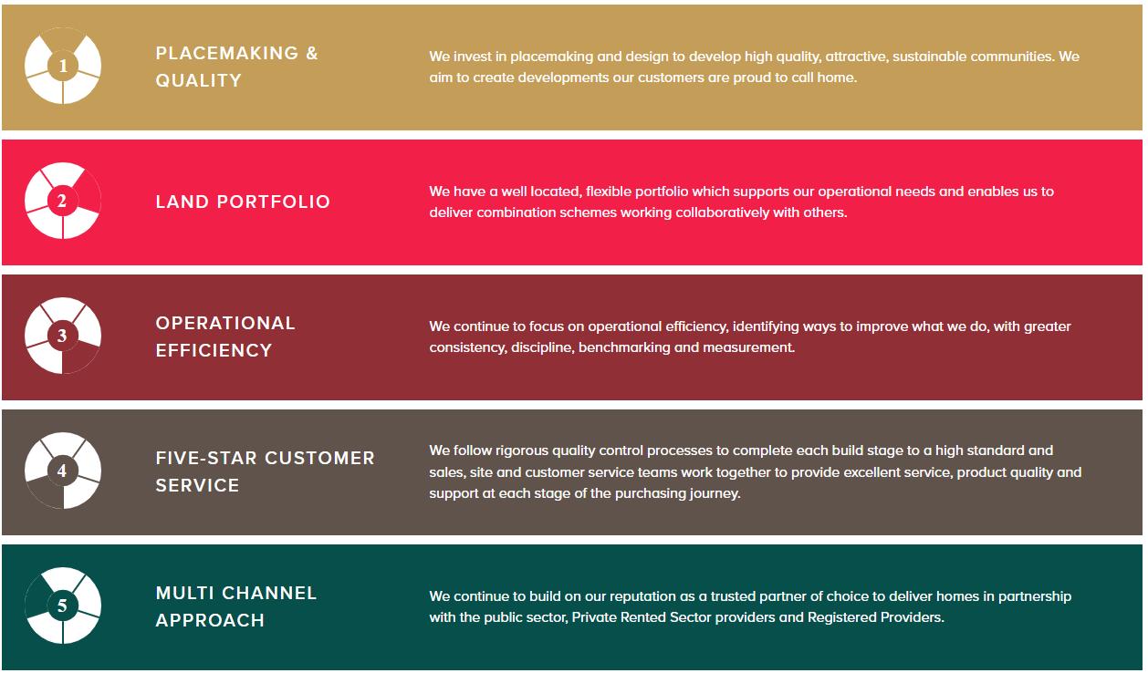 • Make a positive impact on communities: Delivering a positive impact for our communities and partners through active engagement and partnerships, providing attractive and high-quality new homes and investing in initiatives and infrastructure that bring a lasting beneficial impact.