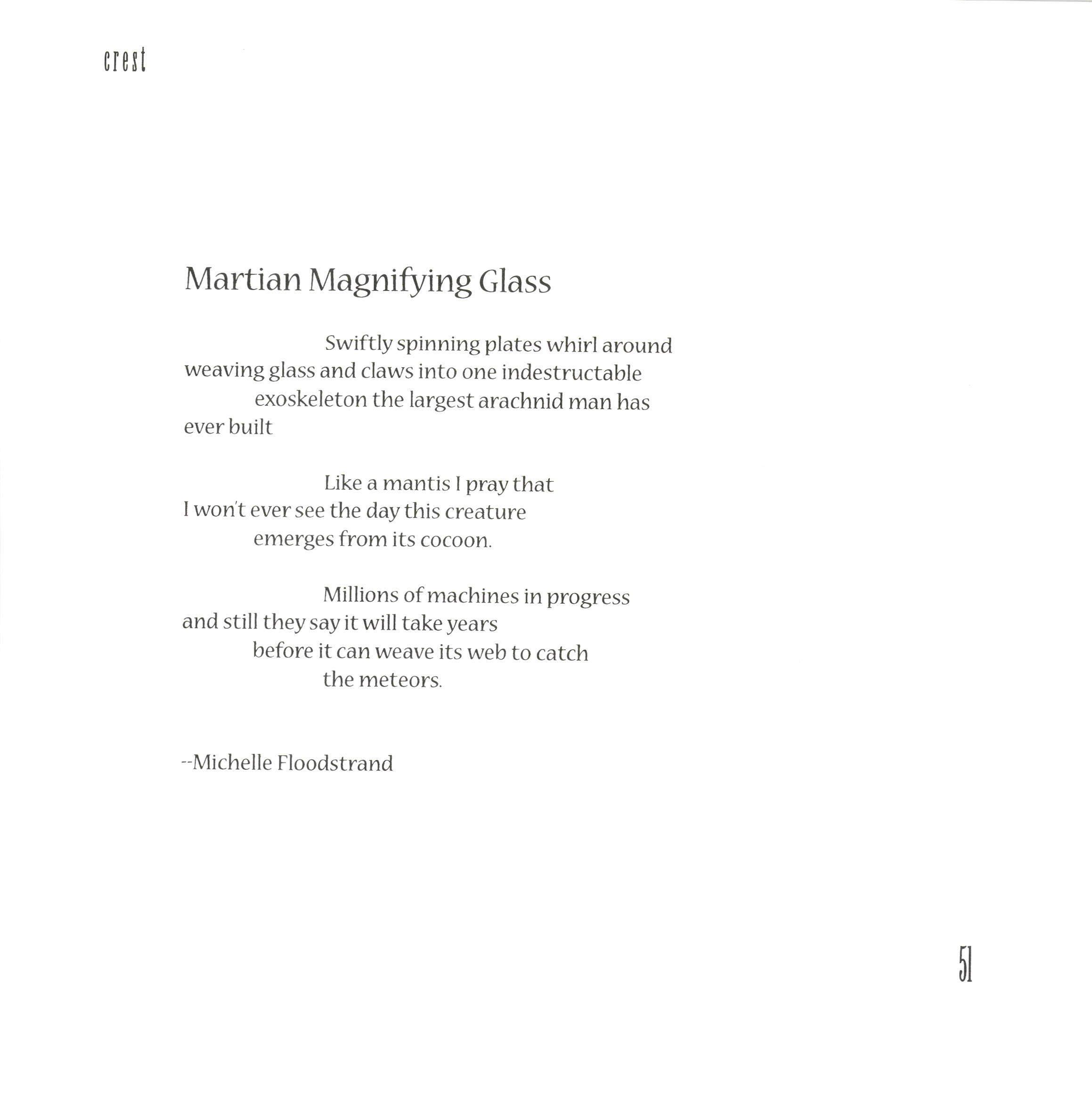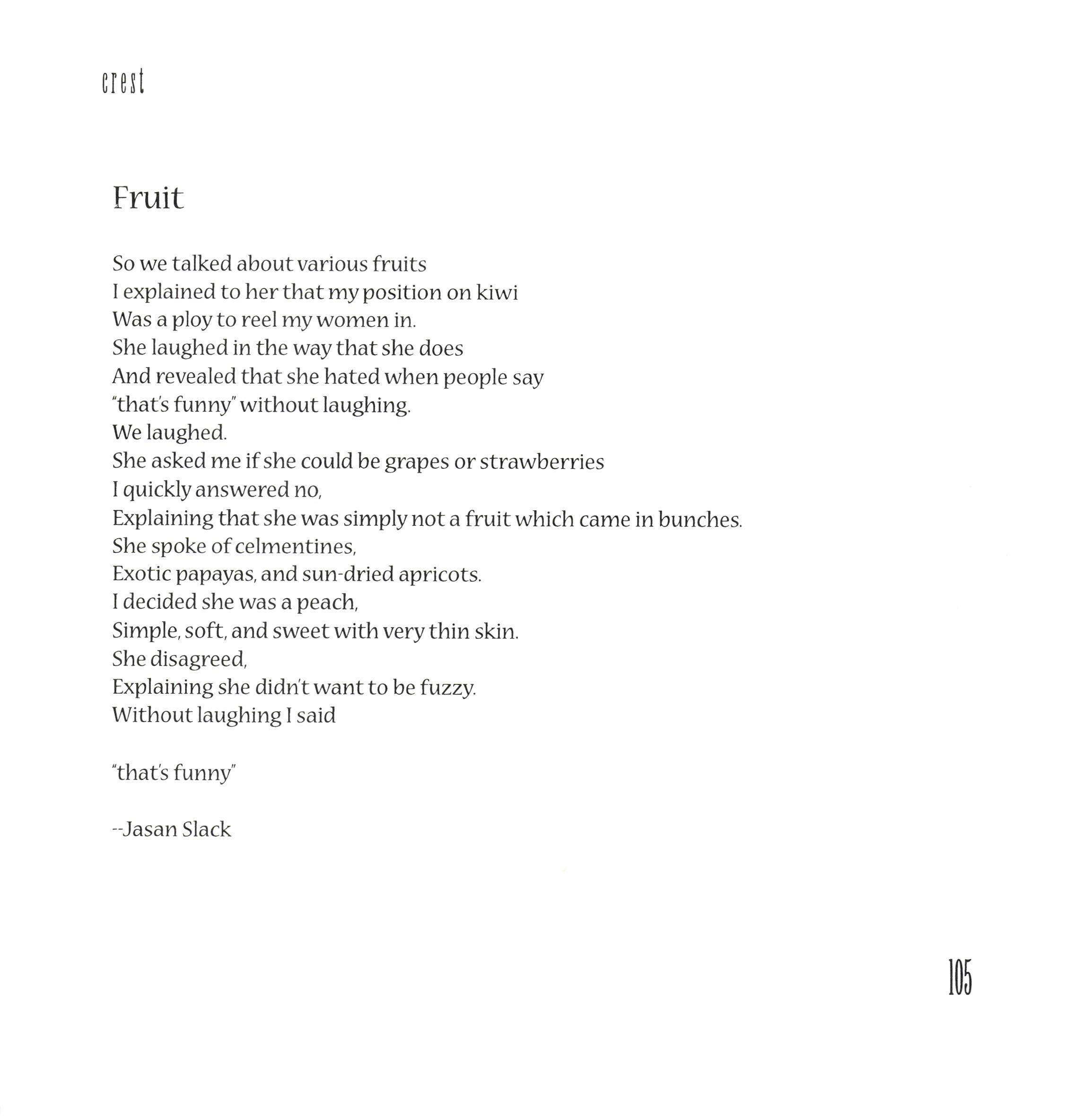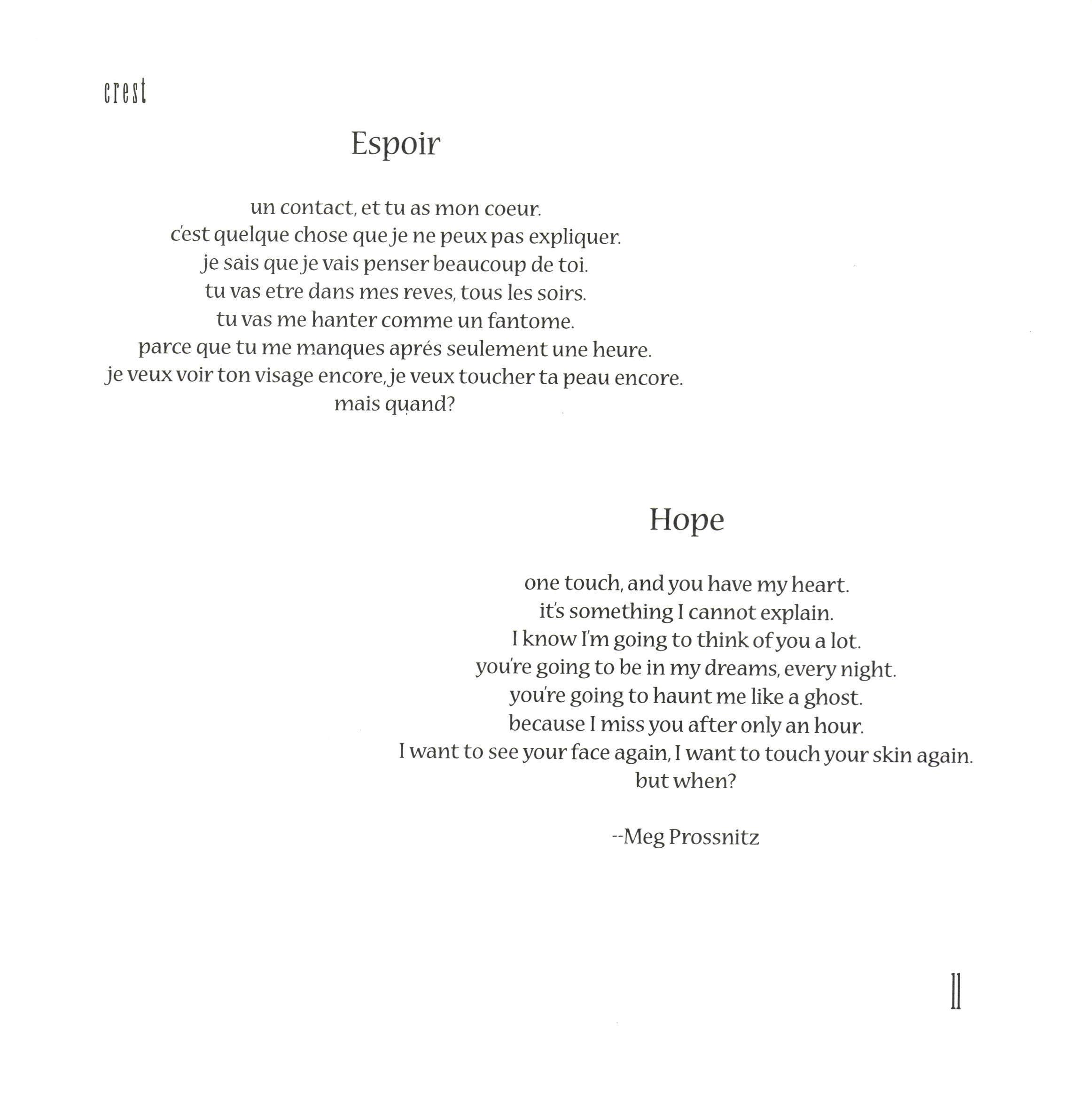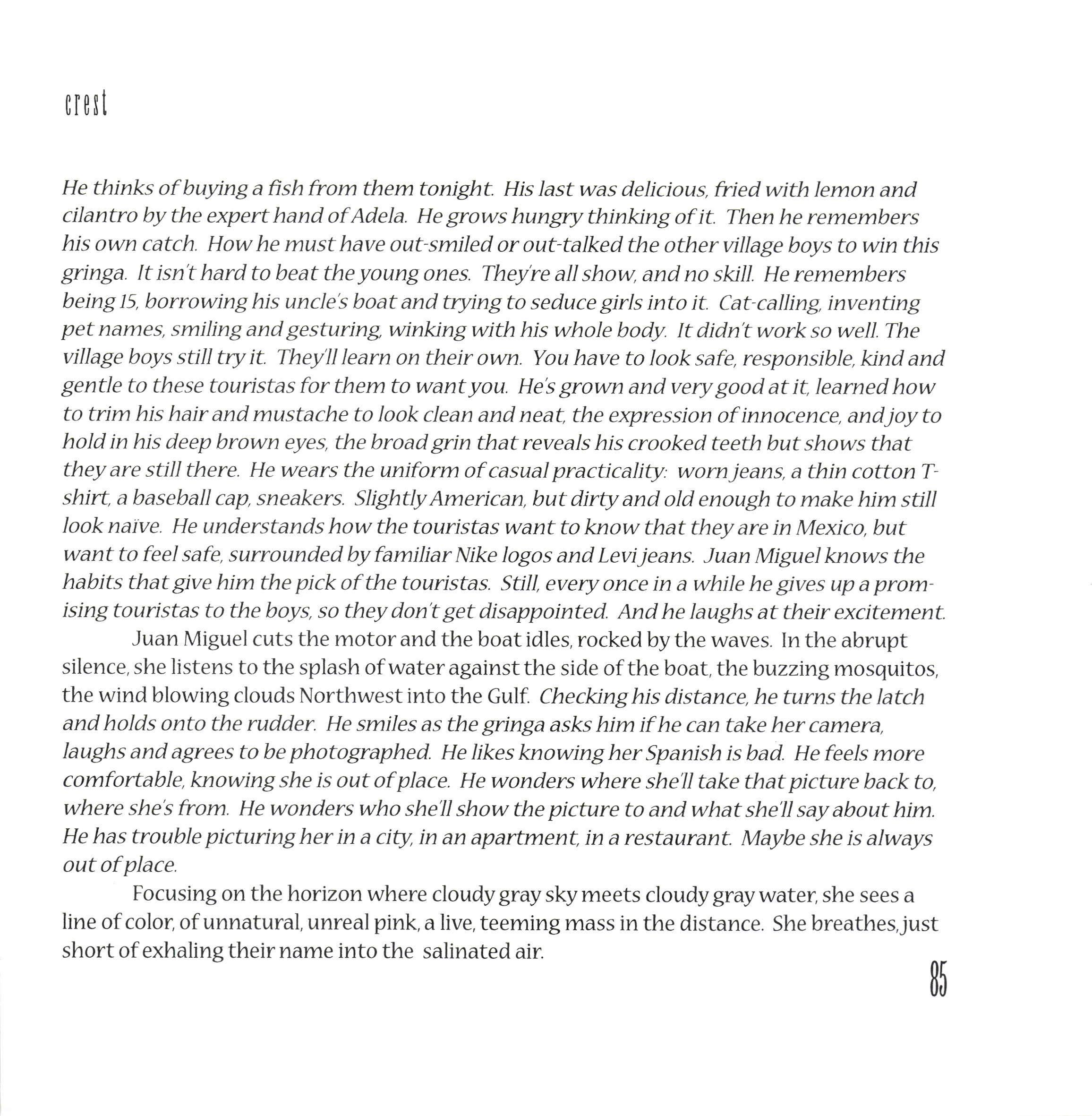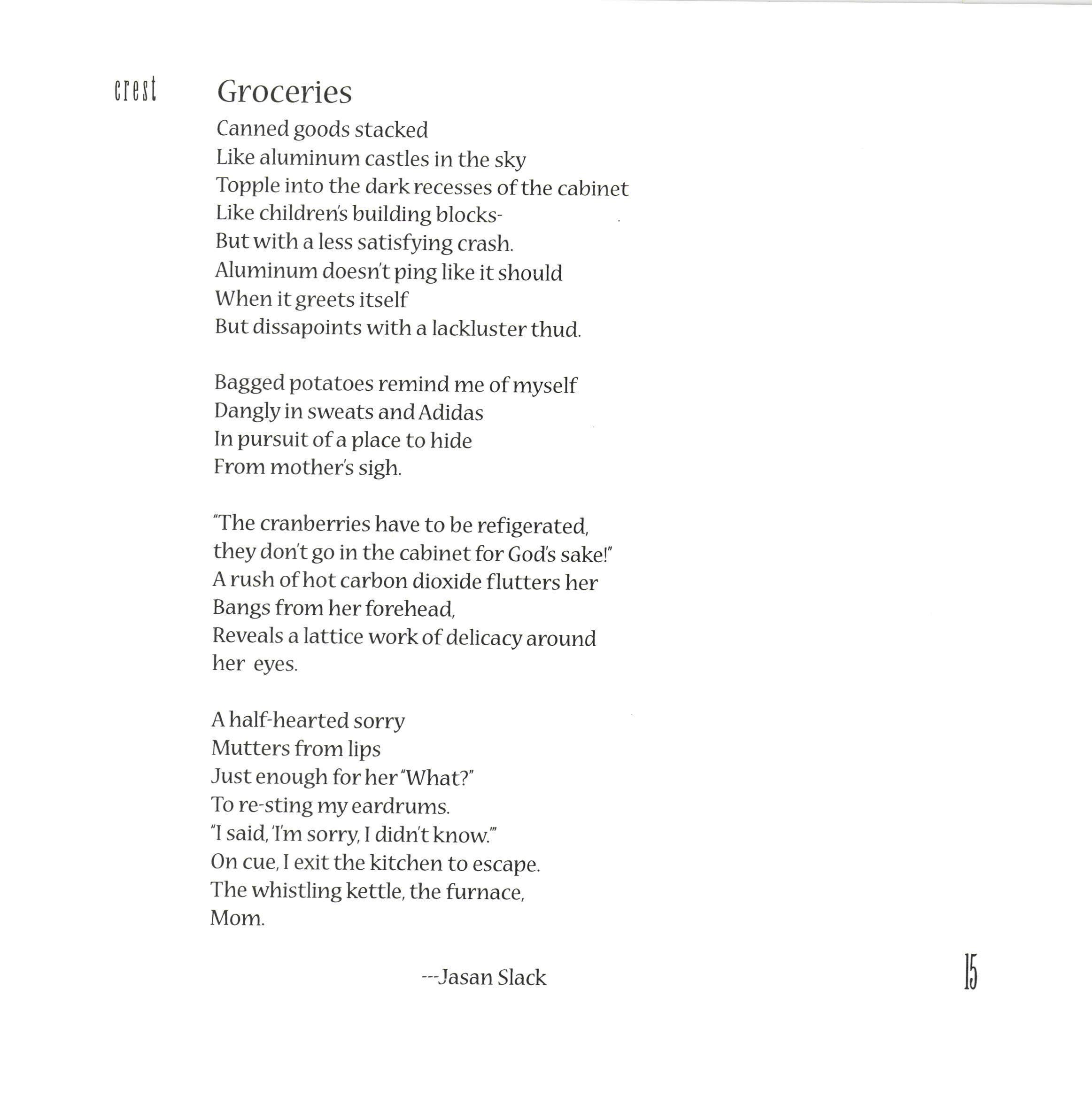 They put their hands upon meFingernails ran across my shoulderblades Traced patterns ofthe places, The shape of names. Theylaid down myhead as I broke.