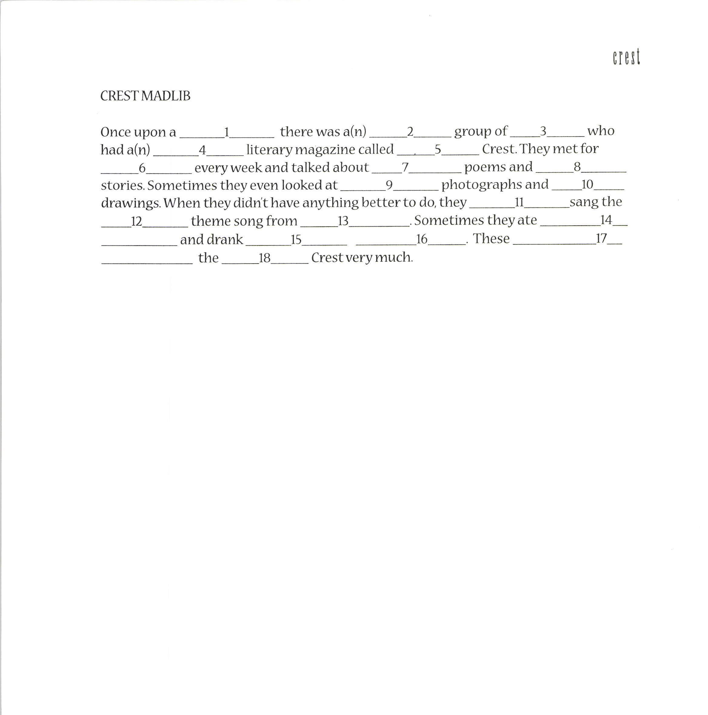 Once upon a therewas a(n) 2- group of 3-who had a(n) literarymagazine called -5-Crest.Theymetfor -6 -every