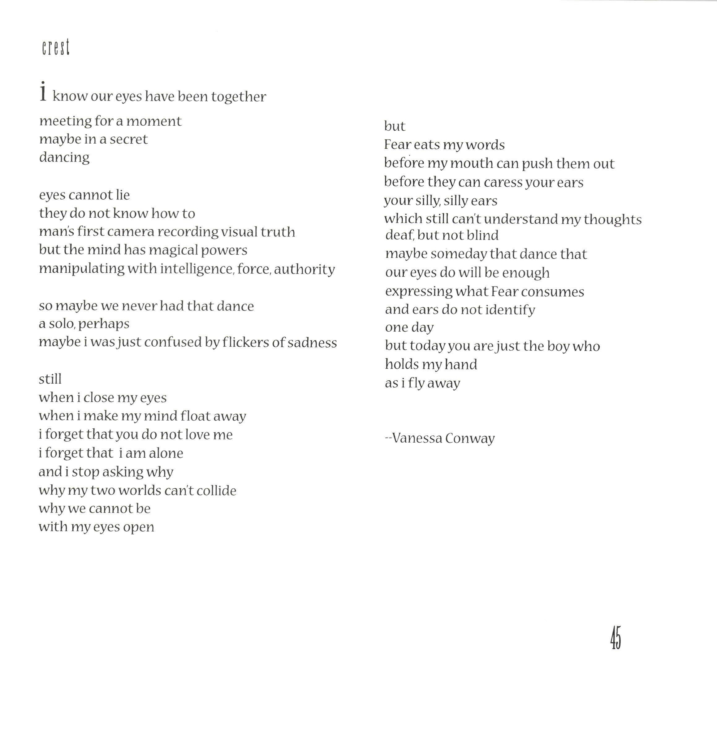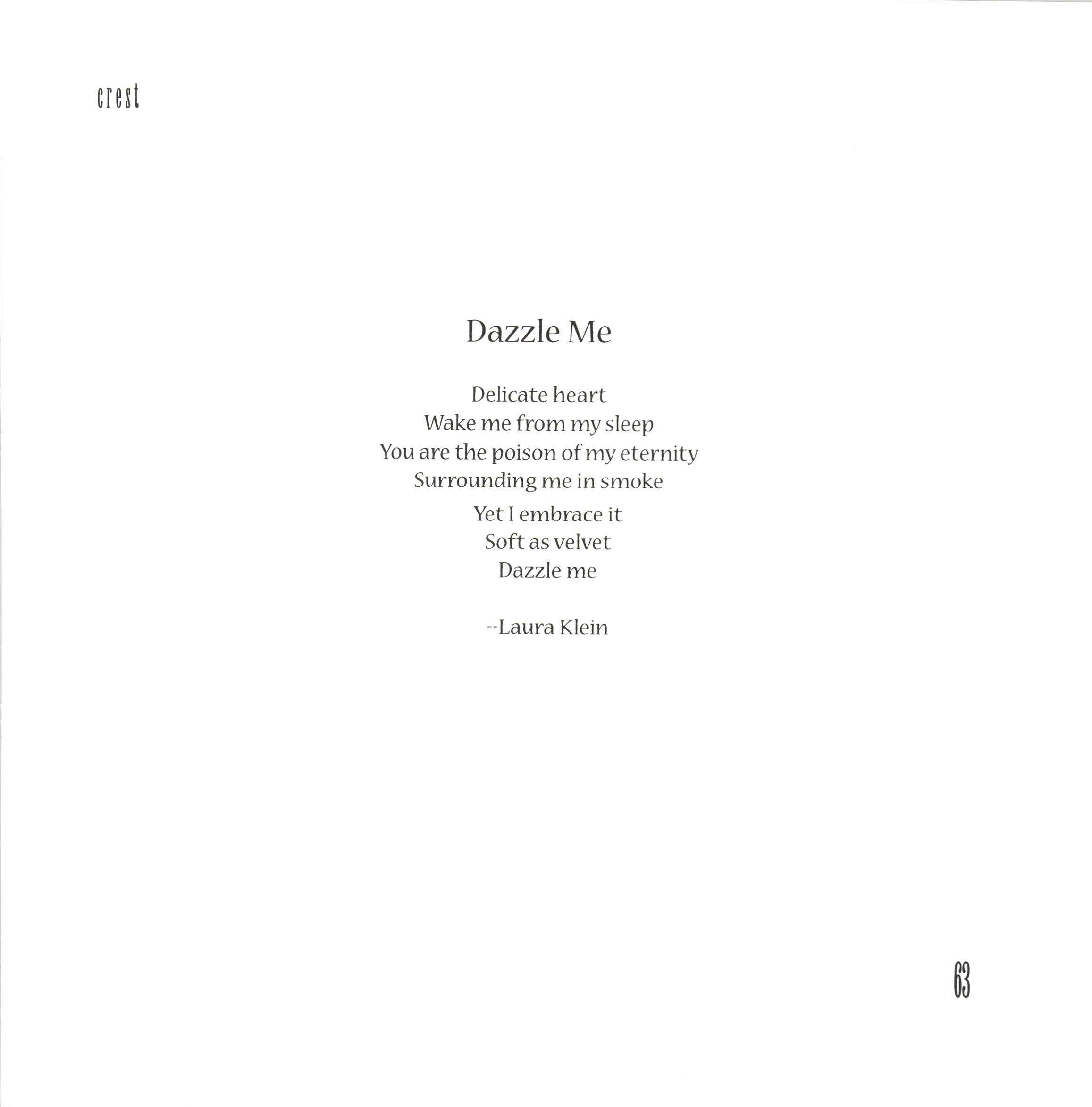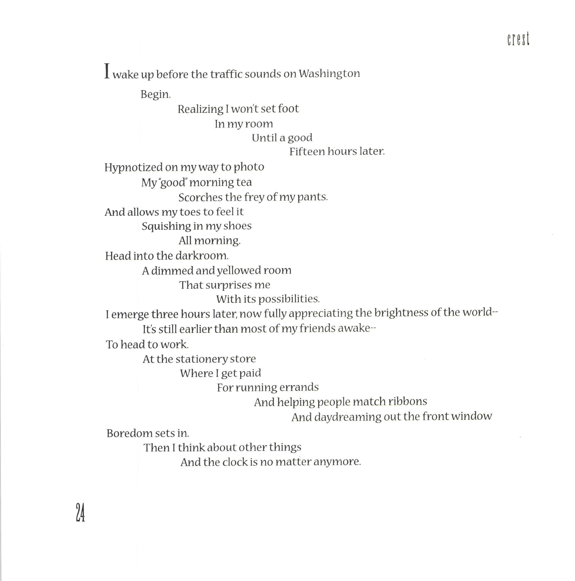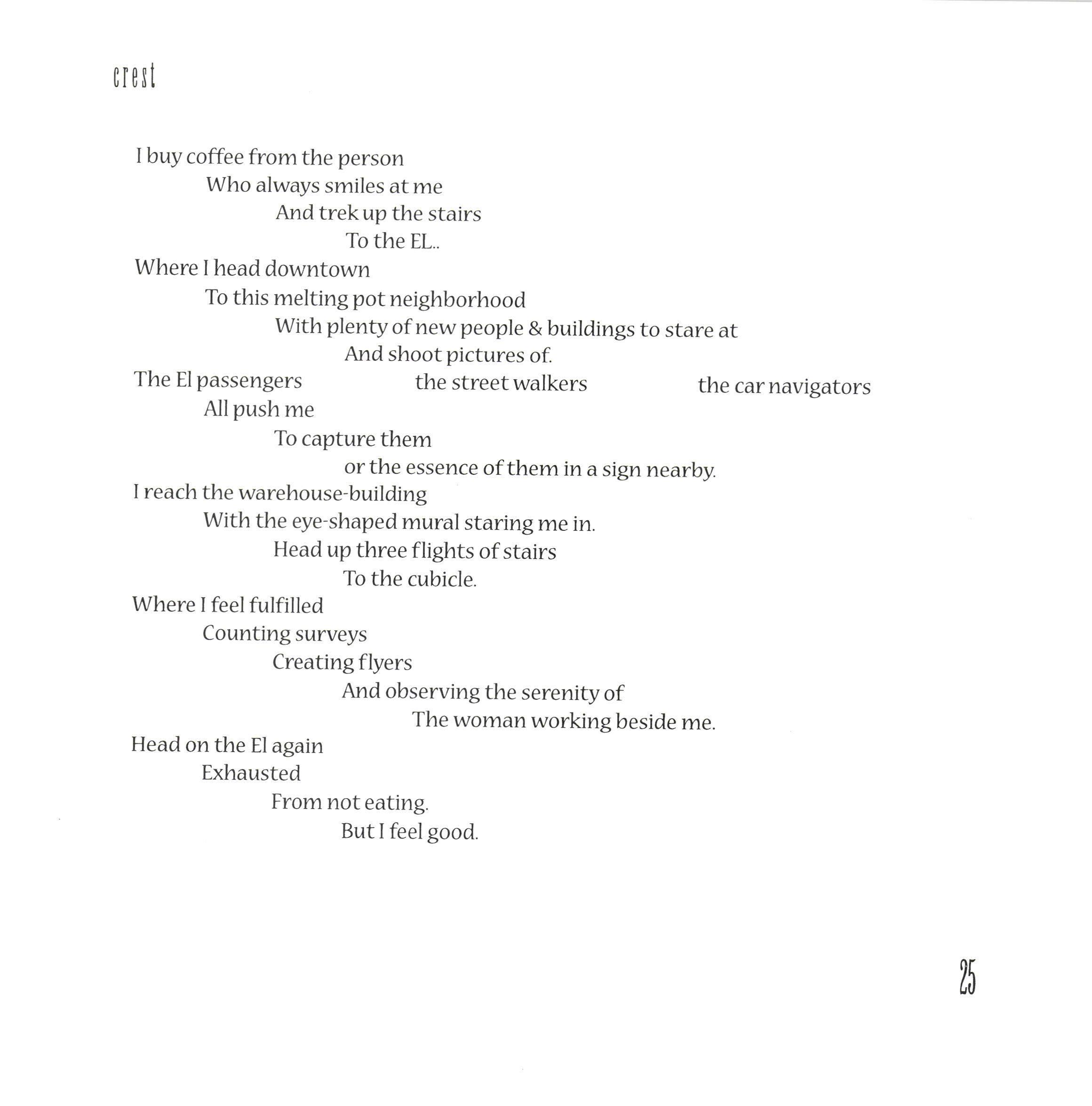 In our out of that studio revolved around her. How I ate, how I walked, what I wore, how I spoke. she gave me a piece of music and told me to make a dance forher. I danced to the scratched up record forhours Twirling, spinning over-and-over in my living room. My schoolwork neglected. Myfriends ignored. Onlyto go back, Shaking,hoping That shed like it, that it was good enough, And discovering shed forgotten.