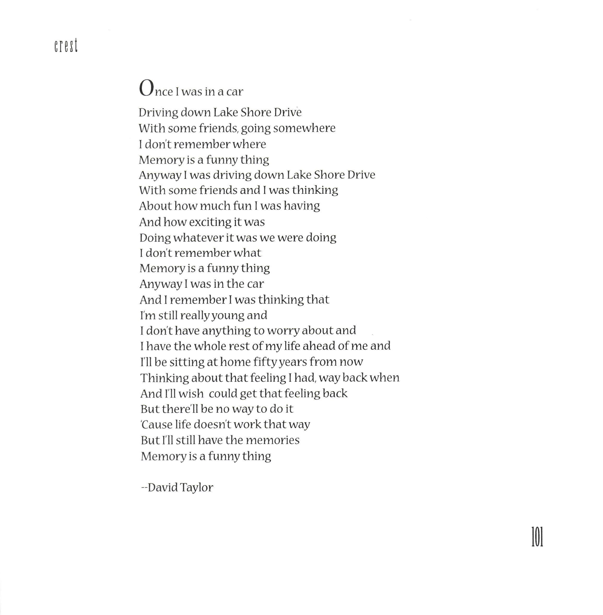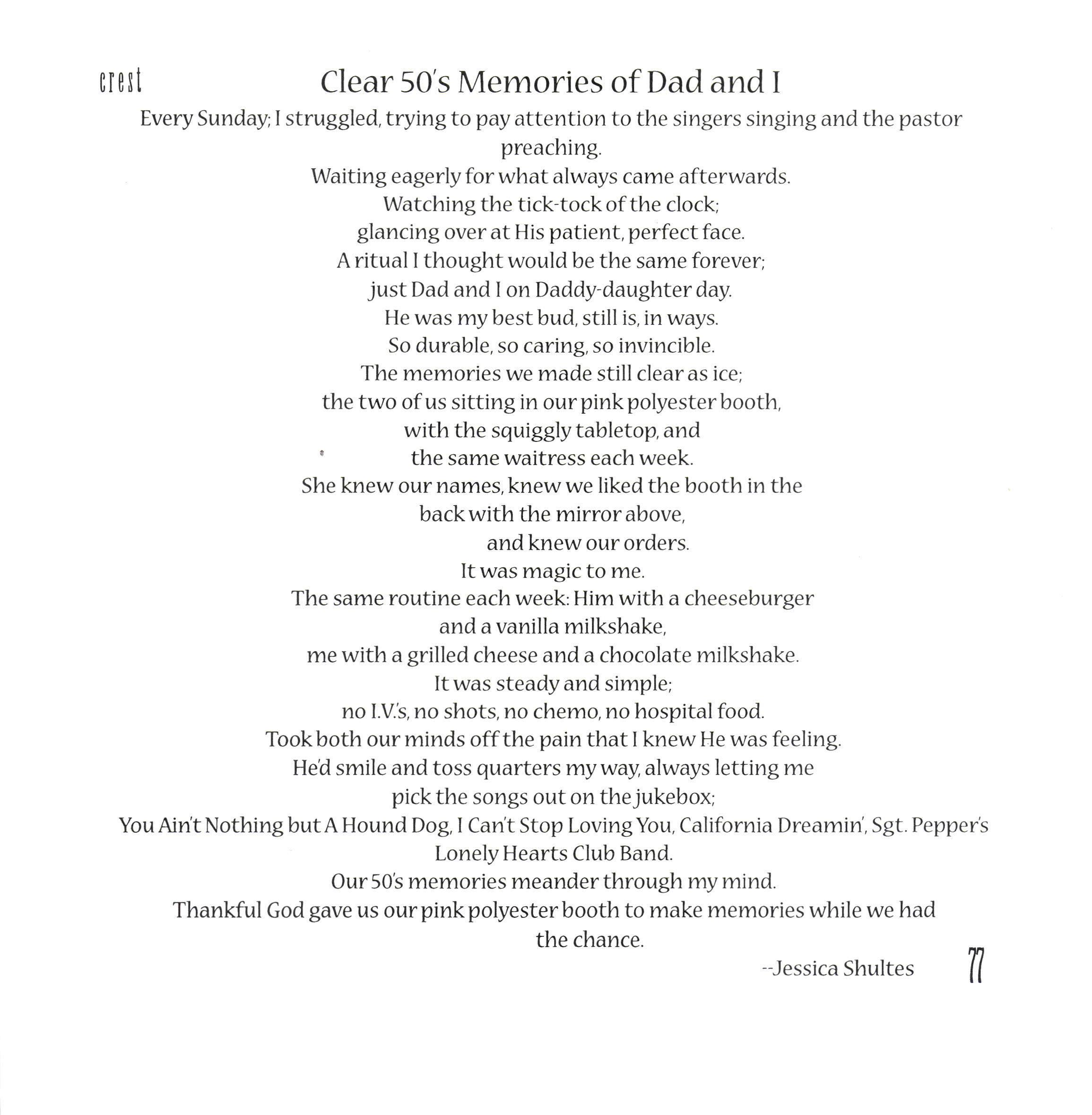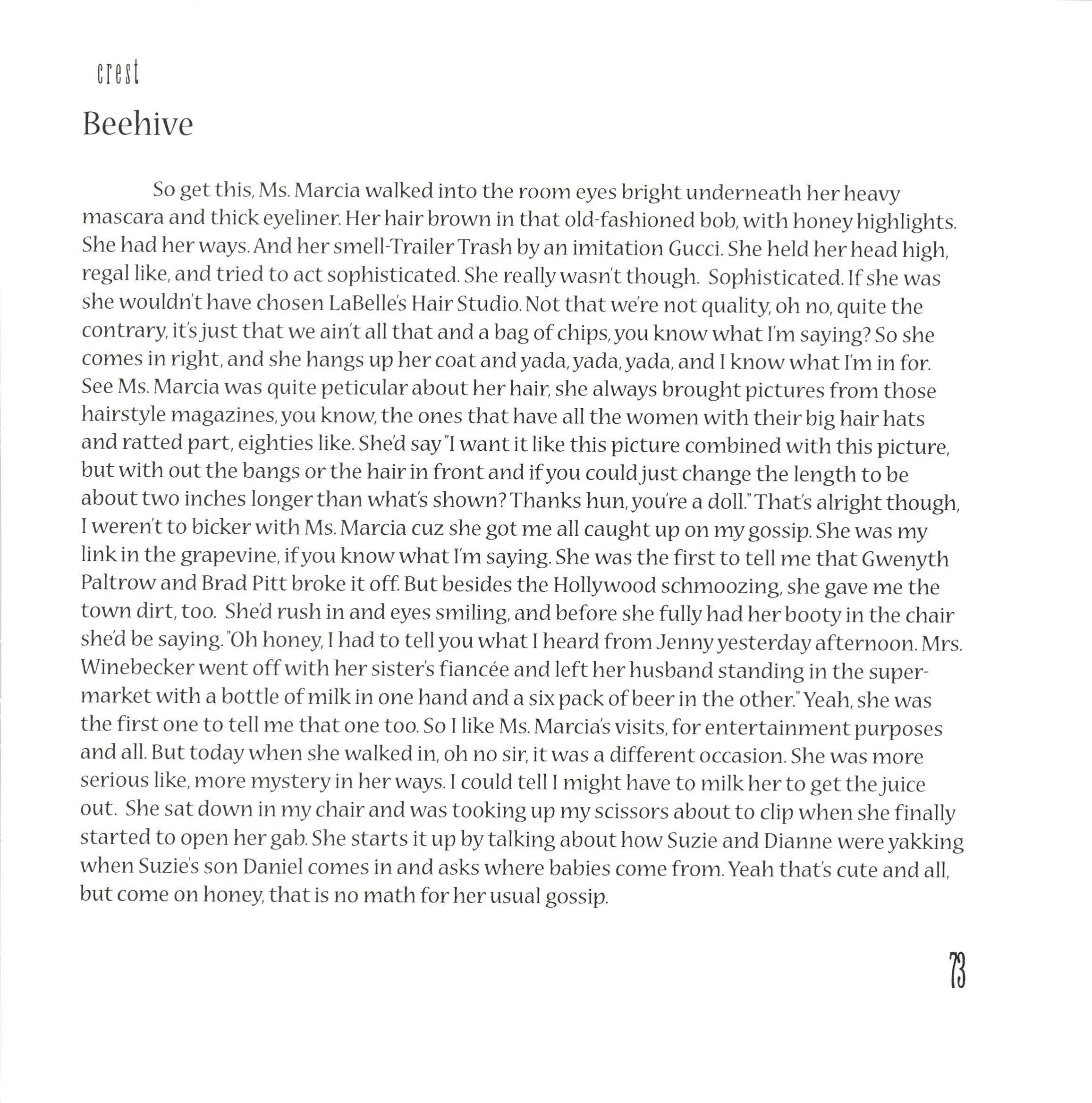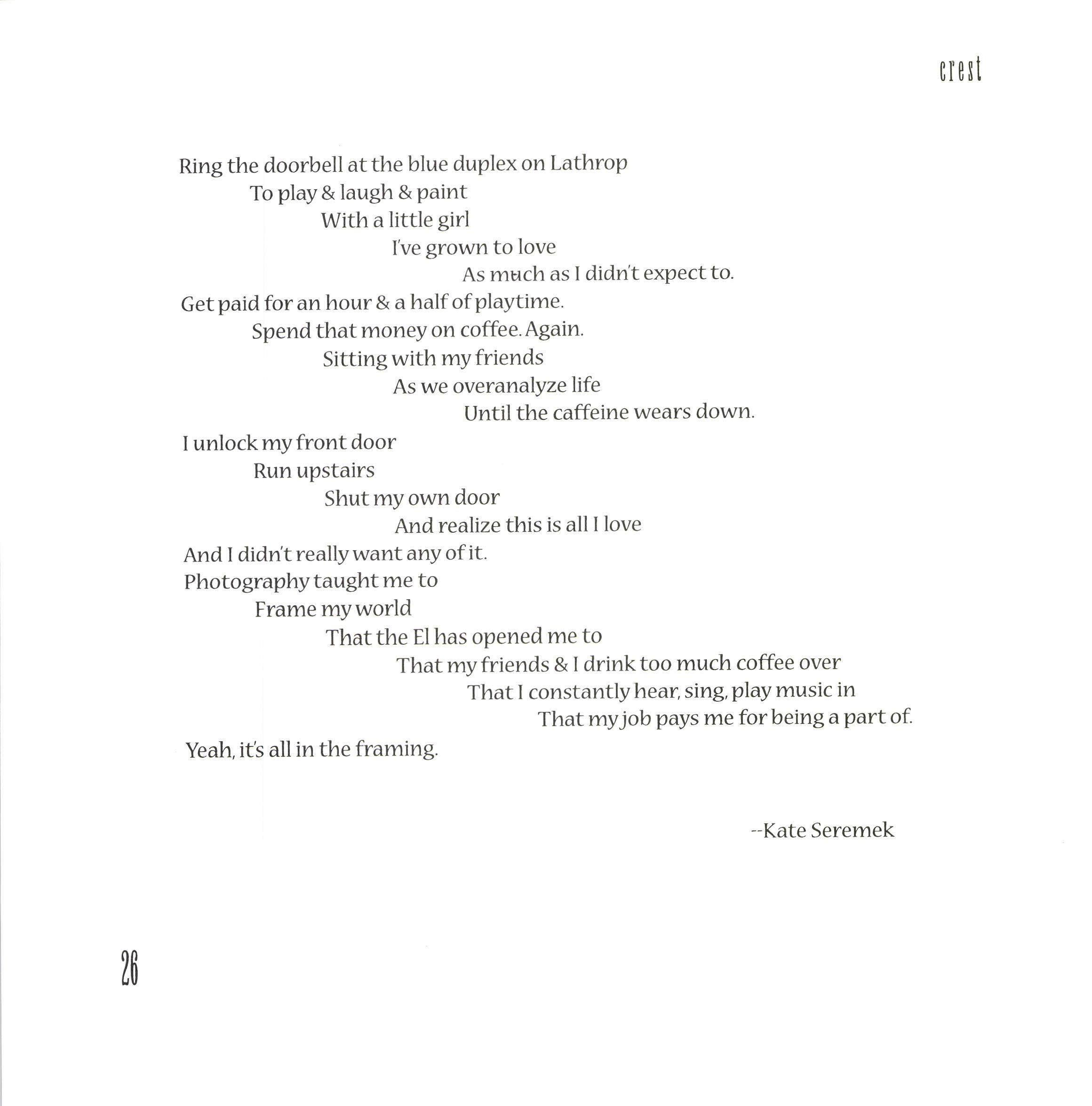 In our out of that studio revolved around her. How I ate, how I walked, what I wore, how I spoke. she gave me a piece of music and told me to make a dance forher. I danced to the scratched up record forhours Twirling, spinning over-and-over in my living room. My schoolwork neglected. Myfriends ignored. Onlyto go back, Shaking,hoping That shed like it, that it was good enough, And discovering shed forgotten.