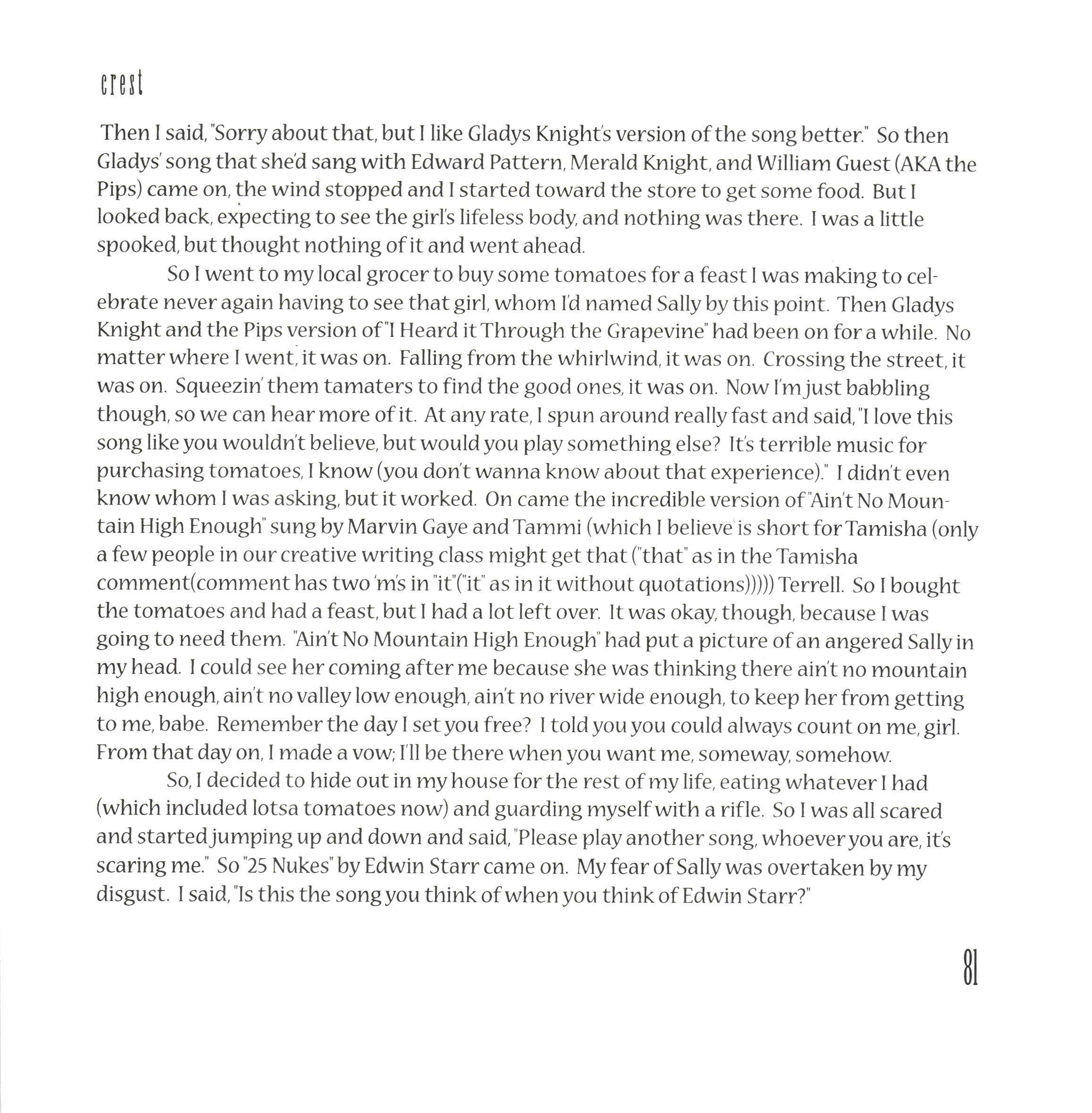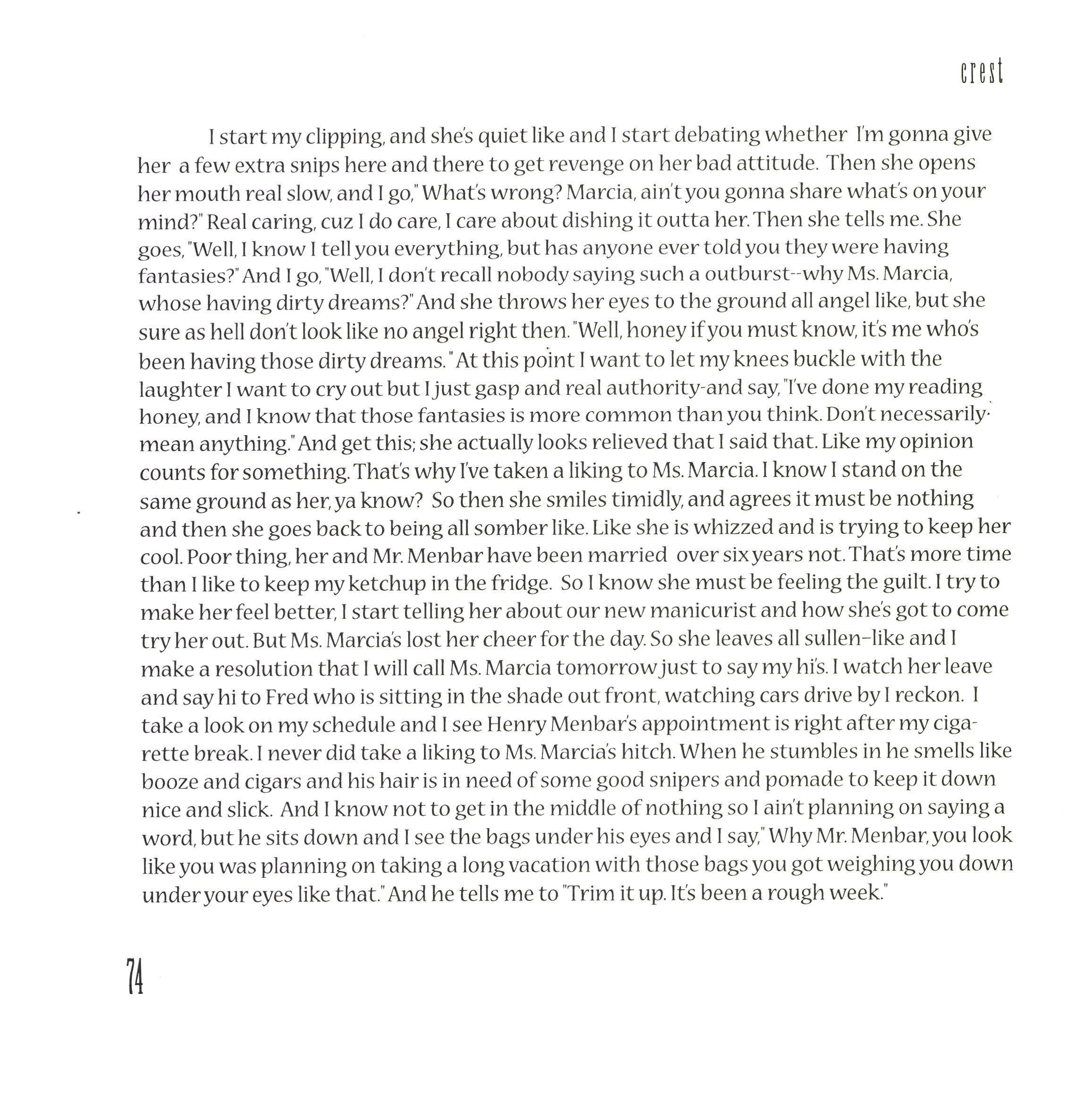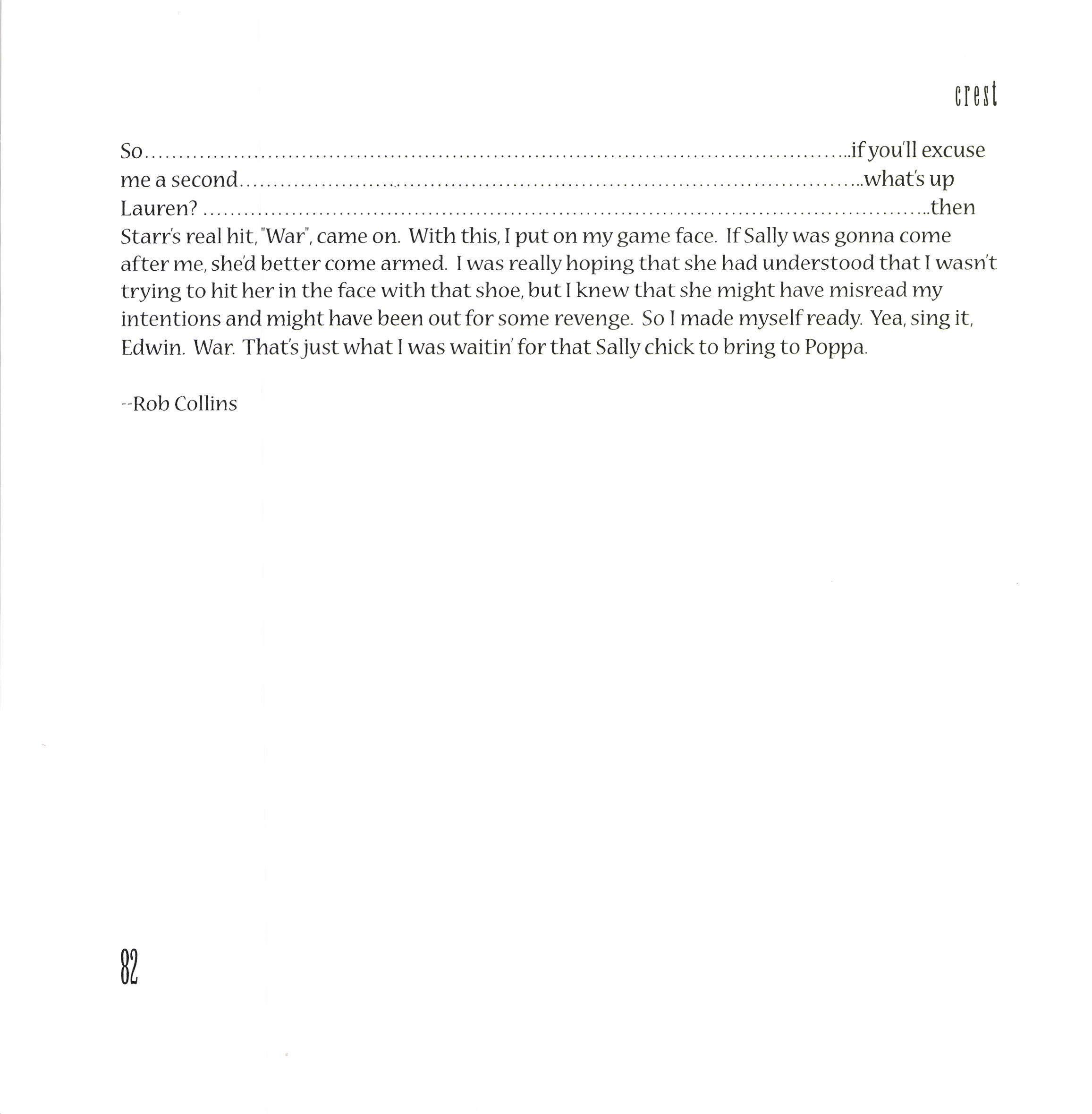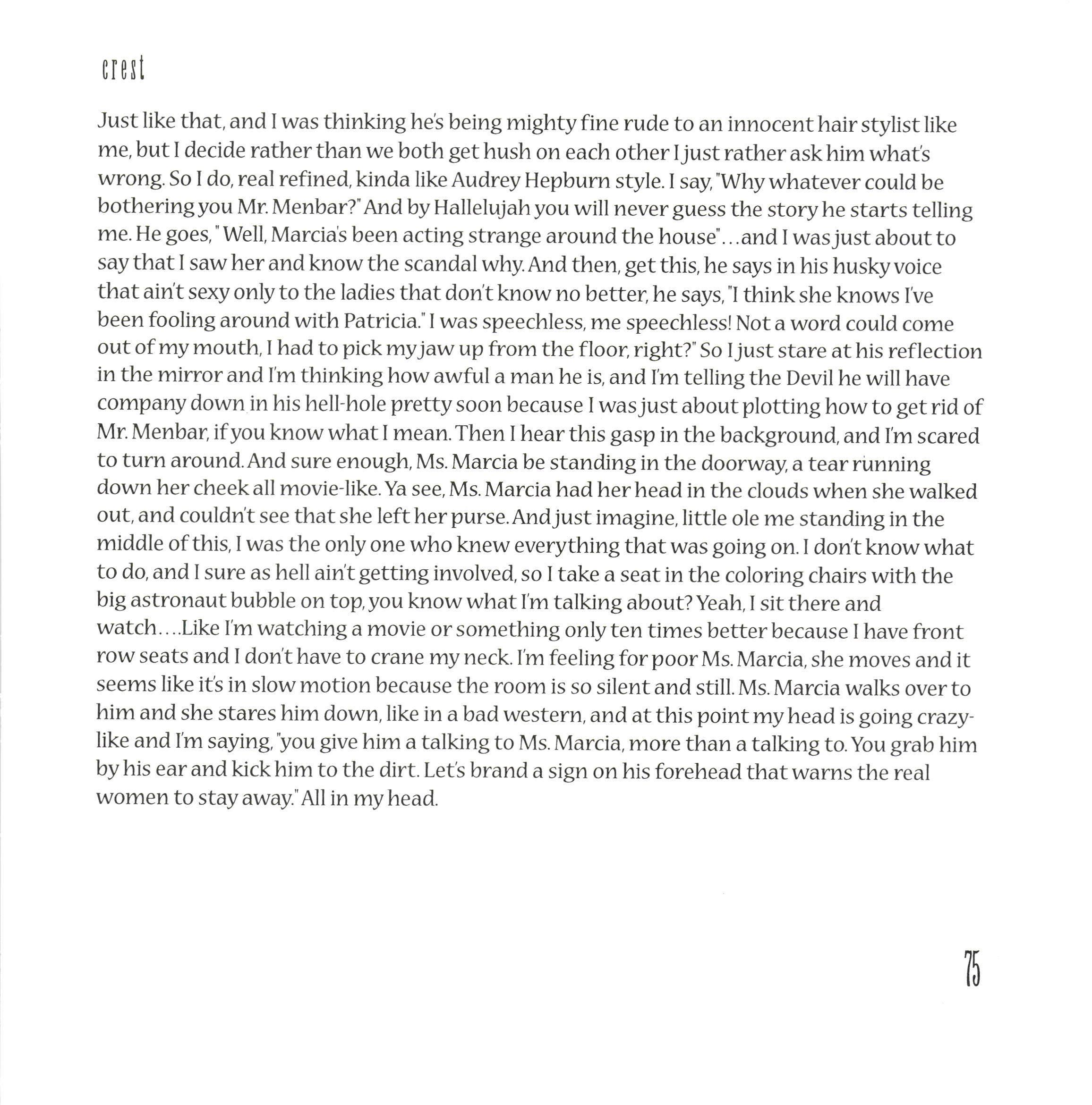 Three nights ago when all this happened I was at a low in my life. Living in a dark house, brown wallpaper and all. watching cheap porn and trying to get an idea to go on.'civilizations problems: drugs, violence, rape, murder, incest, GREED."' My publisher is a bitch of a man. Short, crooked beard with partially dyed black spots and a limp to add to his stutter. The only reason I hired him was for his connections. That brings me to GREED. This is such a heartfelt and discerning feeling. You see, as a result of my tumultuous writer's block and its bad timing, Chuck, my publisher, decided to send a few fellows around my way. His 'associates,'he might call them. Blatantly said, to beat a good novella out of me. Ifyou think about it, this is almost an impossible task,leading me to a point where I wouldjump out of windows to escape the two-fisted bandits charging up my stairs at three o'clockin the morning, in myhouse.l'm part of the BE BE BE BEAlgeneration and I dontknowwhyl have such problems with the unlawful.