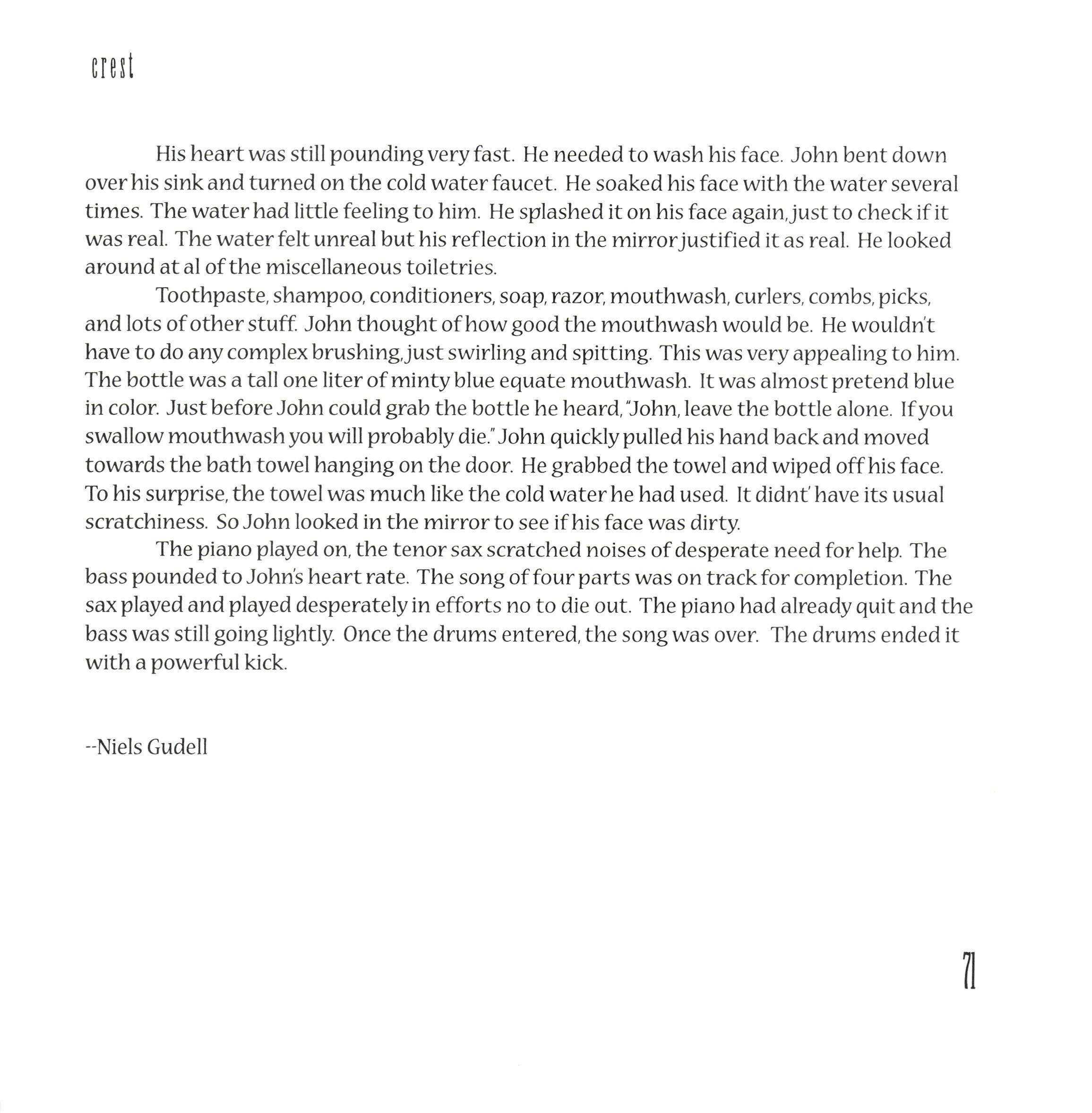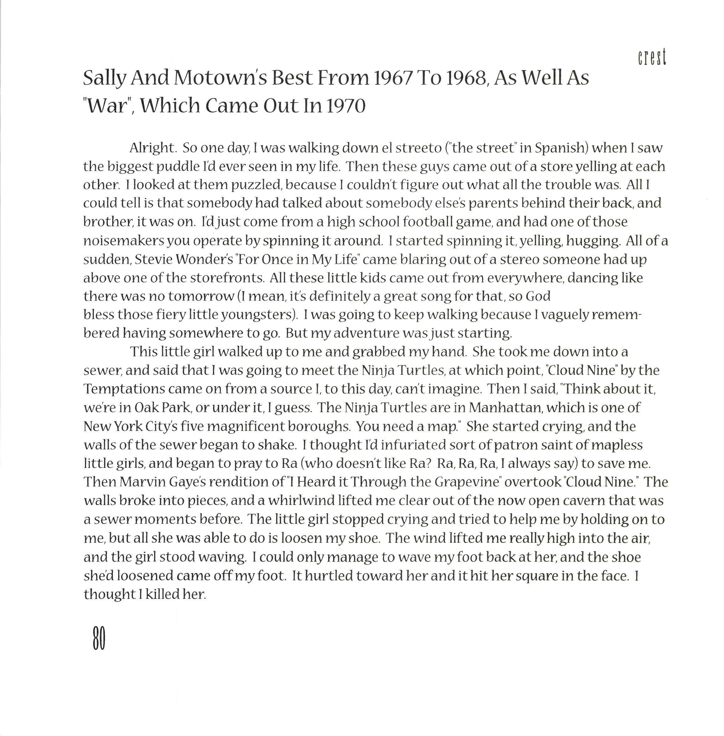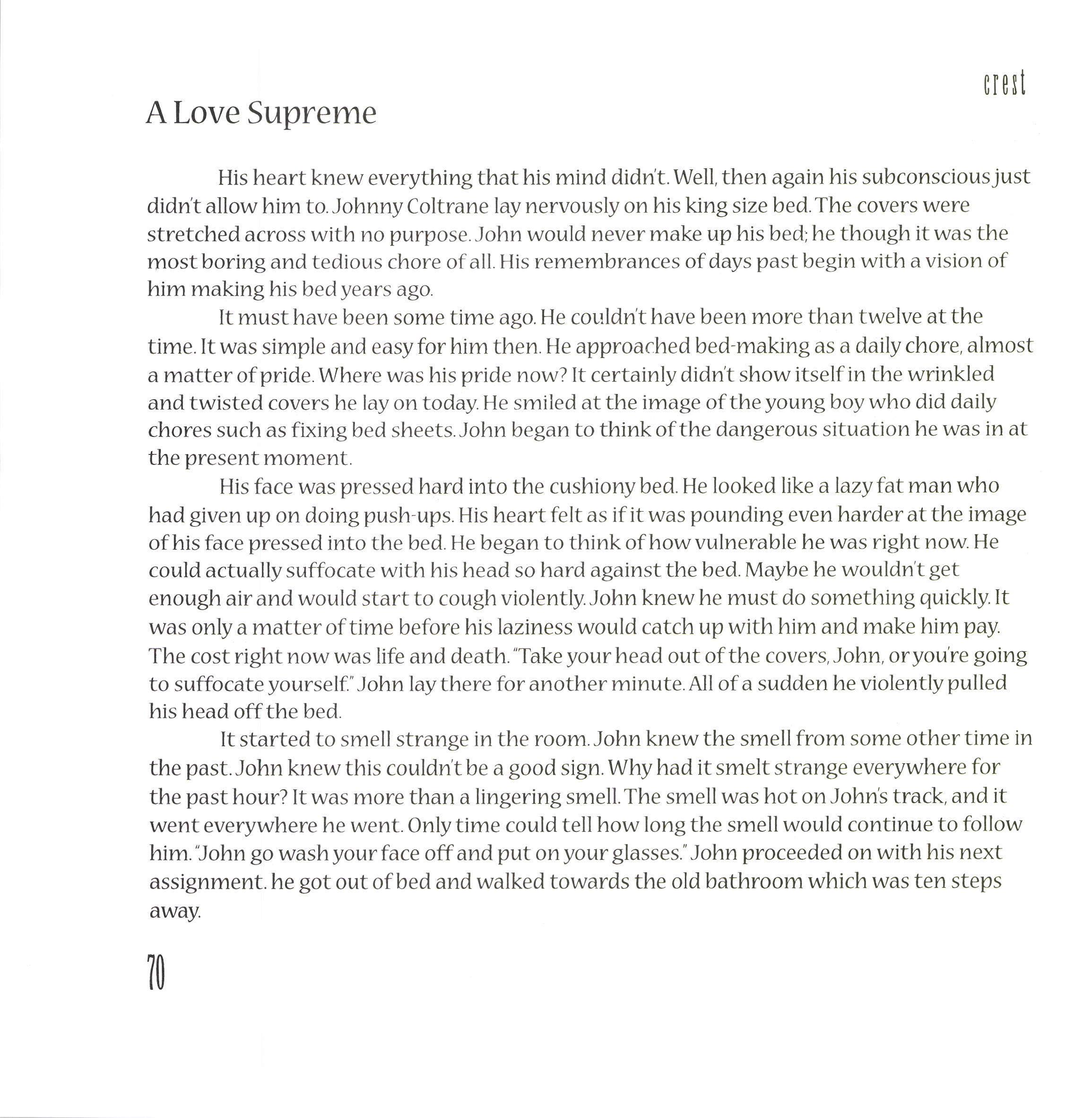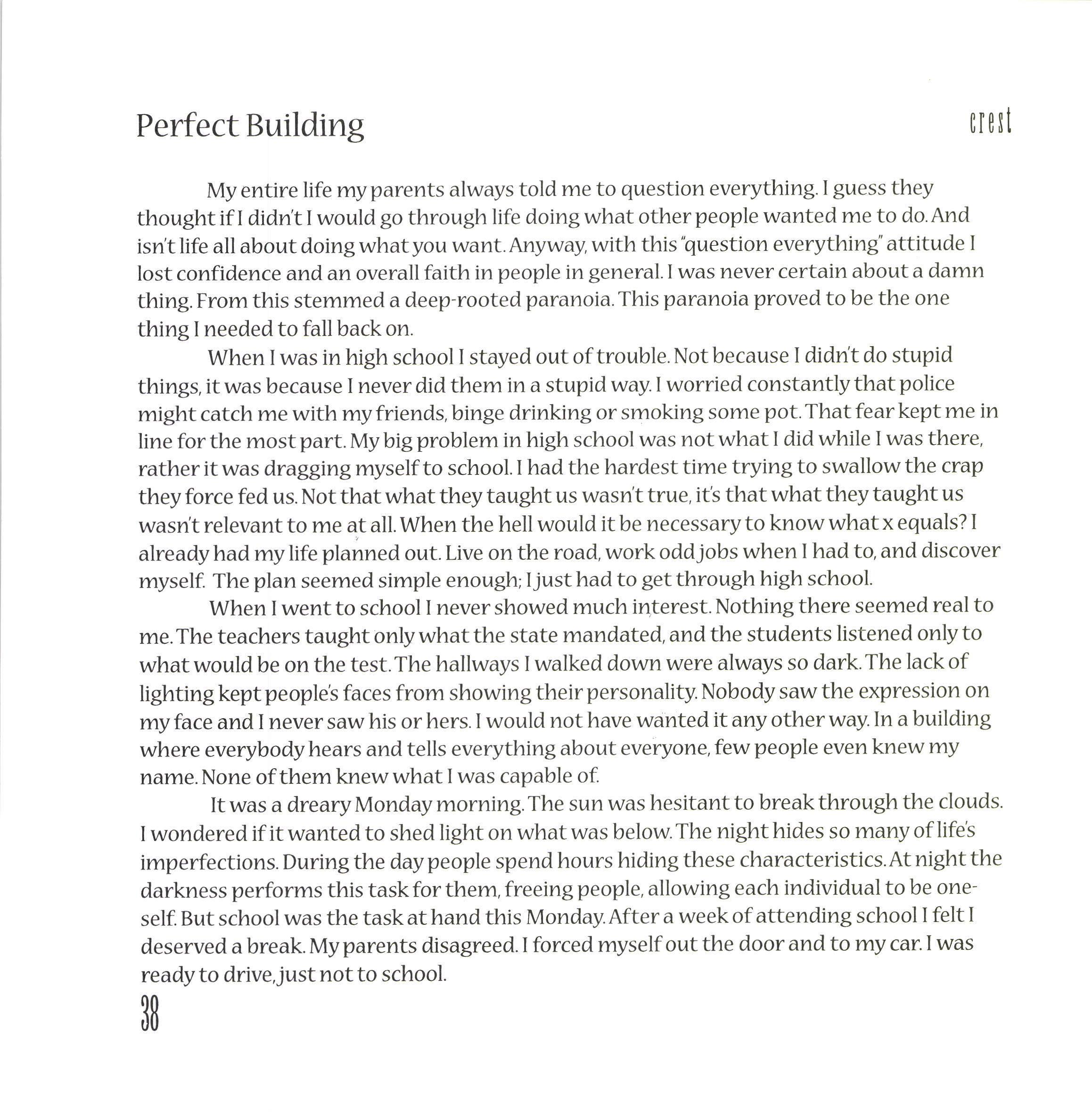 Three nights ago when all this happened I was at a low in my life. Living in a dark house, brown wallpaper and all. watching cheap porn and trying to get an idea to go on.'civilizations problems: drugs, violence, rape, murder, incest, GREED."' My publisher is a bitch of a man. Short, crooked beard with partially dyed black spots and a limp to add to his stutter. The only reason I hired him was for his connections. That brings me to GREED. This is such a heartfelt and discerning feeling. You see, as a result of my tumultuous writer's block and its bad timing, Chuck, my publisher, decided to send a few fellows around my way. His 'associates,'he might call them. Blatantly said, to beat a good novella out of me. Ifyou think about it, this is almost an impossible task,leading me to a point where I wouldjump out of windows to escape the two-fisted bandits charging up my stairs at three o'clockin the morning, in myhouse.l'm part of the BE BE BE BEAlgeneration and I dontknowwhyl have such problems with the unlawful.