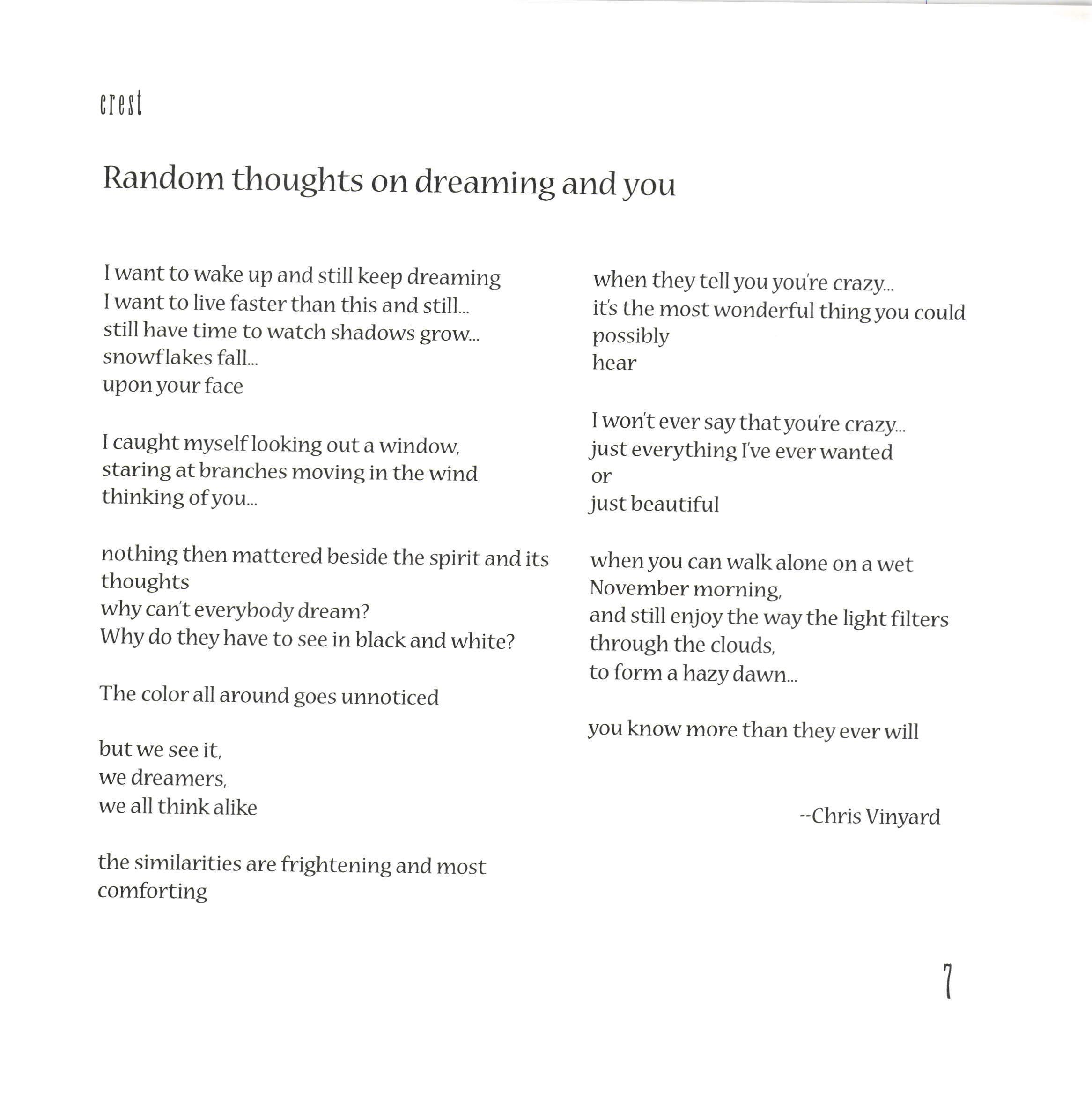I caught myself looking out a window staring atbranches moving in the wind thinking ofyou... nothing then mattered beside the spirit and its thoughts why cant everybody dream? Whydo theyhave to see in blackand white? The colorall around goes unnoticed butwe see it, we dreamers, we all thinkalike the similarities are frightening and most comforting