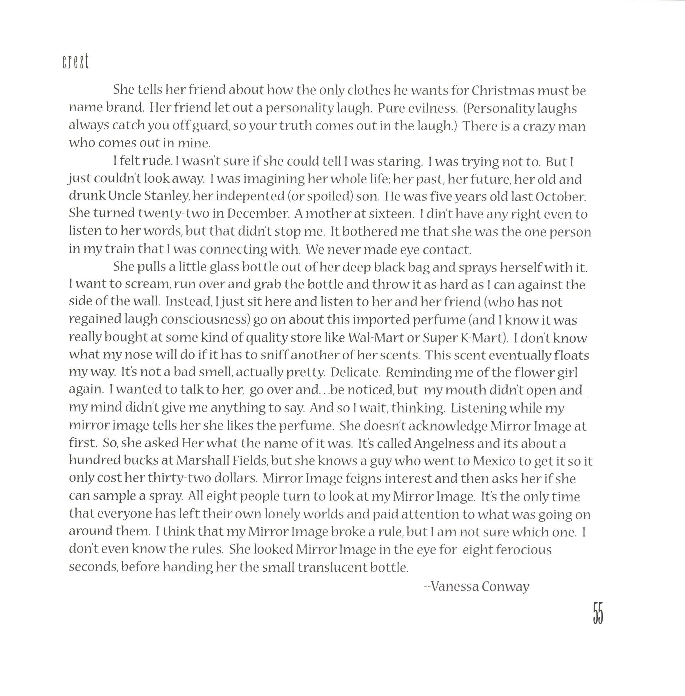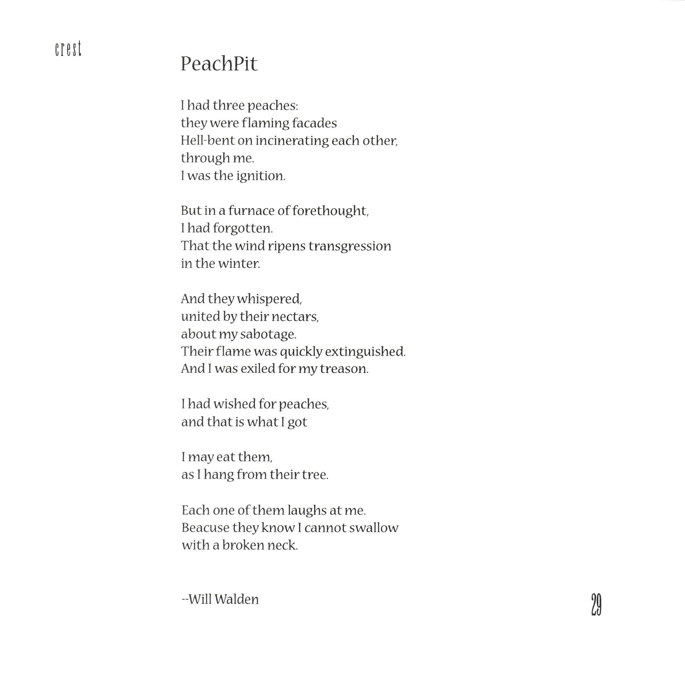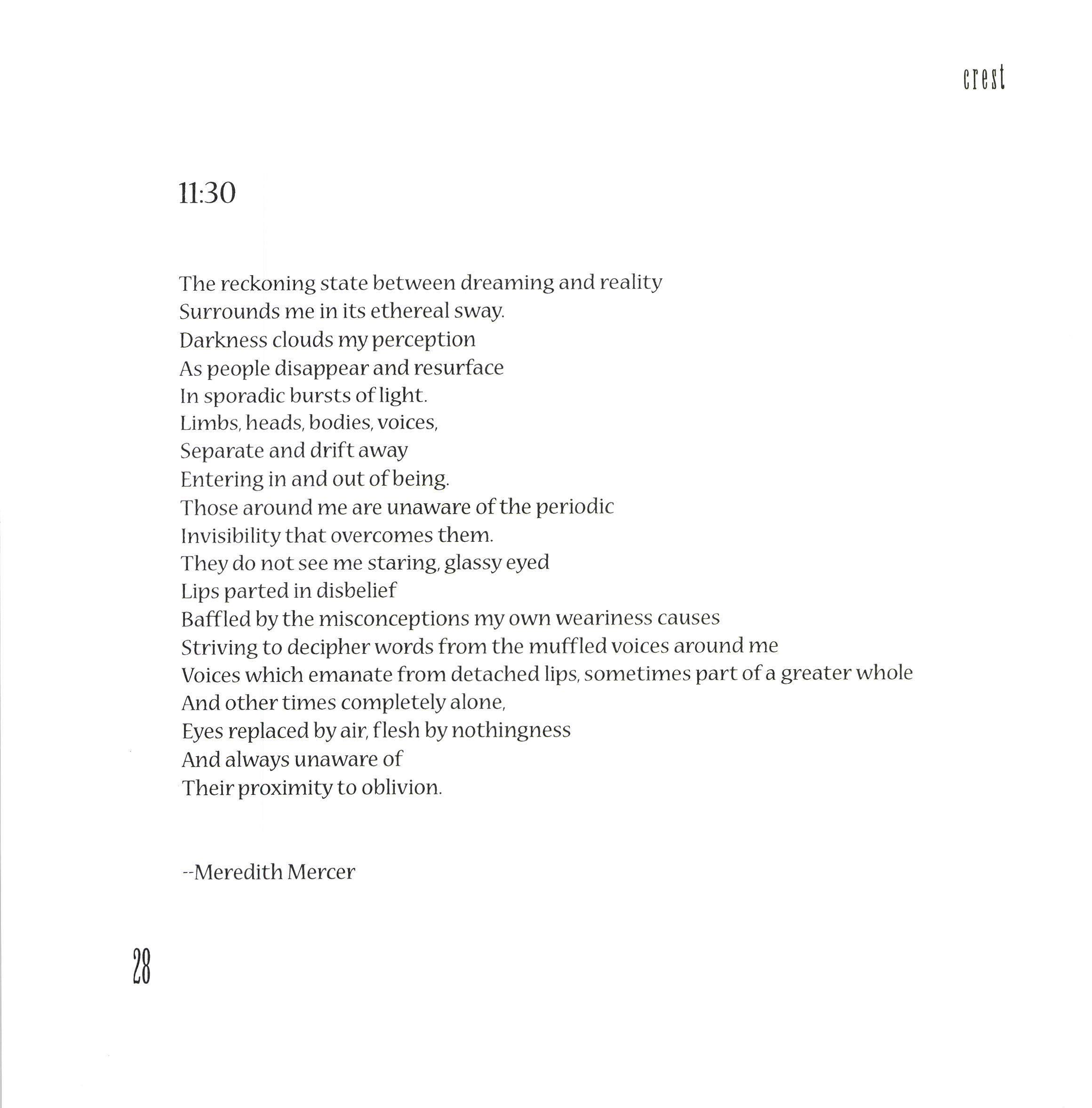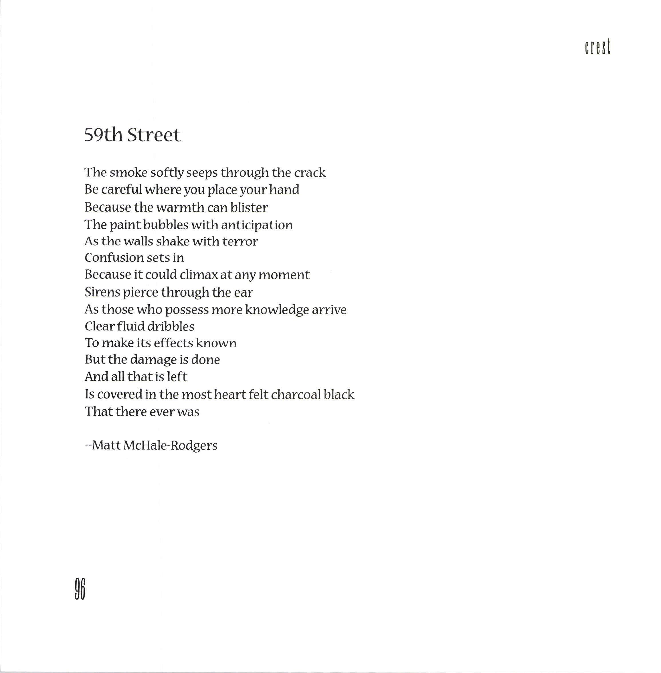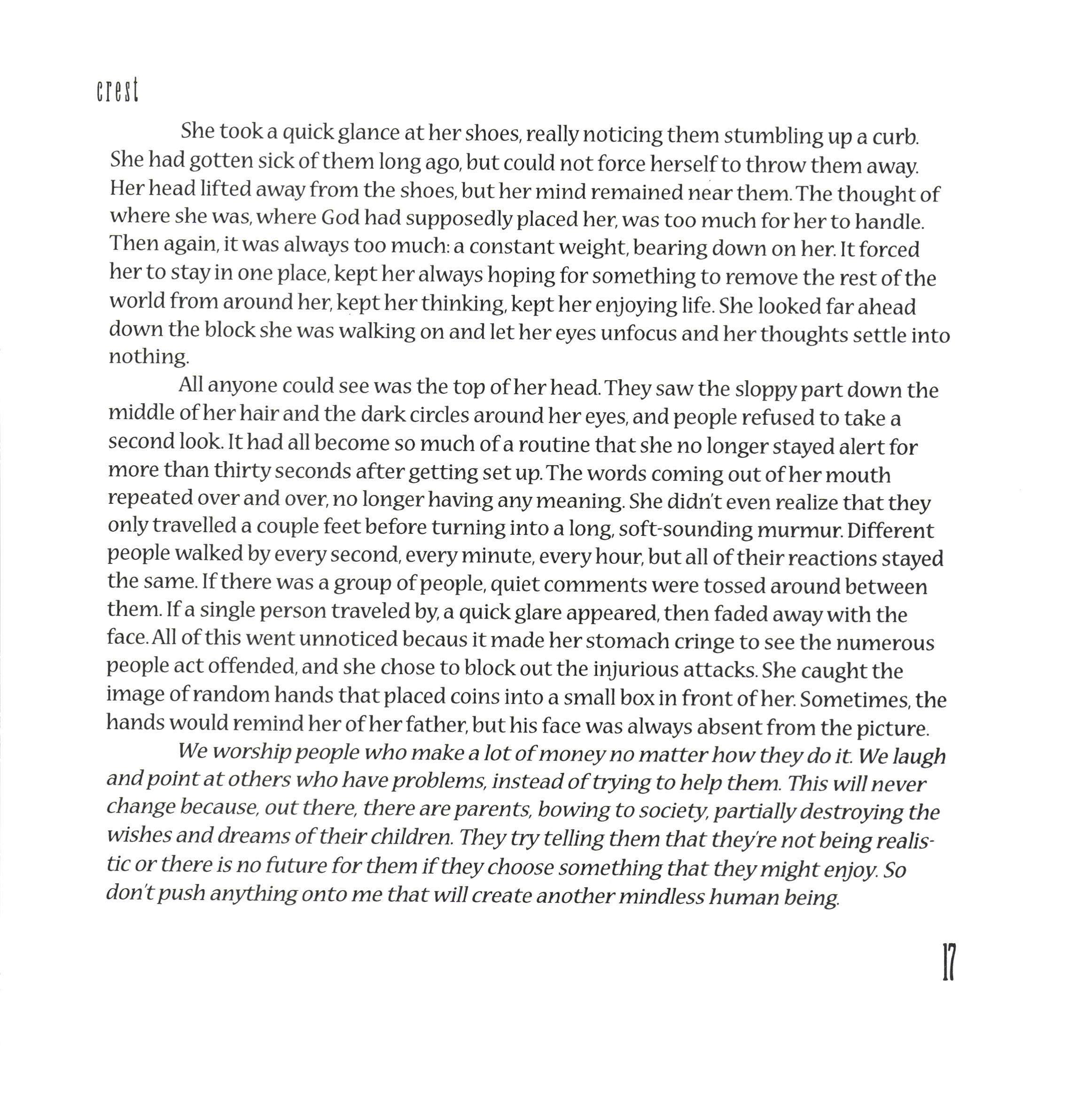 Away from fear, anxiety and trembling disgust. In myself I could feel the fear-rumbling, churning inside me. A last ditch effort at sanity. My surroundings were beginning to leave a mark; discolored and weak I lept. Breaking glass scarred my hands as I flew palms first, into the world.Through the window, out of reach of my fate.ltwas lined with darkgreen trim, reminding me of pea soup and how no one evereats itbecause of its smooth grainytexture on the roof ofyourmouth..