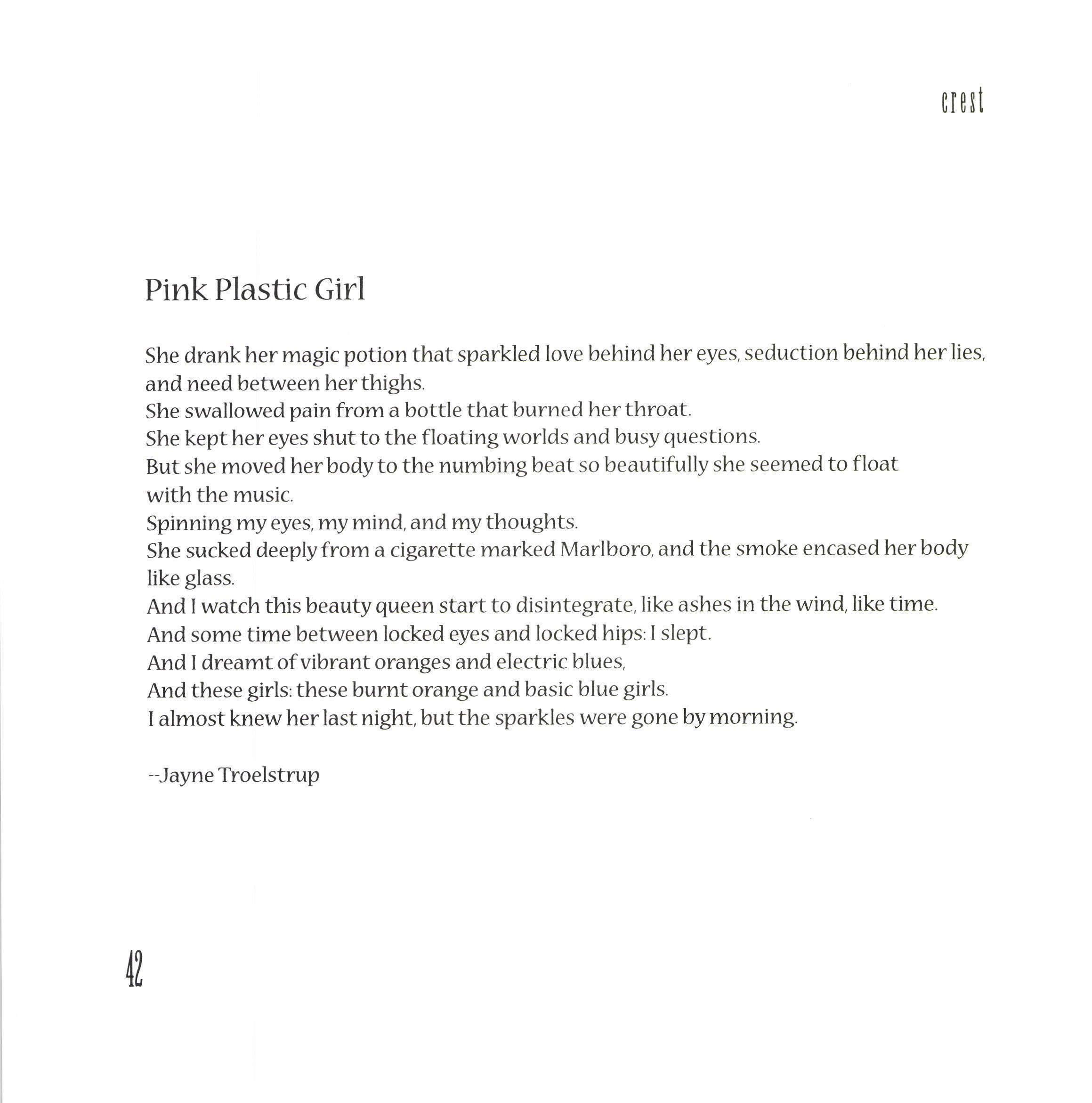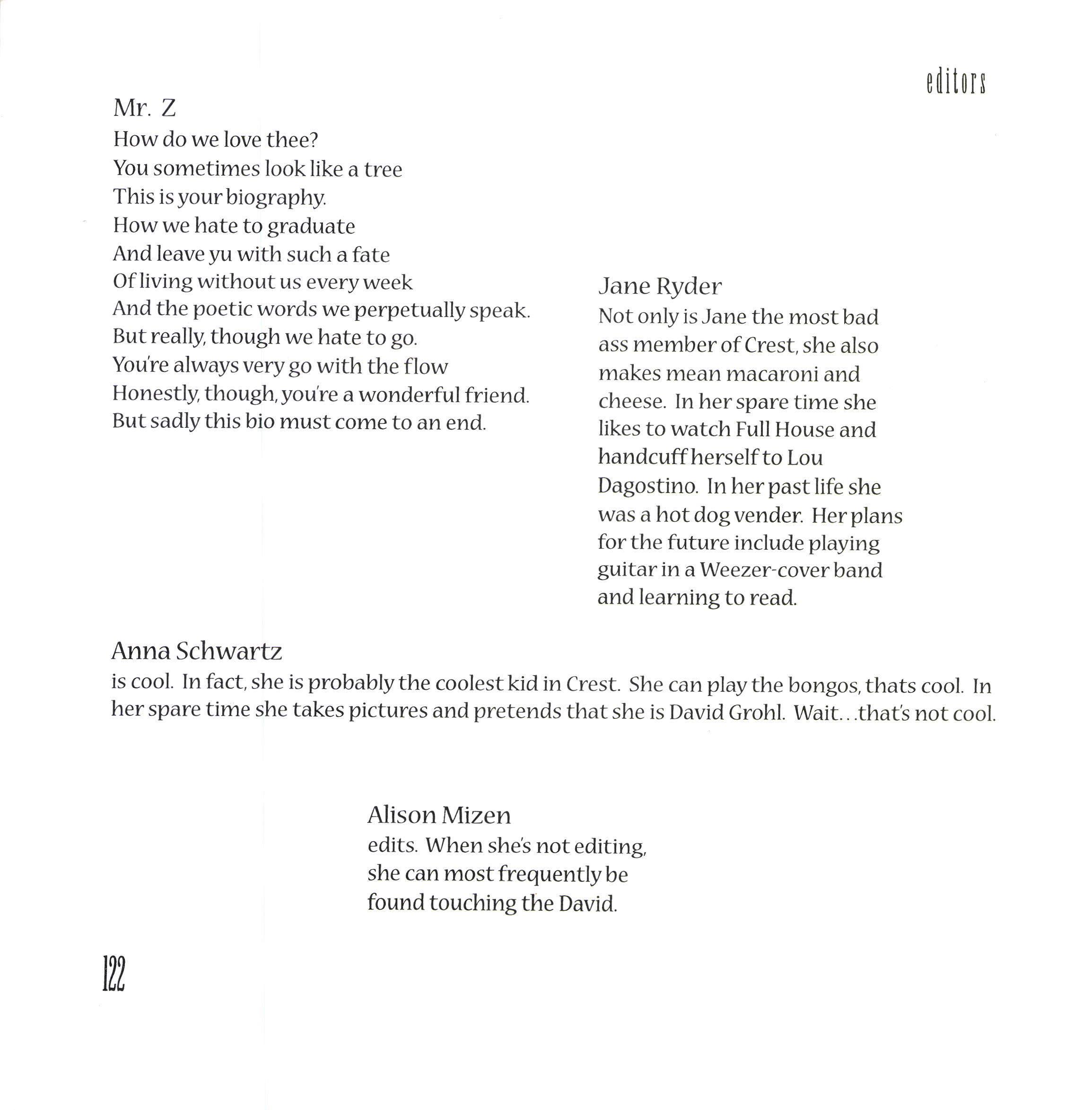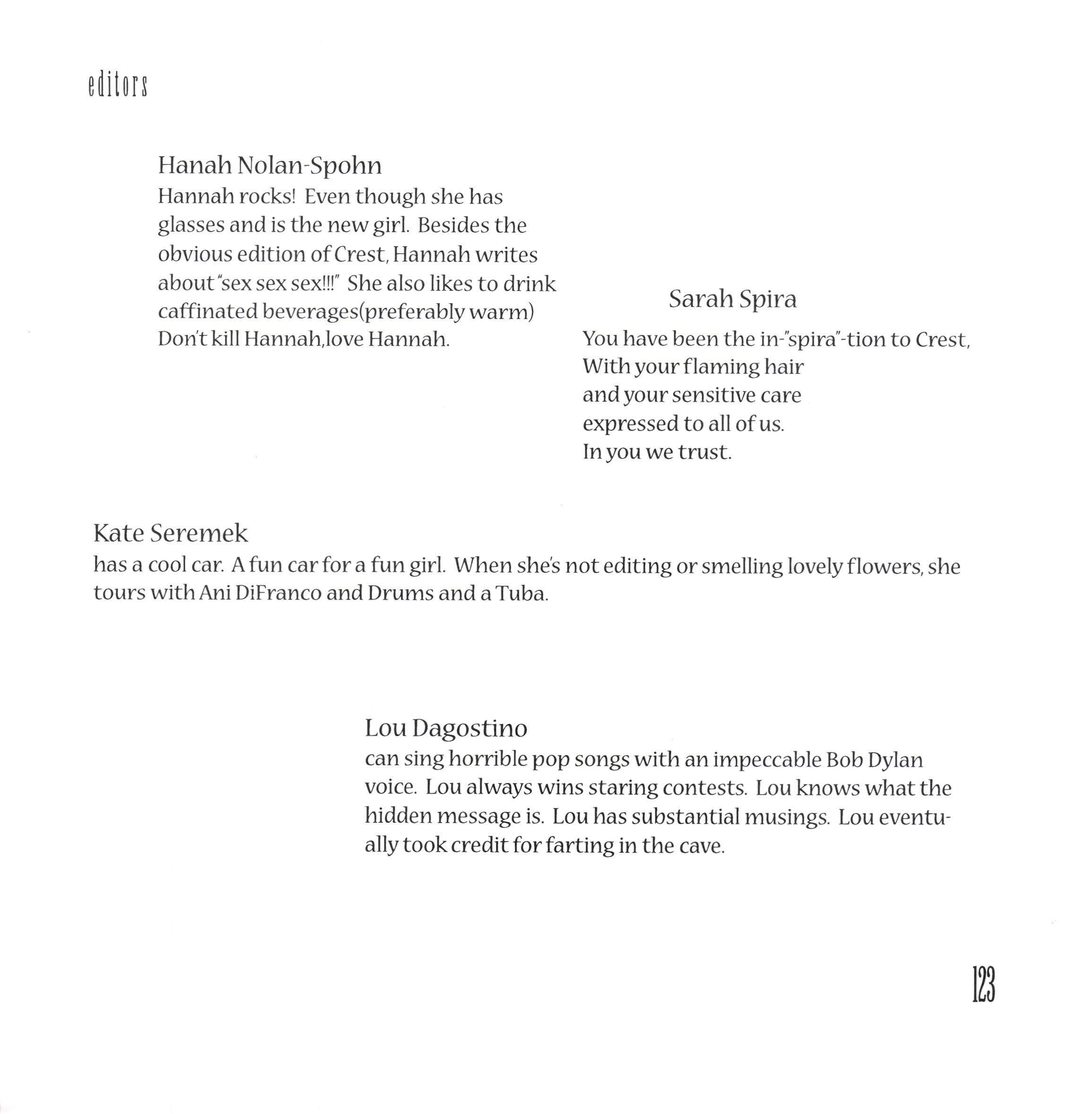 Not only is Jane the most bad ass member of Crest, she also makes mean macaroni and cheese. In her spare time she Iikes to watch Full House and handcuffherselfto Lou Dagostino. In herpast life she was a hot dogvender. Herplans forthe future include playing guitar in a W eezer- cover band and learning to read.
