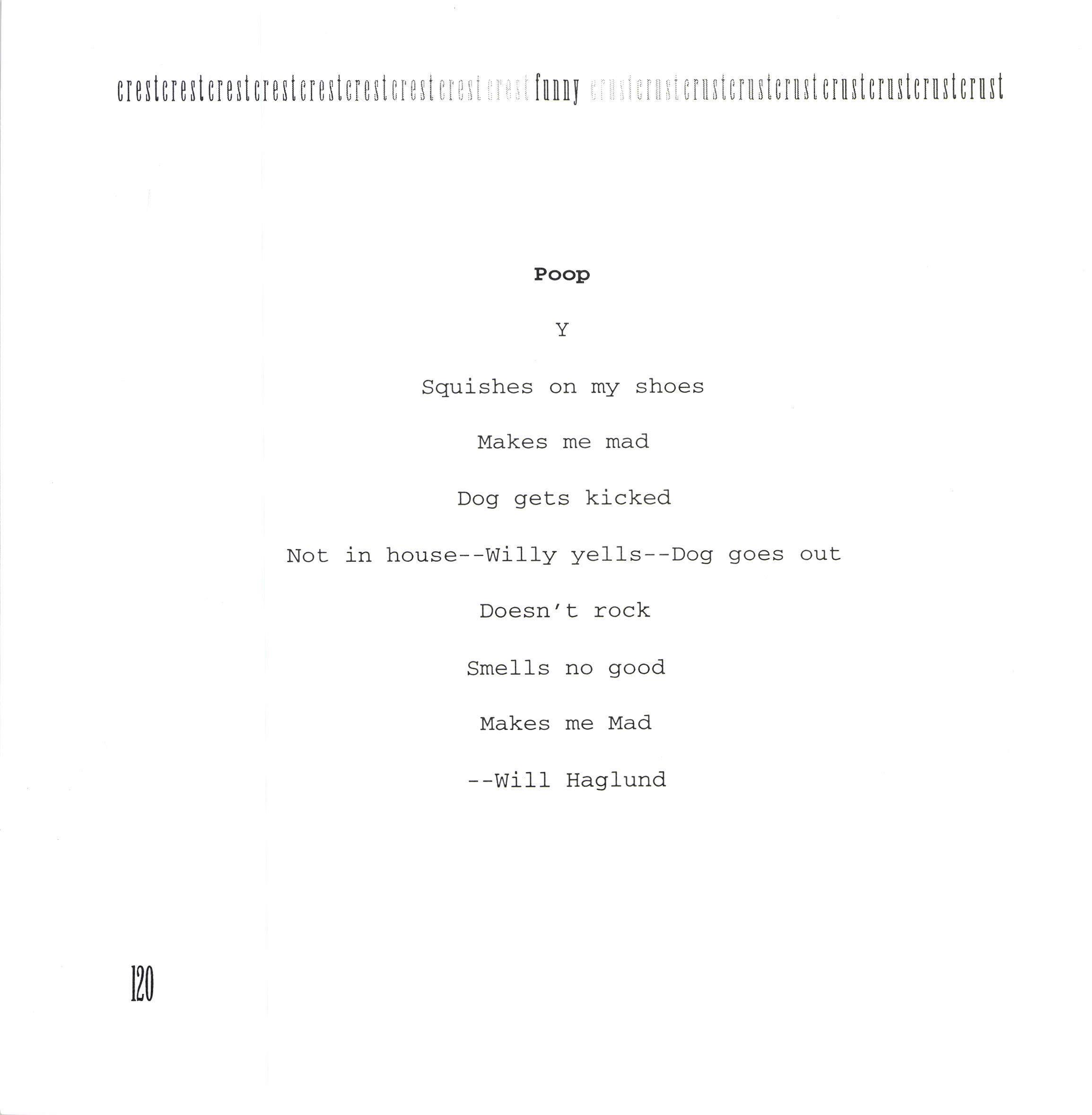 Sguishes on my shoes Makes me mad Dog gets kicked Not in house--Wi11y yel1s--Dog goes out Doesn't rock Smells no good Makes me Mad --Vfi11 Haglund