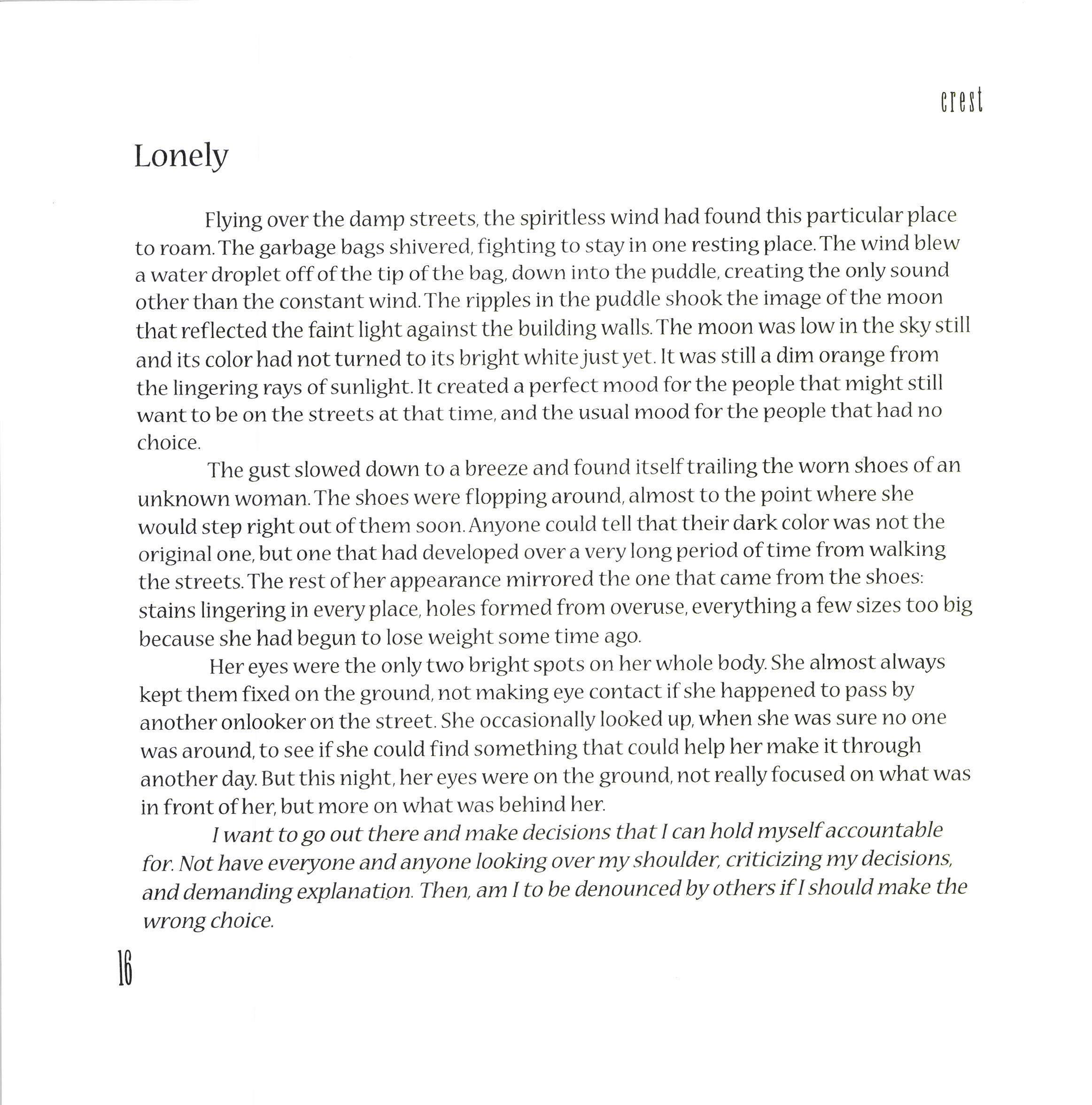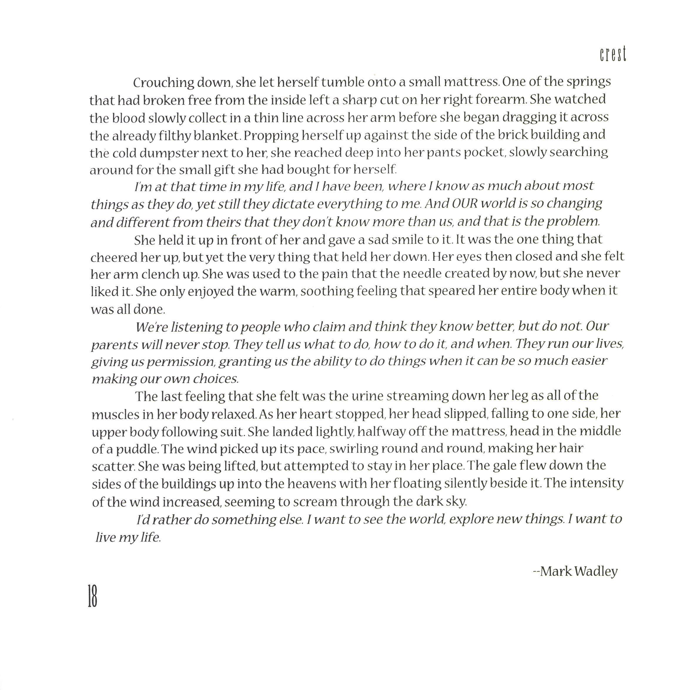The darkwalls around me ate at my confidence. Lined with a deep brown shade, theyplayed a dank, rigged tune on the situation.To the left sat a window.lt seemed to hold no purpose;through it I saw the courtyard.A rusty iron bench overhung by a halfdead willow.At one point it was probably a beautiful sight to behold. But now it was withered away and dry to the eyes.