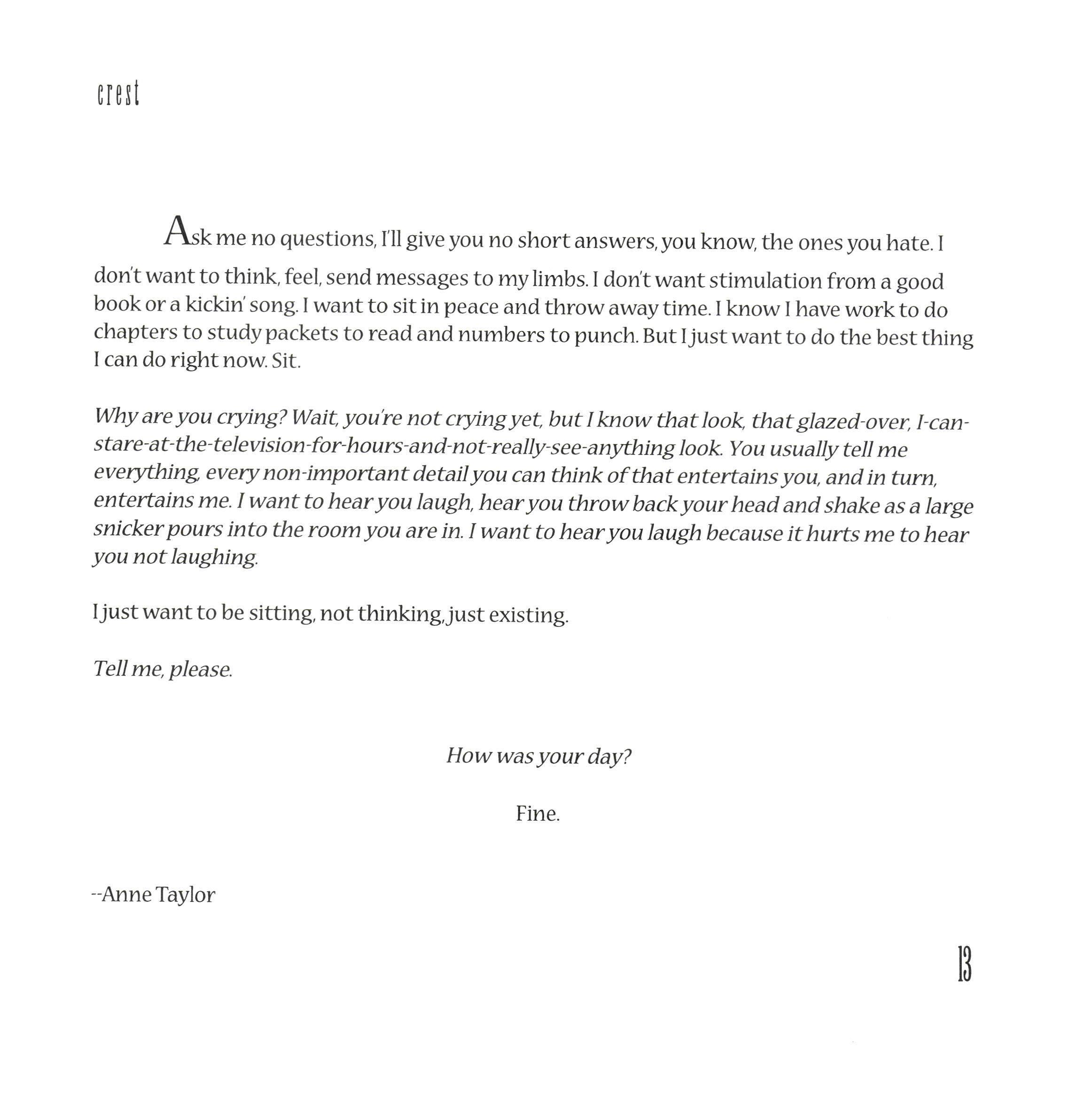 week and talked about 7 poems and_Bstories. Sometimes they even looked at-g-photographs and 10drawings. When they didnt have anything better to do, they ll-sang the -l2-theme songfrom l3-.Sometimes theyate 14and drank 6_.These the _18- Crest very much.